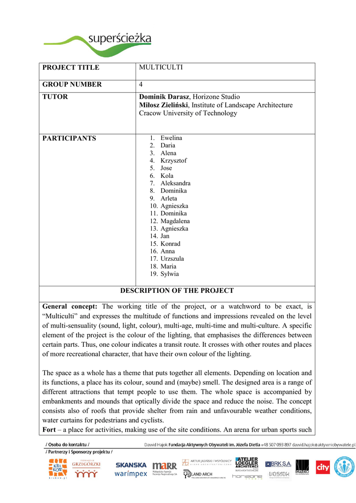 PROJECT TITLE MULTICULTI GROUP NUMBER 4 TUTOR Dominik Darasz, Horizone Studio Miłosz Zieliński, Institute of Landscape Architecture Cracow University of Technology PARTICIPANTS 1. 2. 3. 4. 5. 6. 7. 8. 9. 10. 11. 12. 13. 14. 15. 16. 17. 18. 19. Ewelina Daria Alena Krzysztof Jose Kola Aleksandra Dominika Arleta Agnieszka Dominika Magdalena Agnieszka Jan Konrad Anna Urzszula Maria Sylwia DESCRIPTION OF THE PROJECT General concept: The working title of the project, or a watchword to be exact, is “Multiculti” and expresses the multitude of functions and impressions revealed on the level of multi-sensuality (sound, light, colour), multi-age, multi-time and multi-culture. A specific element of the project is the colour of the lighting, that emphasises the differences between certain parts. Thus, one colour indicates a transit route. It crosses with other routes and places of more recreational character, that have their own colour of the lighting. The space as a whole has a theme that puts together all elements. Depending on location and its functions, a place has its colour, sound and (maybe) smell. The designed area is a range of different attractions that tempt people to use them. The whole space is accompanied by embankments and mounds that optically divide the space and reduce the noise. The concept consists also of roofs that provide shelter from rain and unfavourable weather conditions, water curtains for pedestrians and cyclists. Fort – a place for activities, making use of the site conditions. An arena for urban sports such as parkour or skateboarding. The slope gives the opportunity to arrange a place for spectators who can watch the sportsmen. Eile square – relaxation and recreation zone, rather quiet, with a lot of functions: playground, drinking fountain, regular fountain. The space is closed on one side by a pavilion with toilets, a café (small catering outlet) and a vegetable stall. It can also serve the function of a shelter and a waiting room where people could prepare their visits to the nearby courts. The area has a place where we can charge a phone and use WiFi. Car park area – restricting the width of one lane of Powstania Warszawskiego avenue and creating two zones of slow traffic (50 and 30 kmph) along the car park. In the place where we go through Sądowa street to Powstania Warszawskiego avenue, the traffic scheme should change. Creating a tram and bus stop in this place should restrict the traffic because many people would change their cars into public transport that would take them right to the doors of the office. It will also allow to change the lane into a two-way bicycle lane. Moreover, on the recovered area we can arrange a walking path and an area of calm traffic. Instead of the car parks, we suggest separating the pedestrian zone with slightly higher embankments or multifunctional mounds (then, we can arrange land-art or seats, which is favourable in terms of the proximity of the offices). The mounds and embankments could also serve functions for the offices, e.g. having places where we can file our applications, even by car (drive-in office). KSOS – Krakowski Szkolny Ośrodek Sportowy (Cracow School Sports Centre) – a sports and recreation area, zoned in terms of functions, closed by a low fence (e.g. 110 cm) with a belt of hollies. Partly, a permanently enclosed area around KSOS. A lot of lighting so after dark it is also safe. Open-air gym, multi-functional, public pitch, a zone for the elderly. Sensory garden and a zone for children. The area in front of the Marshal’s Office – a representative zone with a strong element, e.g. a very tall fountain. A definite indication of the beginning of Superścieżka and clearly separated pedestrian and bicycle traffic.