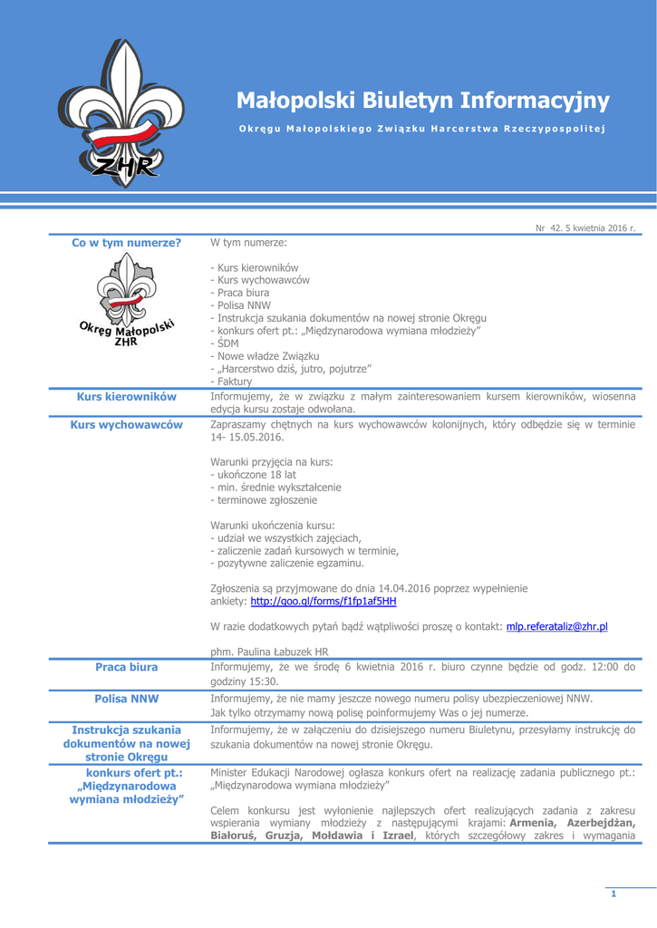 Małopolski Biuletyn Informacyjny Okręgu Małopolskiego Związku Harcerstwa Rzeczypospolitej Nr 42. 5 kwietnia 2016 r. Co w tym numerze? Kurs kierowników Kurs wychowawców W tym numerze: - Kurs kierowników - Kurs wychowawców - Praca biura - Polisa NNW - Instrukcja szukania dokumentów na nowej stronie Okręgu - konkurs ofert pt.: „Międzynarodowa wymiana młodzieży” - ŚDM - Nowe władze Związku - „Harcerstwo dziś, jutro, pojutrze” - Faktury Informujemy, że w związku z małym zainteresowaniem kursem kierowników, wiosenna edycja kursu zostaje odwołana. Zapraszamy chętnych na kurs wychowawców kolonijnych, który odbędzie się w terminie 14- 15.05.2016. Warunki przyjęcia na kurs: - ukończone 18 lat - min. średnie wykształcenie - terminowe zgłoszenie Warunki ukończenia kursu: - udział we wszystkich zajęciach, - zaliczenie zadań kursowych w terminie, - pozytywne zaliczenie egzaminu. Zgłoszenia są przyjmowane do dnia 14.04.2016 poprzez wypełnienie ankiety: http://goo.gl/forms/f1fp1af5HH W razie dodatkowych pytań bądź wątpliwości proszę o kontakt: [email protected] Praca biura Polisa NNW Instrukcja szukania dokumentów na nowej stronie Okręgu konkurs ofert pt.: „Międzynarodowa wymiana młodzieży” phm. Paulina Łabuzek HR Informujemy, że we środę 6 kwietnia 2016 r. biuro czynne będzie od godz. 12:00 do godziny 15:30. Informujemy, że nie mamy jeszcze nowego numeru polisy ubezpieczeniowej NNW. Jak tylko otrzymamy nową polisę poinformujemy Was o jej numerze. Informujemy, że w załączeniu do dzisiejszego numeru Biuletynu, przesyłamy instrukcję do szukania dokumentów na nowej stronie Okręgu. Minister Edukacji Narodowej ogłasza konkurs ofert na realizację zadania publicznego pt.: „Międzynarodowa wymiana młodzieży” Celem konkursu jest wyłonienie najlepszych ofert realizujących zadania z zakresu wspierania wymiany młodzieży z następującymi krajami: Armenia, Azerbejdżan, Białoruś, Gruzja, Mołdawia i Izrael, których szczegółowy zakres i wymagania 1 organizacyjne znajdują się w Regulaminie stanowiącym załącznik nr 1 do ogłoszenia. Regulamin przesyłam w załączniku. Ostatecznym beneficjentem konkursu jest młodzież polskich szkół gimnazjalnych i ponadgimnazjalnych oraz ich rówieśnicy z krajów partnerskich. Termin realizacji zadania upływa w dniu 15 grudnia 2016 r. Jako ZHR możemy złożyć jeden wniosek, dlatego zainteresowane osoby proszę o kontakt do piątku 8 kwietnia. ŚDM Serdecznie pozdrawiam Wojciech Stanek Wydział Finansowy ZHR - Dotacje tel. 022-629 12 39 [email protected] Druhny! Druhowie! Chociaż zgłoszeń na Zlot przybywa z dnia na dzień, to nadal jest nas za mało! Jeśli czytacie tę wiadomość - roześlijcie ją do drużynowych ze swojego środowiska, potrzebujemy pełnej mobilizacji. 1. 2. 3. 4. 5. 6. 7. 8. NADAL POTRZEBUJEMY CHĘTNYCH DO SŁUŻBY - zostało już tylko 30 dni na rejestrację! Uwaga! Rejestracja dla wolontariuszy ZHR trwa, zgodnie z ustaleniami, do 30 kwietnia. Przypominamy, że koszt uczestnictwa w Zlocie ŚDM na ZHR wynosi 190 zł i wpłat dokonujemy zgodnie z wiadomością otrzymaną po rejestracji na stronie SDM.ZHR.pl Nie należy dokonywać wpłat na konto wskazane przez ŚDM ani wybierać żadnego pakietu. Zapraszamy Rodziny do zgłaszania się do Gniazda Rodzin. Koszty: Osoby pełnoletnie - 190 zł Dzieci do 10 roku życia - 100 zł Dzieci do 4 roku życia nic nie płacą Stan umysłu czyli wstępniak o Służbie Porządkowej W filmie "The Quardian" grany przez Kevina Costnera doświadczony ratownik morski (taki co to ratuje ludzi z tonących statków, nie taki co pilnuje plaży) wypowiada do swojego początkującego kolegi zdanie: Kiedy tam się znajdziesz, od ludzi których masz uratować różni Cię tylko stan umysłu. Nowe władze Związku Wydaje mi się, że to zdanie dobrze ujmuje czym ma być nasza służba. To, co możemy w czasie jej pełnienia dać uczestnikom, to nasz spokój, opanowanie, życzliwość, czas, pewnie trochę stanowczości, wiedzy, orientacji, zaangażowania. Czujność. Porządek, który mamy w sobie. Stan umysłu. Jeśli pierwszym Twoim skojarzeniem ze Służbą Porządkową są szpalery, kordony, napierający tłum i sceny z filmów akcji wiedz, że mam nadzieję, iż dzięki naszej pracy, nie będzie konieczności urzeczywistniania tego jej wymiaru. Nie można go jednak wykluczyć. W zasadzie nie można wykluczyć niczego... Na to też trzeba być gotowym. Przygotowanym. Szef Służby Porządkowej, hm. Maciej Klima W dniach 1-3 kwietnia 2016 roku w Warszawie odbył się XV Zjazd ZHR, który wybrał nowe władze Związku. Przewodniczącym ZHR został hm. Grzegorz Nowik. Naczelniczką Harcerek została hm. Dominika Romanowicz. Naczelnikiem Harcerzy został hm. Robert Kowalski. Do Rady Naczelnej zostali wybrani: hm. Renata Adrian-Cieślak – okręg Wielkopolski hm. Katarzyna Bieroń – okręg Małopolski hm. Ewa Borkowska-Pastwa – okręg Pomorski hm. Michał Butkiewicz – okręg Kujawsko-pomorski hm. Włodzimierz Dola – okręg Staropolski hm. Monika Jaskuła – okręg Łódzki hm. Marek Jędrzejowski – okręg Małopolski 2 phm. Rene Karkocha – okręg Małopolski hm. Maciej Karmoliński – okręg Pomorski hm. Urszula Kret – okręg Małopolski hm. Barbara Kubiak – okręg Wielkopolski hm. Anna Malinowska – okręg Staropolski hm. Lech Najbauer – okręg Mazowiecki hm. Jan Pastwa – okręg Pomorski hm. Małgorzata Siergiej – okręg Pomorski hm Przemysław Stawicki – okręg Wielkopolski Do Sądu Harcerskiego zostali wybrani: hm. Krzysztof Woś hm. Monika Jakubowska hm. Radosław Podogrocki hm. Anna Reda hm. Monika Sidor Do Komisji Rewizyjnej Związku: hm. Jacek Broniewski phm. Piotr Giczela phm. Andrzej Karwan hm. Monika Kobusp hm. Piotr Kucharczyk phm. Daniel Rudnicki hm. Maria Szymankiewicz phm. Beata Wegner hm. Marek Wojdan Zjazd ZHR jest najwyższą władzą Związku i odbywa się raz na dwa lata. Decyduje o podstawo