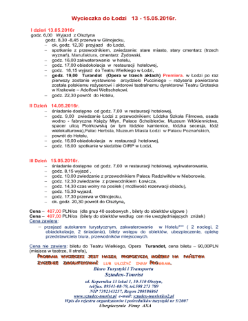Wycieczka do Łodzi 13 - 15.05.2016r. I dzień 13.05.2016r godz. 6,00 Wyjazd z Olsztyna godz. 8,30 -8,45 przerwa w Glinojecku, ok. godz. 12,30 przyjazd do Łodzi, spotkanie z przewodnikiem, zwiedzanie: stare miasto, stary cmentarz (trzech wyznań), Manufaktura, cmentarz Żydowski, godz. 16,00 zakwaterowanie w hotelu, godz. 17,00 obiadokolacja w restauracji hotelowej, godz. 18,15 wyjazd do Teatru Wielkiego w Łodzi, godz. 19,00 Turandot (Opera w trzech aktach) Premiera. w Łodzi po raz pierwszy zostanie wystawione arcydzieło Pucciniego – reżyseria powierzona została polskiemu reżyserowi i aktorowi teatralnemu dyrektorowi Teatru Groteska w Krakowie – Adolfowi Weltschekowi. godz. 22,30 powrót do Hotelu, II Dzień 14.05.2016r. śniadanie dostępne od godz. 7,00 w restauracji hotelowej, godz. 9,00 zwiedzanie Łodzi z przewodnikiem: Łódzka Szkoła Filmowa, osada wodno - fabryczna Księży Młyn, Pałace Scheiblerów, Muzeum Włókiennictwa, spacer ulicą Piotrkowską (w tym łódzkie kamienice, łódzka secesja, łódź wielokulturowa),Pałac Herbsta, Muzeum Miasta Łodzi w Pałacu Poznańskich, powrót do Hotelu, godz. 16,00 obiadokolacja w restauracji hotelowej, godz. 18,00 spotkanie w siedzibie OIRP w Łodzi, III Dzień 15.05.2016r. śniadanie dostępne od godz. 7,00 w restauracji hotelowej, wykwaterowanie, godz. 8,15 wyjazd , godz. 10,00 zwiedzanie z przewodnikiem Pałacu Radziwiłłów w Nieborowie, godz. 12,30 zwiedzanie z przewodnikiem Łowicza, godz. 14,30 czas wolny na posiłek ( możliwość rezerwacji obiadu), godz. 15,30 wyjazd, godz. 17,30 przerwa w Glinojecku, ok. godz. 20,30 powrót do Olsztyna, Cena – 487,00 PLN/os (dla grup 40 osobowych , bilety do obiektów ulgowe ) Cena – 497,00 PLN/os (bilety do obiektów według cen nie uwzględniających zniżek) Cena zawiera: przejazd autokarem turystycznym, zakwaterowanie w Hotelu*** ( 2 noclegi, 2 obiadokolacje, 2 śniadania), bilety wstępu do obiektów, ubezpieczenie, opiekę przedstawiciela biura, przewodników miejscowych. Cena nie zawiera: biletu do Teatru Wielkiego, Opera Turandot, cena biletu – 90,00PLN (miejsca w teatrze, II strefa), PPRRRO O G R A M OG GR RA AM M Ż Ż Y C Z E N E ŻY YC CZ ZE EN NIIIE E W W Y C E C Z K J E S T N A S Z Ą WY YC CIIIE EC CZ ZK KIII J JE ES ST T N NA AS SZ ZĄ Ą PPPR R O O Z Y C J Ą M O Ż E M Y N A RO OPPPO OZ ZY YC CJ JĄ Ą M MO OŻ ŻE EM MY Y N NA A PPRRRO O OGRAM.. Biuro Turystyki i Transportu Z Z M O D Y F K O W A Ć ZM MO OD DY YF FIIIK KO OW WA AĆ Ć LUB UŁOŻYĆ PPPA A Ń S T W A AŃ ŃS ST TW WA A INNY Sztadex-Tourist ul. Kopernika 13 lokal 1, 10-510 Olsztyn, tel/fax. 89541-08-79, tel.508 273 789 NIP 7392143257, Regon 280186861 www.sztadex-tourist.pl e-mail: [email protected] Wpis do rejestru organizatorów i pośredników turystyki nr 5/2007 Ubezpieczenie Firmy AXA