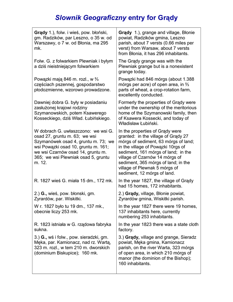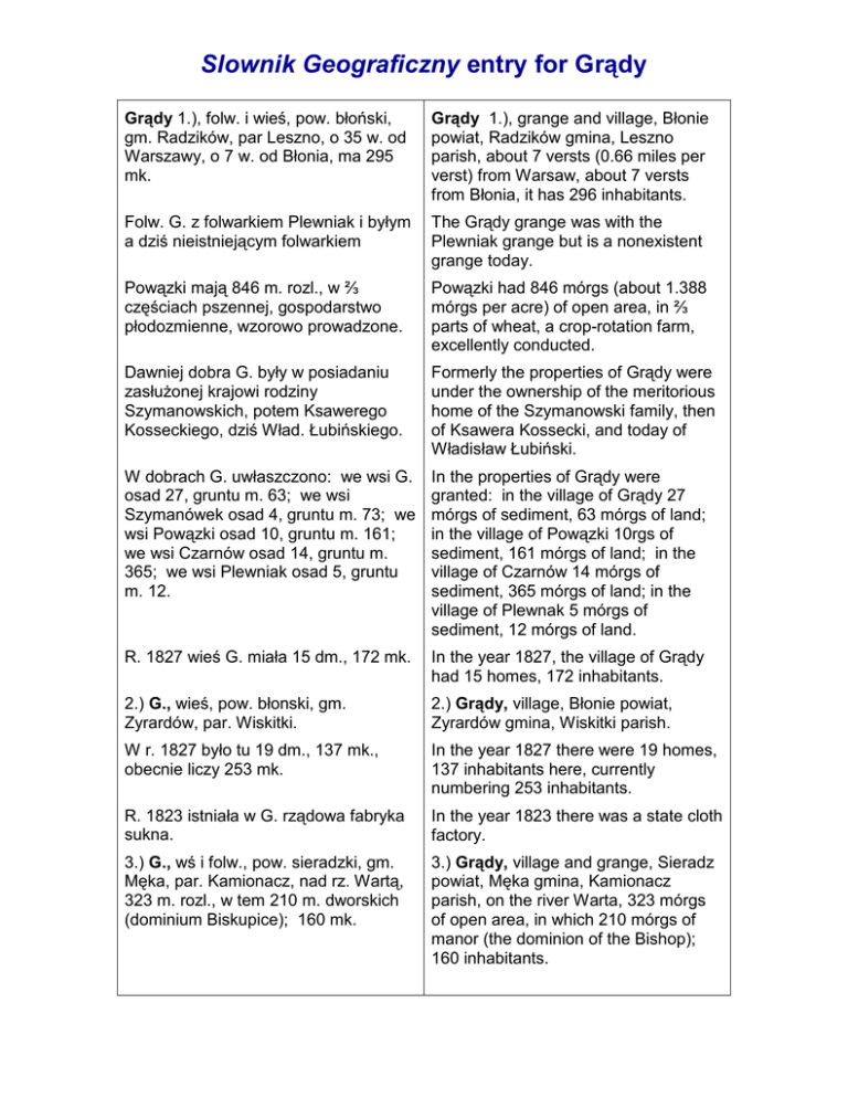 Slownik Geograficzny entry for Grądy Grądy 1.), folw. i wieś, pow. błoński, gm. Radzików, par Leszno, o 35 w. od Warszawy, o 7 w. od Błonia, ma 295 mk. Grądy 1.), grange and village, Błonie powiat, Radzików gmina, Leszno parish, about 7 versts (0.66 miles per verst) from Warsaw, about 7 versts from Błonia, it has 296 inhabitants. Folw. G. z folwarkiem Plewniak i byłym a dziś nieistniejącym folwarkiem The Grądy grange was with the Plewniak grange but is a nonexistent grange today. Powązki mają 846 m. rozl., w ⅔ częściach pszennej, gospodarstwo płodozmienne, wzorowo prowadzone. Powązki had 846 mórgs (about 1.388 mórgs per acre) of open area, in ⅔ parts of wheat, a crop-rotation farm, excellently conducted. Dawniej dobra G. były w posiadaniu zasłużonej krajowi rodziny Szymanowskich, potem Ksawerego Kosseckiego, dziś Wład. Łubińskiego. Formerly the properties of Grądy were under the ownership of the meritorious home of the Szymanowski family, then of Ksawera Kossecki, and today of Władisław Łubiński. W dobrach G. uwłaszczono: we wsi G. osad 27, gruntu m. 63; we wsi Szymanówek osad 4, gruntu m. 73; we wsi Powązki osad 10, gruntu m. 161; we wsi Czarnów osad 14, gruntu m. 365; we wsi Plewniak osad 5, gruntu m. 12. In the properties of Grądy were granted: in the village of Grądy 27 mórgs of sediment, 63 mórgs of land; in the village of Powązki 10rgs of sediment, 161 mórgs of land; in the village of Czarnów 14 mórgs of sediment, 365 mórgs of land; in the village of Plewnak 5 mórgs of sediment, 12 mórgs of land. R. 1827 wieś G. miała 15 dm., 172 mk. In the year 1827, the village of Grądy had 15 homes, 172 inhabitants. 2.) G., wieś, pow. błonski, gm. Zyrardów, par. Wiskitki. 2.) Grądy, village, Błonie powiat, Zyrardów gmina, Wiskitki parish. W r. 1827 było tu 19 dm., 137 mk., obecnie liczy 253 mk. In the year 1827 there were 19 homes, 137 inhabitants here, currently numbering 253 inhabitants. R. 1823 istniała w G. rządowa fabryka sukna. In the year 1823 there was a state cloth factory. 3.) G., wś i folw., pow. sieradzki, gm. Męka, par. Kamionacz, nad rz. Wartą, 323 m. rozl., w tem 210 m. dworskich (dominium Biskupice); 160 mk. 3.) Grądy, village and grange, Sieradz powiat, Męka gmina, Kamionacz parish, on the river Warta, 323 mórgs of open area, in which 210 mórgs of manor (the dominion of the Bishop); 160 inhabitants. Slownik Geograficzny entry for Grądy Wraz z Miedżnem dobra G., własność sarów Siemiątkowskiego (1881), mają 1899 m. rozl, w tem 1590 m. lasu („Pam. Kniżka kaliskoj gub.”) Together with Miedżna the property of Grądy, the property of ___ Siemiątkowski (1881), they had 1899 mórgs of land, in which there were 1590 mórgs of forest (“The Journals of Kniżki, governor of Kaliski”) 4.) G., wś, pow. wieluński, gm. Węglewice, par. Cieszęcin. 4.) Grądy, village, Wieluń powiat, Węglewice gmina, Cieszęcin parish. W 1827 r. było tu 5 dm. i 45 mk. In the year 1827, there was here 5 homes and 45 inhabitants. 5.) G., las w pow. wieluńskim, należy do dóbr Trębaczew. 5.) Grądy, a forest in Wieluń powiat, it belongs to the property of Trębaczew. 6.) G., wś pow. kolski, gm. Budzisław Kolski, par. Osiek Wielki. 6.) Grądy, a village, Koło powiat, Budzisław Kolski gmina, Osiek Wielki parish. 7.) G., fol. niedaleko rz. Warty, pow. koniński, gm. i par. Rzgów. Odl. 12 w. od Konina. 7.) Grądy, a grange not far from the Warta river, Konin powiat, gmina and parish Rzgów. 12 versts distant from Konin. Liczy 435 mr. obszaru i 8 mk., grunt sapowaty, łąki błotniste nad Wartą. Amounts to 435 mórgs of territory and 8 residents, marshy ground, muddy meadows on the Warta. Do dóbr G. należy wieś Babia, niegdyś To the property of Grądy belongs the i folw. t. n. G. były niegdyś częścią dóbr village of Babi, once a grange of the Rzgów. name Grądy, it was once a part of the property of Rzgów. 8.) G., os., pow. koniński, gm. Golina, par. Kawnice; odl. 5 w. od Goliny, liczy 50 mr. obszaru i 5 mk. 8.) Grądy, a settlement, Konin powiat, Golina gmina, Kawnice parish; 5 versts not far from Golina, it amounts to 50 mórgs of territory and 5 residents. 9.) G. nowe i G. stare, kol., pow. słupecki, gm. i par. Grodziec. 9.) New Grądy and Old Grądy, colonies, Słupca powiat, Grodziec gmina and parish. W 1827 r. G. nowe liczyły 43 d., 360 mk. a G. stare 37 dm., 267 mk. In 1827, New Grądy numbered 43 homes, 360 residents and Old Grądy numbered 37 homes, 267 residents. 10.) G., wś, pow. lubelski, gm. Chodel, par. Ratoszyn. 10.) Grądy, a village, Lublin powiat, Chodel gmina, Ratoszyn parish. 11.) G., wś, pow. lubartowski, gm. Łęczna, par. Kijany. 11.) Grądy, a village, Lubartów powiat, Łęczna gmina, Kijany parish. Slownik Geograficzny entry for Grądy 12.) G., wieś, pow. sokołowski, gm. Olszew, par Kossów. W 1827 r. było tu 17 dm., 93 mk., obecnie liczy 16 dm., 110 mk. i 323 mr. obszaru. 12.) Grądy, a village, Sokołów Podlaski powiat, Olsew gmina, Kossów parish. In 1827 here were 17 homes, 93 residents, currently numbering 16 homes, 110 residents and 323 mórgs of territory. 13.) G., pow. łomżyński, gm. Drozdowo, par. Wizna. 13.) Grądy, Łomża powiat, Drozdowo gmina, Wizna parish. 14.) G., wieś i folw., pow. łomżyński, gm. Miastkowo, par. Nowogród. 14.) Grądy, village and grange, Łomża powiat, Miastkowo gmina, Nowogród parish. W 1827 r. było tu 14 dm., 120 mk. In 1827 here were 14 homes, 120 residents. Folw. G. lit. A B, od Łomży w. 11. The Grądy grange letters A B, 11 viersts from Łomża. Rozl. wynosi m. 600, grunta orne i ogrody m. 185, ląk mr. 42, wody mr. 1, lasu mr. 352, nieużytki i place m. 20, bud. drew. 8. Open area amounts to 600 mórgs, 185 mórgs of arable land and gardens, 42 mórgs of meadows, 1 mórg of water, 352 mórgs of forest, 20 mórgs of wastelands and squares, 8 wooden buildings. Nomenklatura Sulki z gruntem m. 27 w r. 1875 oddzieloną hy