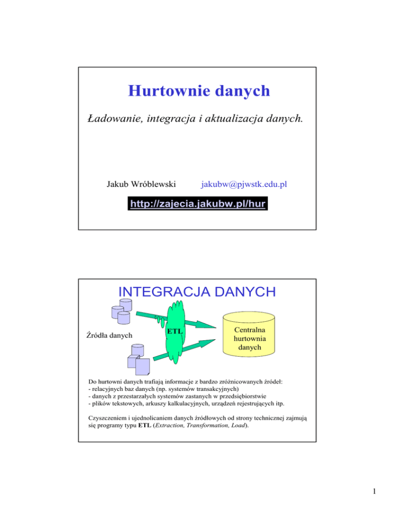 Hurtownie danych Ładowanie, integracja i aktualizacja danych. Jakub Wróblewski [email protected] http://zajecia.jakubw.pl/hur INTEGRACJA DANYCH Źródła danych ETL Centralna hurtownia danych Do hurtowni danych trafiają informacje z bardzo zróżnicowanych źródeł: - relacyjnych baz danych (np. systemów transakcyjnych) - danych z przestarzałych systemów zastanych w przedsiębiorstwie - plików tekstowych, arkuszy kalkulacyjnych, urządzeń rejestrujących itp. Czyszczeniem i ujednolicaniem danych źródłowych od strony technicznej zajmują się programy typu ETL (Extraction, Transformation, Load). 1 INTEGRACJA W MODELU POJĘCIOWYM Integracja danych na poziomie pojęciowym to ustalenie wspólnego języka przekładającego terminy biznesowe modelu pojęciowego na obiekty występujące po stronie źródeł. Np. kto to jest „klient”? Czy wszystkie bazy źródłowe rozumieją to pojęcie w ten sam sposób? Jak przekształcić „klienta” pochodzącego z bazy danych oddziału zagranicznego na „klienta” według definicji naszej hurtowni? Jak dopasować zestawy cech opisujących klientów w różnych systemach źródłowych? Np. „fakt sprzedaży” w jednym systemie identyfikowany jest z wystawieniem faktury, a w innym – z wydaniem towaru z magazynu. INTEGRACJA W MODELU POJĘCIOWYM Integracja danych na poziomie pojęciowym to również: - Selekcja informacji (pominięcie danych nieistotnych z punktu widzenia założonego modelu pojęciowego hurtowni). - Usuwanie redundancji w danych źródłowych. - Ustalenie reguł poprawności i kontroli jakości danych trafiających do hurtowni (np. minimalny współczynnik kompletności danych). Narzędzia ETL realizują integrację danych od strony technicznej. 2 EKSTRAKCJA Proces ekstrakcji polega na wybraniu informacji, które mają trafić do hurtowni, a następnie pozyskaniu tych informacji z baz źródłowych. Może to wymagać skomplikowanych zabiegów związanych np. ze śledzeniem zmian danych w czasie. Przykładowa architektura: pośrednia baza danych cyklicznie odpytuje źródło za pomocą SQL i gromadzi informacje poddawane następnie transformacji i ładowaniu do hurtowni. Zapytanie SQL: SELECT ...dane_klienta... FROM klienci WHERE data_ostatniej_zmiany > ... Baza pośrednia Wprowadzenie bazy pośredniej może ułatwić archiwizację danych. WYKRYWANIE ZMIAN: KLASYFIKACJA ŹRÓDEŁ Źródła współpracujące niewspółpracujące z dziennikiem powielane aktywne specjalne informujące z mechanizmem migawek odpytywalne z aktywnością wewnętrzną 3 ŚLEDZENIE ZMIAN Kiedy uruchomić proces ładowania i które dane są nowe? - Czasem dane mają jawnie podaną datę wprowadzenia do systemów źródłowych (lub możemy taką informację dodać). Alternatywnie możemy zapamiętać tylko informację, czy dany rekord został zarchiwizowany. - Jeśli możemy modyfikować systemy źródłowe oraz ich technologia na to pozwala - instalujemy wyzwalacze. Efektem ich działania może być aktywne powiadamianie hurtowni o zmianach, lub powstawanie tablicy różnic. Są to tablice, w których źródłowa baza danych zapisuje dodawane, usuwane i zmieniane rekordy (źródła z aktywnością wewnętrzną). ŚLEDZENIE ZMIAN - Śledzenie dziennika: Kontrola operacji w bazie danych poprzez śledzenie dziennika aktywności (np. przetwarzanych zapytań) bazy danych. - Jeśli nie możemy ingerować w systemy źródłowe, musimy zapamiętać, które dane zostały załadowane (mechanizm migawek: pamiętamy zakres kluczy, pełną listę kluczy, sumy kontrolne, w ekstremalnym przypadku przechowujemy pełną kopię danych źródłowych). - Niektóre źródła są odpytywalne (np. przez SQL), inne wymagają specjalnych programów do ekstrakcji z danych surowych (wrappers). 4 EKSTRAKCJA cechy p acjenta Transformacje h cec wrapper Przykłady zaawansowanych narzędzi ekstrakcji: yp acj en t wrapper a Dane źródłowe: baza zdjęć MRI Wrapper: algorytmy analizy obrazu Hurtownia Dane źródłowe: karty chorobowe pacjentów Wrapper: algorytmy analizy języka naturalnego TRANSFORMACJA Na transformację danych składają się wszelkie operacje dostosowujące treść i format danych do potrzeb hurtowni. Czyszczenie danych: • wypełnianie pustych wartości • zmiana formatu (daty, liczby) • zmiana wartości (np. przeliczanie jednostek) • ujednolicanie wartości (np. na podstawie słowników) • utrzymanie integralności danych (więzy) Przykład: płeć w jednych systemach może być przechowywana jako „M / K”, w innych jako „M / F”. Systemy mogą się różnić formatem dat, formatem kropki dziesiętnej, nawet kodowaniem (ASCII / EBCDIC, standardy polskich znaków). 5 TRANSFORMACJA Przykłady operacji czyszczenia danych: • Uzupełnienie brakującego kodu pocztowego na podstawie adresu. • Wykrywanie i (w miarę możliwości) reperacja błędów literowych, słownikowych (błąd w nazwie miasta, których pełną listę mamy w bazie), formatu (nieistniejący numer telefonu – zbyt mało cyfr). • Normalizacja wartości: zamiana stringów „” czy „spacja” na NULL. • Wydzielenie imienia i nazwiska z jednego, wspólnego pola tekstowego Niejednorodność może wynikać z różnego pochodzenia danych i ze zwykłych błędów podczas wypełniania. ŁADOWANIE Ładowanie danych do hurtowni to problem przede wszystkim techniczny. Metody postępowania: • przekształcanie i ładowanie rekord po rekordzie • zewnętrzna obróbka (scalanie, sortowanie) i ładowanie gotowych danych • wykorzystanie dedykowanych, wydajnych mechanizmów docelowej bazy danych. Problemy: • zapewnienie dyspozycyjności hurtowni (np. praca nocna) • wydajność 6 PROBLEMY AKTUALIZACJI Źródła danych Centralna hurtownia danych Propagacja aktualizacji • Jak wykrywać zmiany w danych źródłowych? • Jak integrować zmienione dane w hurtowni danych? • Jak aktualizować systemy pochodne (np. kostki danych w hurtowniach tematycznych)? Elementem odświeżania 