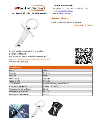 Dane kontaktowe tel. +48 22 122 13 00 , fax. +48 22 122 13 01 email: [email protected] ul. Złota 59, 00-120 Warszawa www: www.tech-media.pl Brelok 'Piłkarz' Brelok metalowy w kształcie piłkarza. Cena od : 2,54 zł To jest ulotka informacyjna produktu: Brelok 'Piłkarz', aby zobaczyć pełną informację wejdź na: www.tech-media.pl/brelok,primepikarz,prime,0478.html lub zeskanuj kod QR. Specyfikacja Kolor srebrny Rozmiar 7 x 3 cm Materiał Metal Waga netto 0,047 kg. Waga brutto 0,051 kg. Znakowanie grawer laserowy, tampondruk Rozmiar znakowania grawer:15x10mm Opakowanie jednostkowe 50 szt. Opakowanie zbiorcze 250 szt. Minimalne zamówienie 200 szt.