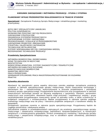 Wyższa Szkoła Ekonomii i Administracji w Bytomiu - zarządzanie i administracja, i czwartek, 2 marzec 2017 KIERUNEK ZARZĄDZANIE I INŻYNIERIA PRODUKCJI - STUDIA 2 STOPNIA PLANOWANY WYKAZ PRZEDMIOTÓW REALIZOWANYCH W TRAKCIE STUDIÓW Specjalność Zarządzanie Produkcją Sprzętu Medycznego i rehabilitacyjnego i marketing przemysłowy JĘZYK OBCY SPECJALISTYCZNY (ANGIELSKI) POLITYKA GOSPODARCZA EKONOMICZNE PODSTAWY DECYZJI PRODUCENTA ZARZĄDZANIE STRATEGICZNE ORGANIZACJA SYSTEMÓW PRODUKCYJNYCH ZINTEGROWANE SYSTEMY ZARZĄDZANIA PROGNOZOWANIE I SYMULACJE W PRZEDSIĘBIORSTWIE ZARZĄDZANIE PROJEKTEM I INNOWACJAMI STRUKTURA I WŁAŚCIWOŚCI MATERIAŁÓW TECHNOLOGIE METALURGICZNE SYSTEMY WSPOMAGANIA DECYZJI I ZARZĄDZANIA WIEDZĄ BEZODPADOWE TECHNOLOGIE PRODUKCJI Przedmioty Specjalnościowe INŻYNIERIA BIOMEDYCZNA I BIOMECHANIKA NOWE TECHNOLOGIE W MEDYCYNIE BIOSTATYSTYKA NOWOCZESNA APARATURA, SYSTEMY DIAGNOSTYCZNE I TERAPEUTYCZNE INŻYNIERIA RECHABILITACJI RUCHOWEJ NANOTECHNOLOGIE BIOMEDYCZNE MARKETING MEDYCZNY PRACA PRZEJŚCIOWA SEMINARIUM DYPLOMOWE/ PRACA MAGISTERSKA/PRZYGOTOWANIE DO EGZAMINU PRAKTYKI Sylwetka absolwenta Absolwent tej specjalności pozna aspekty dotyczące szeroko pojętego zarządzania produkcją urządzeń w zakresie specjalistycznego sprzętu medycznego. Pozna nowoczesne technologie z elementami bio- i nanotechnologii, wykorzystywane w procesie projektowania i późniejszej produkcji sprzętu specjalistycznego. Przygotowanie biomechaniczne oraz przygotowanie w zakresie nowoczesnych technologii pozwoli na aktywną współpracę z pacjentem- klientem, personelem medycznym oraz przemysłem. Absolwent będzie mógł pracować i współtworzyć zespoły i grupy racjonalizatorskie przygotowujące nowoczesny sprzęt na potrzeby rynku, a także uczestniczyć w projektach związanych z innowacyjnością. Będzie przygotowany w zakresie szeroko pojętego marketingu medycznego oraz do pracy i tworzenia projektów związanych z transferem wiedzy do gospodarki. Umiejętności językowe rozwinie w zakresie języka specjalistycznego. Przygotowany będzie do ciągłego poszerzania i zdobywania wiedzy. Zatrudnienie znajdzie w przedsiębiorstwach zajmujących się produkcją specjalistycznego sprzętu medycznego i zaopatrzenia ortopedycznego, jednostkach naukowo-badawczych, w konsorcjach związanych z innowacyjnością gospodarki, firmach prowadzących marketing i dystrybucję sprzętu medycznego i zaopatrzenia ortopedycznego, oraz w ośrodkach opieki zdrowotnej, placówkach rehabilitacyjnych. 1/1