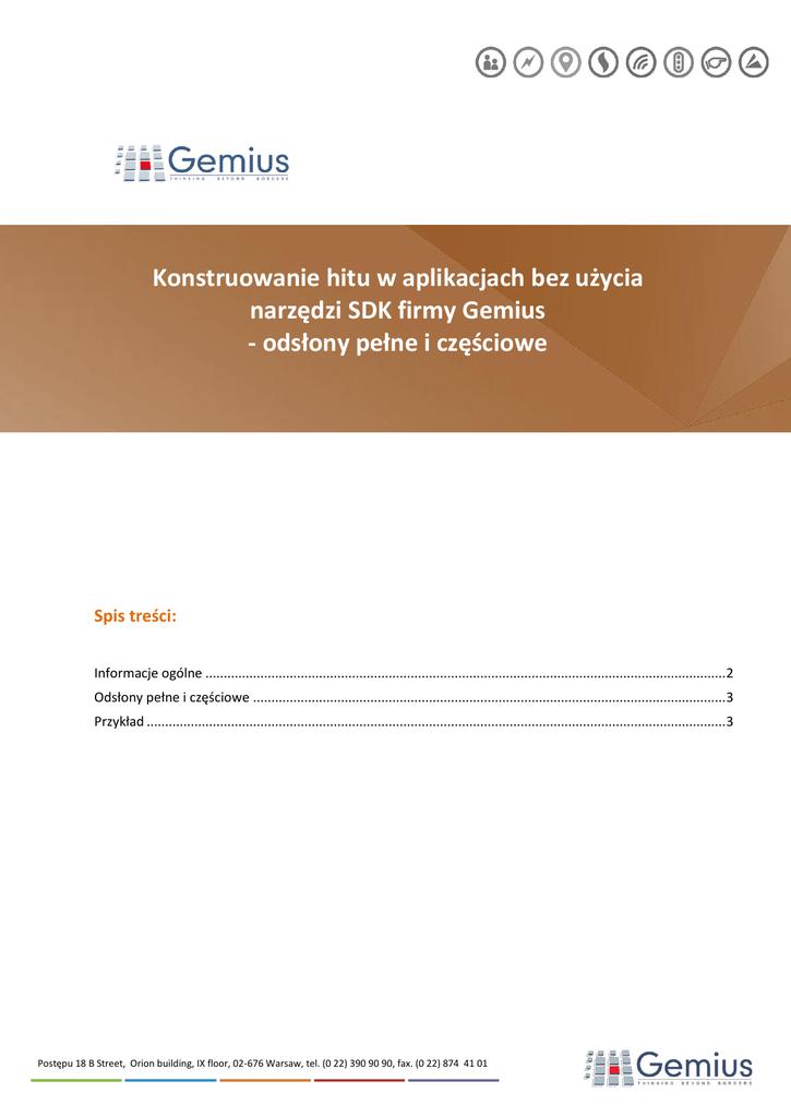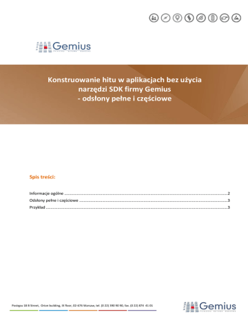 Konstruowanie hitu w aplikacjach bez użycia narzędzi SDK firmy Gemius - odsłony pełne i częściowe Spis treści: Informacje ogólne .............................................................................................................................................. 2 Odsłony pełne i częściowe ................................................................................................................................. 3 Przykład .............................................................................................................................................................. 3 Postępu 18 B Street, Orion building, IX floor, 02-676 Warsaw, tel. (0 22) 390 90 90, fax. (0 22) 874 41 01 Informacje ogólne Wykonując pomiar dla potrzeb audytu aplikacji, należy wykonywać żądanie HTTP (metoda GET) pod adres: http://PREFIX.hit.gemius.pl/redot.gif gdzie PREFIX jest częścią dedykowanego hitcollectora na potrzeby badania (w przypadku Polski jest to „gapl”). W tak utworzonym hicie trzeba przesłać zestaw następujących parametrów: Parametr Wartość L 60 Id IDENTYFIKATOR Lsdata -NOTSUP Screen Col Window Opis wersja skryptu (60 oznacza aplikację) identyfikator klienta identyfikator użytkownika zapisany w localStorage, dla aplikacji należy przekazać wartość '-NOTSUP' dwie liczby całkowite liczby określające rozdzielczość (liczbę pikseli x i y) monitora użytkownika oddzielone symbolem 'x' (parametr opcjonalny) np. 1024x768 liczba całkowita parametr określa głębie kolorów monitora użytkownika (parametr opcjonalny) dwie liczby całkowite liczby określające rozmiar (liczbę pikseli x i y) okna aplikacji (parametr oddzielone symbolem 'x' opcjonalny) np. 300x200 Et napis typ zdarzenia, może przyjąć wartość 'view' lub 'action' (parametr opcjonalny domyślnie 'view') Hsrc liczba informacja o sposobie wygenerowania hitu (1-automatycznie, 2-gemius_hit, 3gemius_event) (parametr opcjonalny) Extra dodatkowe parametry w formacie"nazwa1=wartość1|nazwa2=wartość2|....", napis zawierający kody kodowanie znaków UTF-8, należy pamiętać o encodowaniu (parametr escape opcjonalny) W nagłówku HTTP UserAgent należy przesłać napis o formacie opisanym w dokumencie dotyczącym formatu ua dla aplikacji w badaniu Megapanel. Jednocześnie trzeba pamiętać o przesyłaniu i przechowywaniu cookie. Przy wysyłaniu kolejnych hitów należy przesłać cookie, które zostało odebrane przy poprzednim żądaniu do serwerów Gemiusa. Postępu 18 B Street, Orion building, IX floor, 02-676 Warsaw, tel. (0 22) 390 90 90, fax. (0 22) 874 41 01 Odsłony pełne i częściowe Zgodnie z uchwałą, za odsłonę uznajemy zdarzenie pełnego przeładowania nową treścią zawartości strony w oknie przeglądarki lub aplikacji z wyłączeniem komponentów statycznych, poprzedzone każdorazowo intencjonalną akcją użytkownika wynikłą z intencji pozyskania nowej treści, aktualizacji bieżącej treści lub skorzystania z nowej usługi. Przy czym za komponent statyczny uznajemy część graficzną i funkcjonalną warstwy prezentacji realizującą funkcję tła, nagłówka, stopki, menu lub paska nawigacji, które nie podlegają zmianie w zależności od dostarczanych treści bądź usług. W pełnym zbiorze odsłon wyodrębniamy dla wewnętrznych potrzeb badania Megapanel 2 typy: Odsłona pełna – odsłona, w trakcie której następuje przeładowanie wszystkich komponentów statycznych; dla odsłon pełnych przesyłany powinien być parametr hsrc=1 Odsłona częściowa – odsłona, w trakcie której nie następuje przeładowanie wszystkich komponentów statycznych; dla odsłon częściowych przesyłany powinien być parametr hsrc=2 Pozostałe elementy budowanego hita dla odsłony pozostają bez zmian ze względu na jej typ. Parametr „hit source” jest dedykowanym nośnikiem informacji rodzaju generowanej odsłony. Odsłony techniczne - służące do zliczania czasu aktywnego korzystania mają być oznaczane parametrem hsrc=1. Przykład Przykładowe żądanie dla odsłony pełnej w aplikacji może przyjąć postać: http://PREFIX.hit.gemius.pl/redot.gif?l=60&id=IDENTYFIKATOR&et=view&hsrc=1&screen=1024x768&col=2 4&lsdata=-NOTSUP natomiast dla odsłony częściowej żądanie ukształtować należy w następujący sposób: http://PREFIX.hit.gemius.pl/redot.gif?l=60&id=IDENTYFIKATOR&et=view&hsrc=2&screen=1024x768&col=2 4&lsdata=-NOTSUP Postępu 18 B Street, Orion building, IX floor, 02-676 Warsaw, tel. (0 22) 390 90 90, fax. (0 22) 874 41 01
