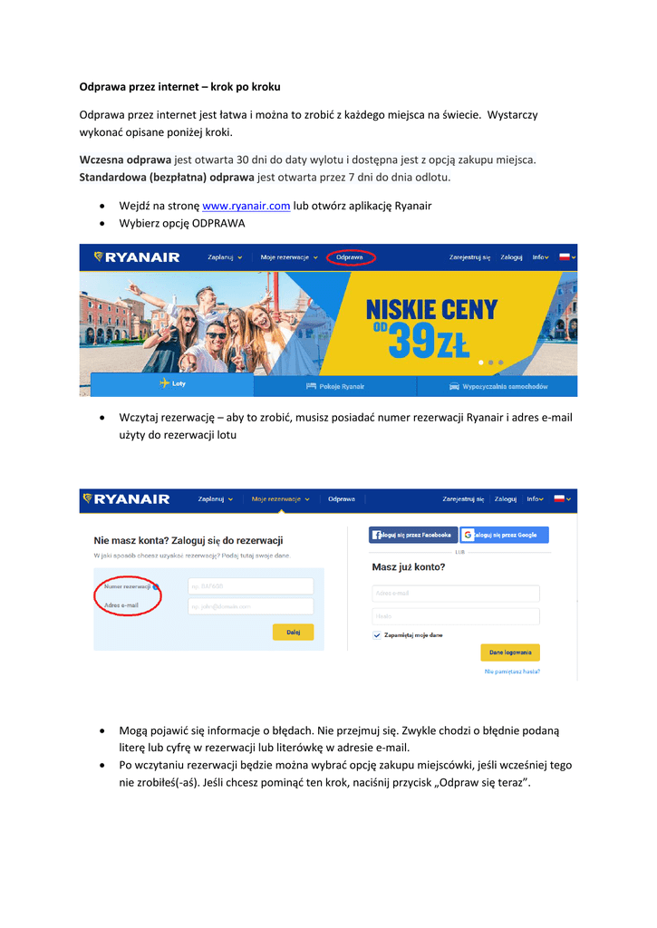 Odprawa przez internet – krok po kroku Odprawa przez internet jest łatwa i można to zrobić z każdego miejsca na świecie. Wystarczy wykonać opisane poniżej kroki. Wczesna odprawa jest otwarta 30 dni do daty wylotu i dostępna jest z opcją zakupu miejsca. Standardowa (bezpłatna) odprawa jest otwarta przez 7 dni do dnia odlotu. Wejdź na stronę www.ryanair.com lub otwórz aplikację Ryanair Wybierz opcję ODPRAWA Wczytaj rezerwację – aby to zrobić, musisz posiadać numer rezerwacji Ryanair i adres e-mail użyty do rezerwacji lotu Mogą pojawić się informacje o błędach. Nie przejmuj się. Zwykle chodzi o błędnie podaną literę lub cyfrę w rezerwacji lub literówkę w adresie e-mail. Po wczytaniu rezerwacji będzie można wybrać opcję zakupu miejscówki, jeśli wcześniej tego nie zrobiłeś(-aś). Jeśli chcesz pominąć ten krok, naciśnij przycisk „Odpraw się teraz”. Teraz możesz zakupić miejscówkę lub pozwolić na bezpłatne, losowe wybranie miejsca w samolocie (jeśli data wylotu przypada w ciągu 4 najbliższych dni). Po wybraniu opcji dotyczącej miejsca wybierz przycisk „Kontynuuj”, aby zapłacić za miejscówkę lub wczytać kartę pokładową. Odprawa zakończona! Teraz możesz pobrać lub wydrukować swoją kartę pokładową. Życzymy udanej podróży!
