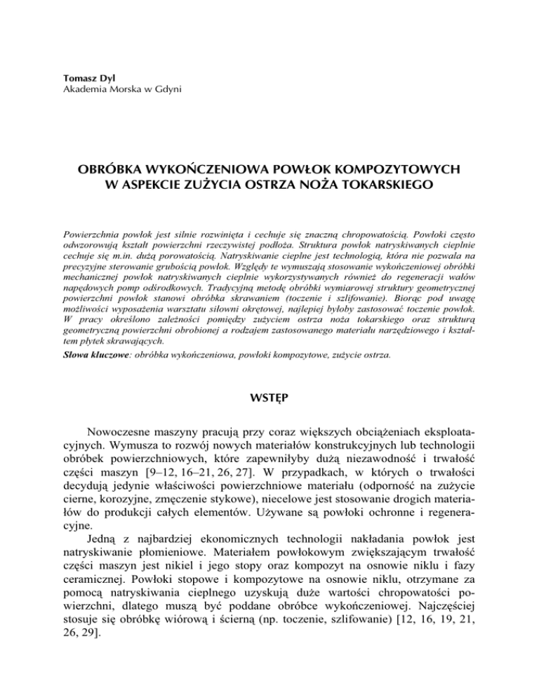 Tomasz Dyl Akademia Morska w Gdyni OBRÓBKA WYKOŃCZENIOWA POWŁOK KOMPOZYTOWYCH W ASPEKCIE ZUŻYCIA OSTRZA NOŻA TOKARSKIEGO Powierzchnia powłok jest silnie rozwinięta i cechuje się znaczną chropowatością. Powłoki często odwzorowują kształt powierzchni rzeczywistej podłoża. Struktura powłok natryskiwanych cieplnie cechuje się m.in. dużą porowatością. Natryskiwanie cieplne jest technologią, która nie pozwala na precyzyjne sterowanie grubością powłok. Względy te wymuszają stosowanie wykończeniowej obróbki mechanicznej powłok natryskiwanych cieplnie wykorzystywanych również do regeneracji wałów napędowych pomp odśrodkowych. Tradycyjną metodę obróbki wymiarowej struktury geometrycznej powierzchni powłok stanowi obróbka skrawaniem (toczenie i szlifowanie). Biorąc pod uwagę możliwości wyposażenia warsztatu siłowni okrętowej, najlepiej byłoby zastosować toczenie powłok. W pracy określono zależności pomiędzy zużyciem ostrza noża tokarskiego oraz strukturą geometryczną powierzchni obrobionej a rodzajem zastosowanego materiału narzędziowego i kształtem płytek skrawających. Słowa kluczowe: obróbka wykończeniowa, powłoki kompozytowe, zużycie ostrza. WSTĘP Nowoczesne maszyny pracują przy coraz większych obciążeniach eksploatacyjnych. Wymusza to rozwój nowych materiałów konstrukcyjnych lub technologii obróbek powierzchniowych, które zapewniłyby dużą niezawodność i trwałość części maszyn [9–12, 16–21, 26, 27]. W przypadkach, w których o trwałości decydują jedynie właściwości powierzchniowe materiału (odporność na zużycie cierne, korozyjne, zmęczenie stykowe), niecelowe jest stosowanie drogich materiałów do produkcji całych elementów. Używane są powłoki ochronne i regeneracyjne. Jedną z najbardziej ekonomicznych technologii nakładania powłok jest natryskiwanie płomieniowe. Materiałem powłokowym zwiększającym trwałość części maszyn jest nikiel i jego stopy oraz kompozyt na osnowie niklu i fazy ceramicznej. Powłoki stopowe i kompozytowe na osnowie niklu, otrzymane za pomocą natryskiwania cieplnego uzyskują duże wartości chropowatości powierzchni, dlatego muszą być poddane obróbce wykończeniowej. Najczęściej stosuje się obróbkę wiórową i ścierną (np. toczenie, szlifowanie) [12, 16, 19, 21, 26, 29]. 30 ZESZYTY NAUKOWE AKADEMII MORSKIEJ W GDYNI, nr 83, sierpień 2014 Istotne jest określenie zależności pomiędzy parametrami technologicznymi obróbki wykończeniowej powłok stopowych i kompozytowych a parametrami geometrycznymi zużycia ostrza noża tokarskiego, dla płytek skrawających o różnym kształcie i wykonanych z różnych rodzajów materiałów (np. węgliki spiekane i regularny azotek boru). Zagadnienia związane z obróbką skrawaniem powłok stopowych i kompozytowych są relatywnie trudne. Wynika to z warstwowej budowy powłok, inkluzji tlenkowych, porowatości oraz stosunkowo niskiej przyczepności [18]. W pracach [18–21, 24] zalecane są narzędzia i sposoby obróbki charakteryzujące się następującymi parametrami: kąt przystawienia głównej krawędzi skrawającej κr = 45°; kąt natarcia zerowy γ = 0° lub ujemny γ = −5°; kąt przyłożenia α = 5–8°; promień naroża rε = 0,8 mm; prędkość skrawania vc = 20–40 m/min; posuw f = 0,05–0,1 mm/obr; głębokość skrawania ap= 0,05 mm (obróbka bardzo dokładna) ap = 0,8 mm (obróbka zgrubna). Tradycyjnie podczas toczenia powłok natryskiwanych cieplnie stosuje się małe prędkości skrawania, średnio 30 m/min. Wynika to przede wszystkim z dwóch powodów: niskiej adhezji powłok do podłoża (ze względu na wzrost sił skrawania wraz ze wzrostem prędkości skrawania) i możliwości ich oderwania, szybkiego zużycia krawędzi skrawającej narzędzia, wynikającej z obecności w strukturze powłok tlenków „in situ” oraz porów. Uważa się, że szybkość zużycia narzędzia jest proporcjonalna do porowatości powłok [18, 19, 21]. W celu obniżenia sił skrawających oraz uzyskania małej chropowatości powierzchni stosuje się małe posuwy oraz głębokości skrawania [17, 18]. Użycie małych głębokości skrawania powłok niklowych powoduje szybkie zużycie powierzchni przyłożenia płytki skrawającej [24]. W pracy [26] przedstawiono wyniki wstępnych badań toczenia powłok natryskiwanych cieplnie dla zalecanych parametrów skrawania zamieszczonych w pracach [19, 20, 24]. Po przeprowadzonych badaniach toczenia powłok stopowych i kompozytowych określono, że chropowatość jest duża i mieści się w zakresie Ra = 1,69–4,22 μm [26]. Z tego względu podczas obróbki wykończeniowej powłok stopowych i kompozytowych, we wspomnianej pracy proponuje się stosowanie większych prędkości skrawania od podanych w zaleceniach producentów materiałów powłokowych [19, 21, 24]. Ze względu na powstawanie wióra odrywanego podczas toczenia powłok, podobnie jak podczas obróbki żeliw, używa się również narzędzi wykonanych z materiałów odpornych na ścieranie (ze względu na obecność w strukturze powłok inkluzji tlenkowych). Zalecanym materiałem narzędziowym są: węgliki spiekane do obróbki żeliwa (K10), regularny azotek boru (CBN) lub diament. Podstawowym rodzajem zużycia narzędzia podczas obróbki jest ścieranie powierzchni przyłożenia. W pracy [21] przedstawiono wyniki badań, na podstawie których stwierdzono, że wielkość cząstek uzyskanych wiórów jest mniejsza przy kącie przystawienia 45° niż przy 90°. Wpływa to na mniejsze zużycie narzędzia i pozwala na uzyskanie mniejszej chropowatości toczonych powierzchni natryskiwanych cieplnie powłok. W praktyce powłoki natryskiwane cieplnie toczy się tym samym narzędziem co T. Dyl, Obróbka wykończeniowa powłok kompozytowych w aspekcie zużycia ostrza noża tokarskiego 31 podłoże. Na przykład firma Messer-Castolin proponuje dwa rodzaje narzędzi: „Rototool II” z kwadratową płyt
