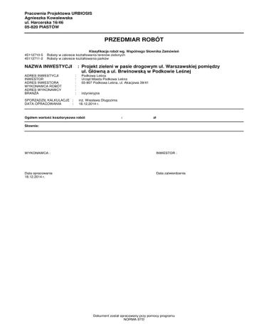 Pracownia Projektowa URBIOSIS Agnieszka Kowalewska ul. Harcerska 16/46 05-820 PIASTÓW PRZEDMIAR ROBÓT 45112710-5 45112711-2 Klasyfikacja robót wg. Wspólnego Słownika Zamówień Roboty w zakresie kształtowania terenów zielonych Roboty w zakresie kształtowania parków NAZWA INWESTYCJI ADRES INWESTYCJI INWESTOR ADRES INWESTORA WYKONAWCA ROBÓT ADRES WYKONAWCY BRANŻA SPORZĄDZIŁ KALKULACJE : DATA OPRACOWANIA : : : : : : : : Projekt zieleni w pasie drogowym ul. Warszawskiej pomiędzy ul. Główną a ul. Brwinowską w Podkowie Leśnej Podkowa Leśna Urząd Miasta Podkowa Leśna 05-807 Podkowa Leśna, ul. Akacjowa 39/41 inżynieryjna inż. Wiesława Długozima 18.12.2014 r. Ogółem wartość kosztorysowa robót : zł Słownie: WYKONAWCA : INWESTOR : Data opracowania 18.12.2014 r. Data zatwierdzenia Dokument został opracowany przy pomocy programu NORMA STD CHARAKTERYSTYKA OBIEKTU LUB ROBÓT przedmiar-Podkowa Leśna- zieleń CHARAKTERYSTYKA OBIEKTU LUB ROBÓT 1. ZAKRES OPRACOWANIA: Niniejszy przedmiar obejmuje nasadzenia zieleni w pasie drogowym ul. Warszawskiej pomiędzy ul. Główną a ul. Brwinowską w Podkowie Leśnej. 2. ZAKRES ROBÓT: Zakres prac obejmuje: - sadzenie drzew, - sadzenie bylin, - zakładanie trawników - pięlęgnacja roślin i trawników 3. PODSTAWA OPRACOWANIA Przedmiar opracowano na podstawie dokumentacji: Projekt zieleni w pasie drogowym ul. Warszawskiej pomiędzy ul. Główną a ul. Brwinowską w Podkowie Leśnej. -2Norma STD Wersja 4.23 SPIS TREŚCI przedmiar-Podkowa Leśna- zieleń Lp. Kod wg CPV Nazwa działu 1 45112710-5 Drzewa liściaste 1.1 45112710-5 Sadzenie drzew 1.2 45112711-2 Pielęgnacja drzew 2 45112710-5 Krzewy i krzewinki 2.1 45112710-5 Sadzenie krzewów 2.2 45112711-2 Rozścielenie kory 2.3 45112711-2 Pielęgnacja krzewów 3 45112710-5 Trawniki 3.1 45112711-2 Przygotowanie podłoża pod trawniki dywanowe 3.2 45112711-2 Wykonanie trawników dywanowych 3.3 45112711-2 Pielęgnacja trawników -3Norma STD Wersja 4.23 Od 1 1 2 3 3 8 9 10 10 14 15 Do 2 1 2 9 7 8 9 15 13 14 15 PRZEDMIAR ROBÓT przedmiar-Podkowa Leśna- zieleń Lp. Podstawa Opis i wyliczenia 1 45112710-5 Drzewa liściaste 1.1 45112710-5 Sadzenie drzew 1 KNR 2-21 Sadzenie drzew i krzewów liściastych form naturalnych na terenie płaskim w grund.1.1 0302-10 cie kat. III z zaprawą do połowy głębokości dołów; średnica/głębokość : 1.0/0.7 m Głóg jednoszyjkowy odm. Variegata 6/8cm, Pa 16-180, C12 250-300cm 7 j.m. szt. Pielęgnacja drzew Pielęgnacja drzew liściastych form piennych szt. 7 szt. 2 2.1 3 d.2.1 Krzewy i krzewinki Sadzenie krzewów Sadzenie drzew i krzewów liściastych form naturalnych na terenie płaskim w gruncie kat. III z całkowitą zaprawą dołów; średnica/głębokość : 0.3 m. Pęcherznica kalinolistna odm. 'Red Baron' C2, 40-60cm 27 4 KNR 2-21 d.2.1 0302-04 5 KNR 2-21 d.2.1 0302-08 6 KNR 2-21 d.2.1 0302-04 7 KNR 2-21 d.2.1 0302-04 szt. Sadzenie drzew i krzewów liściastych form naturalnych na terenie płaskim w gruncie kat. III z całkowitą zaprawą dołów; średnica/głębokość : 0.3 m Tawuła gęstokwiatowa C2, 30-40cm 61 szt. Sadzenie drzew i krzewów liściastych form naturalnych na terenie płaskim w gruncie kat. III z zaprawą do połowy głębokości dołów; średnica/głębokość : 0.5 m. Tawuła trójłatkowa C5, 30-40cm 80 szt. Sadzenie drzew i krzewów liściastych form naturalnych na terenie płaskim w gruncie kat. III z całkowitą zaprawą dołów; średnica/głębokość : 0.3 m. Śnieguliczka Chenaulta odm. Hancock C2, 20-30 cm 1970 szt. Sadzenie drzew i krzewów liściastych form naturalnych na terenie płaskim w gruncie kat. III z całkowitą zaprawą dołów; średnica/głębokość : 0.3 m. Trzmielina Fortune'a odm. Coloratus P13, 15-20cm 188 szt. szt. szt. szt. szt. Rozścielenie kory Ręczne rozrzucenie kory na terenie płaskim grubość warstwy 5 cm ha (27/1.2*0.7+1980/0.7*0.5+188/8+61/0.6*0.6+80/1*1)/10000 ha 2.3 45112711-2 9 KNR 2-21 d.2.3 0701-01 Pielęgnacja krzewów Pielęgnacja krzewów liściastych szt. 61+80+1970+188 szt. 3 3.1 10 d.3.1 Trawniki Przygotowanie podłoża pod trawniki dywanowe Oczyszczenie terenu z resztek budowlanych, gruzu i śmieci - zebranie i złożenie zanieczyszczeń w pryzmy 256*0.01 m3 m3 11 KNR 2-21 d.3.1 0101-04 Wywiezienie zanieczyszczeń z resztek budowlanych, gruzu i śmieci samochodami na odległość do 1.0 km poz.10 m3 12 KNR 2-21 d.3.1 0101-05 Wywiezienie zanieczyszczeń z resztek budowlanych, gruzu i śmieci samochodami dodatek za dalsze 0.5 km Krotność = 49 poz.10 m3 13 KNR 2-21 d.3.1 0218-01 Rozścielenie ziemi urodzajnej ręczne z przerzutem na terenie płaskim m3 256*0.2 m3 3.2 45112711-2 14 KNR 2-21 d.3.2 0401-05 Wykonanie trawników dywanowych Wykonanie trawników dywanowych siewem na gruncie kat. III z nawożeniem m2 256 m2 3.3 45112711-2 15 KNR 2-21 d.3.3 0702-06 Pielęgnacja trawników Mechaniczna pielęgnacja trawników dywanowych na terenie płaskim m2 256 m2 -4Norma STD Wersja 4.23 7.00 RAZEM 7.00 7.00 RAZEM 7.00 27.00 RAZEM 27.00 61.00 RAZEM 61.00 80.00 RAZEM 80.00 1 970.00 RAZEM 1 970.00 188.00 RAZEM 188.00 0.16 RAZEM 0.16 2 299.00 RAZEM 2 299.00 2.56 RAZEM 2.56 2.56 RAZEM 2.56 2.56 RAZEM 2.56 51.20 RAZEM 51.20 256.00 RAZEM 256.00 256.00 RAZEM 256.00 szt. 2.2 45112711-2 8 KNR 2-21 d.2.2 0209-01 + KNR 2-21 0209-02 45112710-5 45112711-2 KNR 2-21 0101-01 Razem szt. 1.2 45112711-2 2 KNR 2-21 d.1.2 0701-04 45112710-5 45112710-5 KNR 2-21 0302-04 Poszcz m3 m3 KOSZTORYS INWESTORSKI przedmiar-Podkowa Leśna- zieleń Lp. Podstawa 1 1.1 1 d.1.1 45112710-5 45112710-5 KNR 2-21 030210 Opis Jedn. obm. Drzewa liściaste Sadzenie drzew Sadzenie drzew i krzewów liściastych form naturalnych na terenie płaskim w gruncie kat. III z zaprawą do połowy głębokości dołów; średnica/głębokość : 1.0/0.7 m - Głóg jednoszyjkowy odm. Variegata 6/8cm, Pa 16-180, C12 250-300cm Pielęgnacja drzew Pielęgnacja drzew liściastych form piennych 1.2 45112711-2 2 KNR 2-21 0701d.1.2 04 Razem