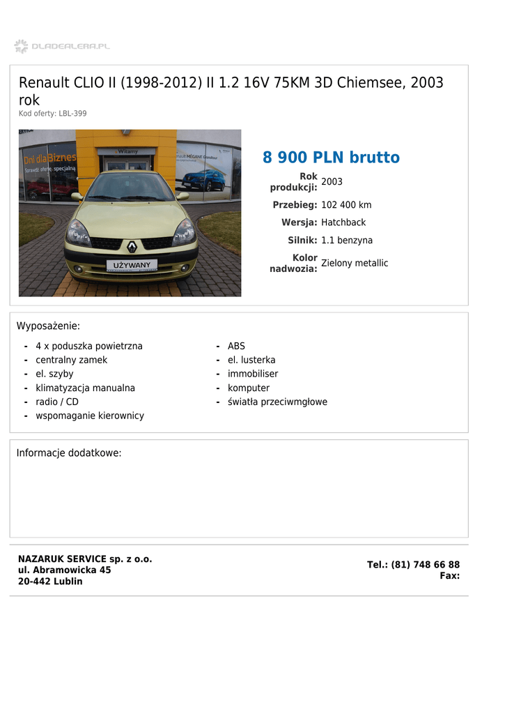 Renault CLIO II (1998-2012) II 1.2 16V 75KM 3D Chiemsee, 2003 rok Kod oferty: LBL-399 8 900 PLN brutto Rok 2003 produkcji: Przebieg: 102 400 km Wersja: Hatchback Silnik: 1.1 benzyna Kolor Zielony metallic nadwozia: Wyposażenie: - 4 x poduszka powietrzna centralny zamek el. szyby klimatyzacja manualna radio / CD wspomaganie kierownicy - ABS el. lusterka immobiliser komputer światła przeciwmgłowe Informacje dodatkowe: NAZARUK SERVICE sp. z o.o. ul. Abramowicka 45 20-442 Lublin Tel.: (81) 748 66 88 Fax: