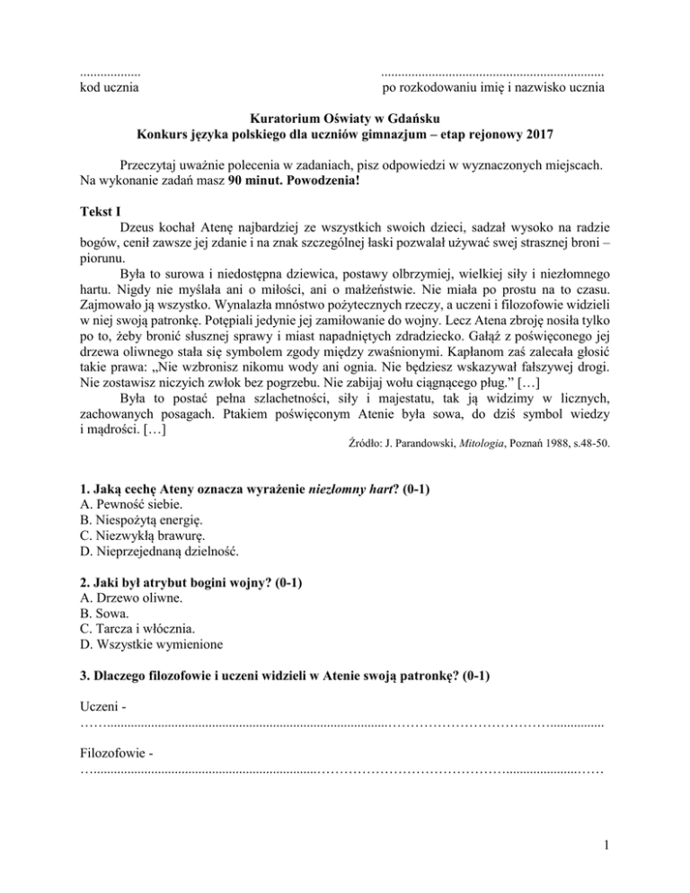 .................. kod ucznia .................................................................. po rozkodowaniu imię i nazwisko ucznia Kuratorium Oświaty w Gdańsku Konkurs języka polskiego dla uczniów gimnazjum – etap rejonowy 2017 Przeczytaj uważnie polecenia w zadaniach, pisz odpowiedzi w wyznaczonych miejscach. Na wykonanie zadań masz 90 minut. Powodzenia! Tekst I Dzeus kochał Atenę najbardziej ze wszystkich swoich dzieci, sadzał wysoko na radzie bogów, cenił zawsze jej zdanie i na znak szczególnej łaski pozwalał używać swej strasznej broni – piorunu. Była to surowa i niedostępna dziewica, postawy olbrzymiej, wielkiej siły i niezłomnego hartu. Nigdy nie myślała ani o miłości, ani o małżeństwie. Nie miała po prostu na to czasu. Zajmowało ją wszystko. Wynalazła mnóstwo pożytecznych rzeczy, a uczeni i filozofowie widzieli w niej swoją patronkę. Potępiali jedynie jej zamiłowanie do wojny. Lecz Atena zbroję nosiła tylko po to, żeby bronić słusznej sprawy i miast napadniętych zdradziecko. Gałąź z poświęconego jej drzewa oliwnego stała się symbolem zgody między zwaśnionymi. Kapłanom zaś zalecała głosić takie prawa: „Nie wzbronisz nikomu wody ani ognia. Nie będziesz wskazywał fałszywej drogi. Nie zostawisz niczyich zwłok bez pogrzebu. Nie zabijaj wołu ciągnącego pług.” […] Była to postać pełna szlachetności, siły i majestatu, tak ją widzimy w licznych, zachowanych posagach. Ptakiem poświęconym Atenie była sowa, do dziś symbol wiedzy i mądrości. […] Źródło: J. Parandowski, Mitologia, Poznań 1988, s.48-50. 1. Jaką cechę Ateny oznacza wyrażenie niezłomny hart? (0-1) A. Pewność siebie. B. Niespożytą energię. C. Niezwykłą brawurę. D. Nieprzejednaną dzielność. 2. Jaki był atrybut bogini wojny? (0-1) A. Drzewo oliwne. B. Sowa. C. Tarcza i włócznia. D. Wszystkie wymienione 3. Dlaczego filozofowie i uczeni widzieli w Atenie swoją patronkę? (0-1) Uczeni ……...................................................................................………………………………................ Filozofowie …..................................................................…………………………………….....................…… 1 4. Jak należy rozumieć prawa przekazane kapłanom przez Atenę? Zapisz je w punktach własnymi słowami. (0-2) ............................................................................................................................................................ ............................................................................................................................................................ ............................................................................................................................................................ ............................................................................................................................................................ 5. Wyjaśnij cechy Ateny, podając po jednym wyrazie bliskoznacznym. (0-2) szlachetność – .................................................................................................................................... siła – .................................................................................................................................................. majestat – ........................................................................................................................................... Tekst II Ares był synem Dzeusa i Hery. Jako dziecko nie objawiał żadnych zdolności, więc oddano go na wychowanie jednemu z tytanów1. Mistrz sam nic nie umiał i zaprawiał ucznia jedynie do ćwiczeń fizycznych. Wyrobił mu silne muskuły i wpoił przekonanie, że najpiękniejszym zajęciem jest wojna. Ares zamówił u Hefajstosa cały arsenał mieczów, tarcz i włóczni i zeszedł na ziemię. Ludzie nie znali dotychczas wojennego rzemiosła. Zabijali się w sposób nader nieumiejętny. W razie sporu brali kije lub kamienie, a ich walki odznaczały się brakiem wszelkiego ładu. Najzacieklejsze waśnie kończyły się kilku guzami. Wojowniczymi czynił ich strach lub interes. Dopiero Ares nauczył ich bezinteresownego bohaterstwa i stali się okrutni. Sporządzili sobie broń na podobieństwo tej, którą im pokazał, i zmienili się w żołnierzy. Odtąd wojna nabrała właściwego znaczenia. Zorganizowane okrucieństwo było zajęciem pięknym, zaszczytnym i korzystnym. […] Źródło: J. Parandowski, Mitologia, Poznań 1988, s.69. 6. Czym różniło się dzieciństwo przedstawionych w tekstach I. i II. potomków Zeusa? (0-1) ............................................................................................................................................................ ............................................................................................................................................................ 7. Porównaj Atenę i Aresa. Podaj z tekstu dwie różnice i jedną cechę wspólną. (0-2) Różnice: 1. ........................................................................................................................................................ 2. ........................................................................................................................................................ Cecha wspólna: ................................................................................................................................. 1 tytani – synowie Nieba i Ziemi, bóstwa przedolimpijskie (starsze). 2 8. Na czym polega ironia wyrażona w ostatnim zdaniu tekstu II: Zorganizowane okrucieństwo było zajęciem pięknym, zaszczytnym i korzystnym. (0-2) ............................................................................................................................................................ ...............................