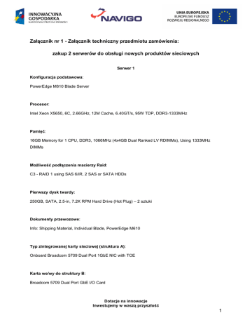 Załącznik nr 1 - Załącznik techniczny przedmiotu zamówienia: zakup 2 serwerów do obsługi nowych produktów sieciowych Serwer 1 Konfiguracja podstawowa: PowerEdge M610 Blade Server Procesor: Intel Xeon X5650, 6C, 2.66GHz, 12M Cache, 6.40GT/s, 95W TDP, DDR3-1333MHz Pamięć: 16GB Memory for 1 CPU, DDR3, 1066MHz (4x4GB Dual Ranked LV RDIMMs), Using 1333MHz DIMMs Możliwość podłączenia macierzy Raid: C3 - RAID 1 using SAS 6/iR, 2 SAS or SATA HDDs Pierwszy dysk twardy: 250GB, SATA, 2.5-in, 7.2K RPM Hard Drive (Hot Plug) – 2 sztuki Dokumenty przewozowe: Info: Shipping Material, Individual Blade, PowerEdge M610 Typ zintegrowanej karty sieciowej (struktura A): Onboard Broadcom 5709 Dual Port 1GbE NIC with TOE Karta we/wy do struktury B: Broadcom 5709 Dual Port GbE I/O Card Dotacje na innowacje Inwestujemy w waszą przyszłość 1 Zarządzanie systemami: Dell OpenManage Kit for PowerEdge M610 Blade Server Podstawowa gwarancja: 3Yr Basic Warranty - Next Business Day - Minimum Warranty Usługi pomocy technicznej: 3Yr ProSupport for End Users and 4hr Mission Critical Dokumentacja: M610 EMEA2 Shipping Documentation (English/Slovenian/Slovakian/Polish/Czech/Hungarian/Greek/Arabic) System Operacyjny Microsoft Windows Web Server 2008 Serwer 2 Konfiguracja podstawowa: PowerEdge M610 Blade Server Procesor: Intel Xeon X5650, 6C, 2.66GHz, 12M Cache, 6.40GT/s, 95W TDP, DDR3-1333MHz Pamięć: 16GB Memory for 1 CPU, DDR3, 1066MHz (4x4GB Dual Ranked LV RDIMMs), Using 1333MHz DIMMs Możliwość podłączenia macierzy Raid: C3 - RAID 1 using SAS 6/iR, 2 SAS or SATA HDDs Dotacje na innowacje Inwestujemy w waszą przyszłość 2 Pierwszy dysk twardy: 250GB, SATA, 2.5-in, 7.2K RPM Hard Drive (Hot Plug) – 2 sztuki Dokumenty przewozowe: Info: Shipping Material, Individual Blade, PowerEdge M610 Typ zintegrowanej karty sieciowej (struktura A): Onboard Broadcom 5709 Dual Port 1GbE NIC with TOE Karta we/wy do struktury B: Broadcom 5709 Dual Port GbE I/O Card Zarządzanie systemami: Dell OpenManage Kit for PowerEdge M610 Blade Server Podstawowa gwarancja: 3Yr Basic Warranty - Next Business Day - Minimum Warranty Usługi pomocy technicznej: 3Yr ProSupport for End Users and 4hr Mission Critical Dokumentacja: M610 EMEA2 Shipping Documentation (English/Slovenian/Slovakian/Polish/Czech/Hungarian/Greek/Arabic) System Operacyjny Bez systemu operacyjnego Dotacje na innowacje Inwestujemy w waszą przyszłość 3