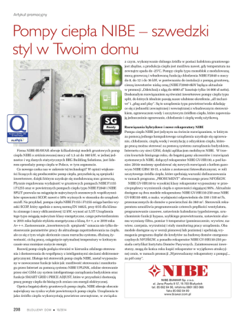 Artykuł promocyjny Pompy ciepła NIBE – szwedzki styl w Twoim domu z czym, wykonywanie dolnego źródła w postaci kolektora gruntowego jest zbędne, a produkcja ciepła jest możliwa nawet, gdy temperatura na zewnątrz spada do -25°C. Pompy ciepła typu monoblok z modulowaną mocą grzewczą i wbudowaną funkcją chłodzenia NIBE F2040 o mocy do 8, do 12 i do 16 kW, w porównaniu do instalacji z pompą gruntową, cieszą inwestorów niską ceną (NIBE F2040-8kW będąca aktualnie w promocji „Odetchnij z ulgą do 4000 zł” kosztuje tylko 14 000 zł netto). Doskonałym rozwiązaniem są również inwerterowe pompy ciepła typu split, do których idealnie pasują nasze ulubione określenia „all inclusive” i „plug and play”. Są to urządzenia typu powietrze/woda składające się z jednostki zewnętrznej i wewnętrznej z wbudowanym sterownikiem, ogrzewaczem wody i szczytowym źródłem ciepła, które zapewniają jednocześnie ogrzewanie, chłodzenie i ciepłą wodę użytkową. Firma NIBE-BIAWAR oferuje kilkadziesiąt modeli gruntowych pomp ciepła NIBE o zróżnicowanej mocy od 1,5 aż do 160 kW, w jednej jednostce i wg danych statystycznych BRG Building Solutions, jest liderem sprzedaży pomp ciepła w Polsce, w tym segmencie. Co nowego czeka nas w zakresie tej technologii? W opinii większości liczących się producentów pomp ciepła, przyszłością są sprężarki inwerterowe, dzięki którym uzyskuje się modulowaną moc grzewczą. Płynnie regulowana wydajność w gruntowych pompach NIBE F1155 i F1255 oraz w powietrznych pompach ciepła typu NIBE F2040 i NIBE SPLIT pozwala na osiągnięcie najwyższych sezonowych współczynników sprawności SCOP, nawet o 18% wyższych w stosunku do urządzeń on/off. Na przykład, pompa ciepła NIBE F1155 i F1255 osiąga bardzo wysoki SCOP, który zgodnie z nową normą EN 14825, przy 0/35 dla klimatu zimnego i mocy obliczeniowej 12 kW, wynosi aż 5,5!!! Urządzenia tego typu osiągają najwyższe klasy energetyczne, czego potwierdzeniem w 2015 roku będzie etykieta energetyczna z klasą A++, a w 2019 roku A+++. Zastosowanie „inwerterowych sprężarek” oznacza nie tylko dostosowanie parametrów pracy do aktualnego zapotrzebowania na ciepło, ale co się z tym wiąże skrócenie czasu rozruchu systemu, dłuższą żywotność, cichą pracę, osiągnięcie optymalnej temperatury w krótszym czasie oraz mniejsze zużycie energii. Rozwój pomp ciepła podąża również w kierunku zdalnego sterowania i dostosowania do współpracy z inteligentnymi sieciami elektroenergetycznymi. Dlatego też sterownik pomp ciepła NIBE, został wyposażony w nowoczesne funkcje takie jak: możliwość sterowania i monitoringu przez Internet za pomocą systemu NIBE UPLINK, zdalne sterowanie przez sieć GSM czy system inteligentnego zarządzania budynkiem oraz funkcje SMART GRID i PRICE ADJUST, które w przyszłości dostosują pracę pompy ciepła do bieżących zmian cen energii elektrycznej. Oprócz bogatej oferty gruntowych pomp ciepła, NIBE oferuje obecnie największy na rynku wybór powietrznych pomp ciepła. Urządzenia te jako źródło ciepła wykorzystują powietrze zewnętrzne, w związku 208 budujemy dom 10/2014 Rozwiązania hybrydowe i nowe rekuperatory NIBE Pompa ciepła NIBE jest jedynym na świecie rozwiązaniem, w którym za pomocą jednego kompaktowego urządzenia uzyskuje się ogrzewanie, chłodzenie, ciepłą wodę i wentylację z odzyskiem ciepła, którego pracą można sterować za pomocą systemu zarządzania budynkiem, Internetu czy sieci GSM, dzięki aplikacjom mobilnym NIBE. W trzecim kwartale bieżącego roku, do bogatej gamy akcesoriów i rozwiązań systemowych NIBE, dołączył rekuperator NIBE GV-HR110, a pod koniec 2014r możemy spodziewać się nowych rozwiązań z kotłem gazowym NIBE GBM 10-15, a także z zestawami fotowoltaicznymi, w roli szczytowego źródła ciepła, które spełniają warunki dofinansowania w ramach programu „PROSUMENT” oferowanego przez NFOŚiGW. NIBE GV-HR110 to wysokiej klasy rekuperator wyposażony w przeciwprądowy wymiennik ciepła o sprawności sięgającej 96%. Aktualnie dostępne są dwa modele rekuperatora: NIBE GV-HR110-250 oraz NIBE GV-HR110-400, o maks. wydajności odpowiednio do 330 i 510 m3/h, przeznaczonych do domów o powierzchni do 360 m2. Sterownik rekuperatora umożliwia programowanie czterech prędkości wentylatora, programowanie czasowe, ustawienie kalendarza tygodniowego, uruchomienie funkcji bypass, szybkiego przewietrzania, ustawienie alarmu wymiany filtra, pomiar 5 temperatur (pomieszczenie, wywiew, nawiew, czerpnia, wyrzutnia) i stały monitoring pracy urządzenia. Oba modele dostępne są w wersji pionowej lub poziomej i spełniają wymagania programu dopłat do kredytów na budowę domów energooszczędnych NFOŚiGW, a ponadto rekuperator NIBE GV-HR110-250 posiada certyfikat Instytutu Domów Pasywnych. Zainteresowani inwestorzy, mogą do końca roku kupić rekuperator w wyjątkowo atrakcyjnej cenie, w ramach promocji „Wprowadzamy rekuperatory z pompą!... za pół ceny”. NIBE-BIAWAR Sp. z o.o. al. Jana Pawła II 57, 15-703 Białystok tel. 85 662 84 90, infolinia 0801 003 066 faks 85 662 84 09 www.biawar.com.pl