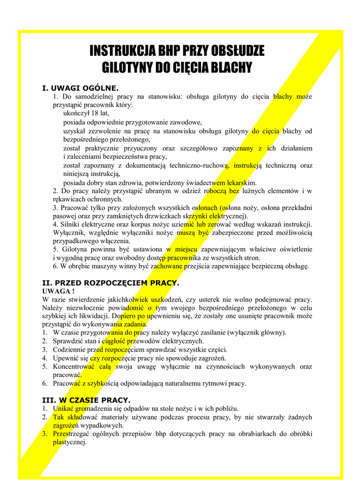 INSTRUKCJA BHP PRZY OBSŁUDZE GILOTYNY DO CIĘCIA BLACHY I. UWAGI OGÓLNE. 1. Do samodzielnej pracy na stanowisku: obsługa gilotyny do cięcia blachy może przystąpić pracownik który: ukończył 18 lat, posiada odpowiednie przygotowanie zawodowe, uzyskał zezwolenie na pracę na stanowisku obsługa gilotyny do cięcia blachy od bezpośredniego przełożonego, został praktycznie przyuczony oraz szczegółowo zapoznany z ich działaniem i zaleceniami bezpieczeństwa pracy, został zapoznany z dokumentacją techniczno-ruchową, instrukcją techniczną oraz niniejszą instrukcją, posiada dobry stan zdrowia, potwierdzony świadectwem lekarskim. 2. Do pracy należy przystąpić ubranym w odzież roboczą bez luźnych elementów i w rękawicach ochronnych. 3. Pracować tylko przy założonych wszystkich osłonach (osłona noży, osłona przekładni pasowej oraz przy zamkniętych drzwiczkach skrzynki elektrycznej). 4. Silniki elektryczne oraz korpus nożyc uziemić lub zerować według wskazań instrukcji. Wyłącznik, względnie wyłączniki nożyc muszą być zabezpieczone przed możliwością przypadkowego włączenia. 5. Gilotyna powinna być ustawiona w miejscu zapewniającym właściwe oświetlenie i wygodną pracę oraz swobodny dostęp pracownika ze wszystkich stron. 6. W obrębie maszyny winny być zachowane przejścia zapewniające bezpieczną obsługę. II. PRZED ROZPOCZĘCIEM PRACY. UWAGA ! W razie stwierdzenie jakichkolwiek uszkodzeń, czy usterek nie wolno podejmować pracy. Należy niezwłocznie powiadomić o tym swojego bezpośredniego przełożonego w celu szybkiej ich likwidacji. Dopiero po upewnieniu się, że zostały one usunięte pracownik może przystąpić do wykonywania zadania. 1. W czasie przygotowania do pracy należy wyłączyć zasilanie (wyłącznik główny). 2. Sprawdzić stan i ciągłość przewodów elektrycznych. 3. Codziennie przed rozpoczęciem sprawdzać wszystkie części. 4. Upewnić się czy rozpoczęcie pracy nie spowoduje zagrożeń. 5. Koncentrować całą swoja uwagę wyłącznie na czynnościach wykonywanych oraz pracować. 6. Pracować z szybkością odpowiadającą naturalnemu rytmowi pracy. III. W CZASIE PRACY. 1. Unikać gromadzenia się odpadów na stole nożyc i w ich pobliżu. 2. Tak składować materiały używane podczas procesu pracy, by nie stwarzały żadnych zagrożeń wypadkowych. 3. Przestrzegać ogólnych przepisów bhp dotyczących pracy na obrabiarkach do obróbki plastycznej. 4. Nie wolno przeciążać maszyny przy cięciu twardszych blach i blach nierdzewnych, zmniejszyć odpowiednio grubość. 5. Nie dopuszczać do stępienia ostrza. W przypadku śladów zużycia przeszlifować lub wymienić. IV. NIEDOPUSZCZALNE JEST: - dokonywanie zmian w konstrukcji i usuwanie niesprawności elektrycznych i mechanicznych przez osoby nieuprawnione, - użytkowanie niesprawnej gilotyny, - cięcie blach o grubości i wytrzymałości większej niż jest ona określona przez producenta, - pracowanie samotnie w pomieszczeniu, ze względu na niemożność udzielenia pomocy w razie wypadku, - pozostawianie przy maszynie narzędzi, odpadów produkcyjnych oraz przedmiotów osobistych pracownika, - dopuszczanie do pracy osób postronnych, - zdejmowanie osłon, gdy maszyna jest w ruchu, - czyszczenie, smarowanie bądź regulowanie maszyny podczas pracy, V. PO ZAKOŃCZENIU PRACY NALEŻY. 1. Przed opuszczeniem stanowiska pracy wyłączyć zasilanie i wyczyścić maszynę. 2. Zabezpieczyć materiał wykorzystywany podczas procesu produkcji. 3. Pozostawić gilotynę i miejsce wokół niej w stanie, który umożliwi dalszą pracę i nie stworzy żadnych zagrożeń dla otoczenia. VI. KONSERWACJE I REMONTY. 1. Konserwacje i remonty mogą przeprowadzać wyłącznie specjalnie do tego przeszkolone osoby, po uprzednim odłączeniu gilotyny od zasilania. 2. Wszelkie prace związane z instalacja elektryczną może wykonywać tylko pracownik z odpowiednimi kwalifikacjami. 3. Oprócz zwykłych czynności konserwacyjnych gilotyna podlega przeglądom okresowym. Przegląd całego urządzenia, co miesiąc ma obejmować kontrolę: silnika, połączeń elektrycznych, odkręcania różnych części, smaru, obracanie się sprzęgła, odległości między ostrzem górnym a dolnym, ewentualnego stępienia ostrzy, naciągu pasa klinowego, temperatury łożysk. ....................................................... (Opracował) ....................................................... (Zatwierdził)
