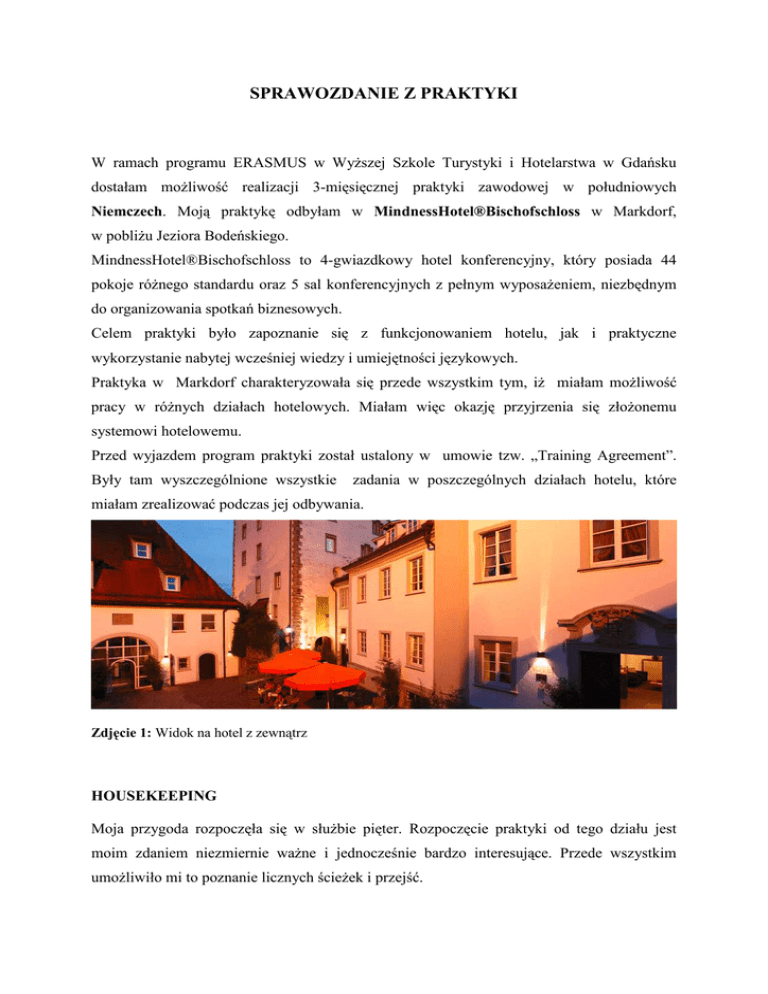 SPRAWOZDANIE Z PRAKTYKI W ramach programu ERASMUS w Wyższej Szkole Turystyki i Hotelarstwa w Gdańsku dostałam możliwość realizacji 3-mięsięcznej praktyki zawodowej w południowych Niemczech. Moją praktykę odbyłam w MindnessHotel®Bischofschloss w Markdorf, w pobliżu Jeziora Bodeńskiego. MindnessHotel®Bischofschloss to 4-gwiazdkowy hotel konferencyjny, który posiada 44 pokoje różnego standardu oraz 5 sal konferencyjnych z pełnym wyposażeniem, niezbędnym do organizowania spotkań biznesowych. Celem praktyki było zapoznanie się z funkcjonowaniem hotelu, jak i praktyczne wykorzystanie nabytej wcześniej wiedzy i umiejętności językowych. Praktyka w Markdorf charakteryzowała się przede wszystkim tym, iż miałam możliwość pracy w różnych działach hotelowych. Miałam więc okazję przyjrzenia się złożonemu systemowi hotelowemu. Przed wyjazdem program praktyki został ustalony w umowie tzw. „Training Agreement”. Były tam wyszczególnione wszystkie zadania w poszczególnych działach hotelu, które miałam zrealizować podczas jej odbywania. Zdjęcie 1: Widok na hotel z zewnątrz HOUSEKEEPING Moja przygoda rozpoczęła się w służbie pięter. Rozpoczęcie praktyki od tego działu jest moim zdaniem niezmiernie ważne i jednocześnie bardzo interesujące. Przede wszystkim umożliwiło mi to poznanie licznych ścieżek i przejść. MindnessHotel® Bischofschlossskłada się z trzech części: barokowego pałacu, 500-letniej wieży i galerii – które, połączone ze sobą, stanowią dla początkującego istny labirynt. Wraz z ekipą służby pięter miałam możliwość obejrzenia większość pokoi, poznania lokalizacji w hotelu pomieszczeń funkcjonalnych, a także magazynów o różnym przeznaczeniu. Doświadczenia nabyte w tymże dziale znakomicie ułatwiły mi pracę w kolejnych działach, szczególnie we Front Desk – czyli recepcji. SŁUŻBA ŚNIADANIOWA Po kilku dniach służby pięter zostałam przeniesiona do służby śniadaniowej. Kompletnie odmienna od służby pięter praca zaczynała się już we wczesnych godzinach porannych. Zadaniem pracujących tu osób było przygotowanie śniadania, tak aby goście, często będący w podróży służbowej, już od godziny 7-ej mogli posilić się przed czekającym ich dniem pracy. Do moich zadań należała opieka nad gośćmi, utrzymywanie stołów w stanie czystości, uzupełnianie bufetu i serwowanie napojów, tak zimnych jak i gorących. Praca w tymże dziale miała odmienny charakter również z tego względu, iż pracownicy mają bezpośredni kontakt z gośćmi hotelowymi. Ich praca nie jest już tak anonimowa, jak miało to miejsce w służbie pięter. Pachnąca kawą sala, gwar rozmów (często w różnych językach), przyjemna muzyka w tle stanowiła bez wątpienia bardzo przyjemny akcent pracy, nawet jeśli od czasu do czasu napływ gości był bardzo intensywny. Zdjęcie 2: Sala śniadaniowa FRONT DESK – RECEPCJA Po kolejnych kilku dniach moje zadania przeniosły się do recepcji, w której pracowałam najdłużej, już do końca praktyki. Tutaj zyskałam przede wszystkim wgląd w procesy rezerwacyjne. Praca w recepcji okazała się bardzo kompleksowa, składająca się ze złożonych interakcji pomiędzy gośćmi, personelem hotelowym, jak procesami hotelowymi. Praca w recepcji umożliwia zrozumienie procesów zachodzących we wszystkich działach. Do moich obowiązków należało zameldowanie i wymeldowanie gości przy użyciu programu rezerwacyjnego PROTEL (obowiązującego w Niemczech), oprowadzanie gości po hotelu (znów ten labirynt ☺), udzielanie informacji po niemiecku, angielsku, francusku i po polsku, przygotowanie rachunków za noclegi, kontrola stanu kasy, przygotowanie do zameldowania (formularze meldunkowe oraz vouchery na dostęp do internetu), dyżur telefoniczny, przygotowanie graficzne i wydruk kart menu dla restauracji na bankiety i konferencje, a następnie ich tłumaczenie na inne języki. Praca w tym dziale była niezwykle ciekawa i stanowiła ogromne wyzwanie. Wszystko musiało przebiegać płynnie i bezkonfliktowo. Moim ulubionym zajęciem stało się po pewnym czasie zameldowanie nowych gości, jak i ich oprowadzanie po zakamarkach naszego hotelu. Zdjęcie 3: Recepcja hotelowa KONFERENCJE Równolegle do pracy w recepcji zostałam włączona w przygotowania i realizację konferencji. Dzięki temu zdałam sobie sprawę ile pracy należy w te przygotowania i realizację włożyć, aby ich przebieg był absolutnie perfekcyjny. Do moich zadań należało między innymi przygotowanie sal konferencyjnych, czyli ustawianie stołów i krzeseł w określonym porządku, przygotowanie i sprawdzanie sprzętu technicznego, przygotowanie poczęstunku na czas przerw na kawę odpowiednio do ilości osób, wydruk i zawieszanie opisów umiejscowienia w hotelu różnych sal konferencyjnych w celu ułatwienia uczestnikom dotarcia do odpowiedniej sali (niekiedy organizowane były dwie lub trzy konferencje równolegle) oraz udzielanie wszelkich możliwych informacji na zadawane przez uczestników pytania. Zdjęcie 4: Sala konferencyjna DENKRAUM SUMA SUMARUM Gdybym miała przed sobą jeszcze raz możliwość odbycia takiej praktyki zdecydowałabym się na nią bez chwili wahania. Niezwykłe doświadczenia, poznanie procesów zachodzących w hotelu, nowi ludzie, nowe metody pracy z pewnością warte są podjęcia tego wysiłku. Choć na początku nie zawsze było łatwo w końcowym etapie doświadczenie to stanowiło samą przyjemność. Składam serdeczne podziękowania dla szkoły i uczelnianego biura karier za wszechstronną pomoc i wsparcie! Zdjęcie 5:Ela Möbus z Panią Kierownik ds. Personalnych Serdeczne pozdrowienia, Elżbieta Möbus Studentka WSTiH