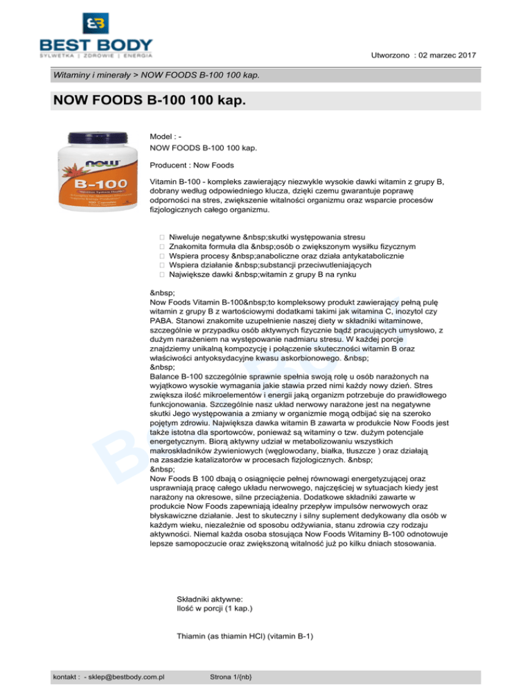 Utworzono : 02 marzec 2017 Witaminy i minerały > NOW FOODS B-100 100 kap. NOW FOODS B-100 100 kap. Model : NOW FOODS B-100 100 kap. Producent : Now Foods Vitamin B-100 - kompleks zawierający niezwykle wysokie dawki witamin z grupy B, dobrany według odpowiedniego klucza, dzięki czemu gwarantuje poprawę odporności na stres, zwiększenie witalności organizmu oraz wsparcie procesów fizjologicznych całego organizmu. � Niweluje negatywne skutki występowania stresu � Znakomita formuła dla osób o zwiększonym wysiłku fizycznym � Wspiera procesy anaboliczne oraz działa antykatabolicznie � Wspiera działanie substancji przeciwutleniających � Największe dawki witamin z grupy B na rynku y d Now Foods Vitamin B-100 to kompleksowy produkt zawierający pełną pulę witamin z grupy B z wartościowymi dodatkami takimi jak witamina C, inozytol czy PABA. Stanowi znakomite uzupełnienie naszej diety w składniki witaminowe, szczególnie w przypadku osób aktywnych fizycznie bądź pracujących umysłowo, z dużym narażeniem na występowanie nadmiaru stresu. W każdej porcje znajdziemy unikalną kompozycję i połączenie skuteczności witamin B oraz właściwości antyoksydacyjne kwasu askorbionowego. Balance B-100 szczególnie sprawnie spełnia swoją rolę u osób narażonych na wyjątkowo wysokie wymagania jakie stawia przed nimi każdy nowy dzień. Stres zwiększa ilość mikroelementów i energii jaką organizm potrzebuje do prawidłowego funkcjonowania. Szczególnie nasz układ nerwowy narażone jest na negatywne skutki Jego występowania a zmiany w organizmie mogą odbijać się na szeroko pojętym zdrowiu. Największa dawka witamin B zawarta w produkcie Now Foods jest także istotna dla sportowców, ponieważ są witaminy o tzw. dużym potencjale energetycznym. Biorą aktywny udział w metabolizowaniu wszystkich makroskładników żywieniowych (węglowodany, białka, tłuszcze ) oraz działają na zasadzie katalizatorów w procesach fizjologicznych. Now Foods B 100 dbają o osiągnięcie pełnej równowagi energetyzującej oraz usprawniają pracę całego układu nerwowego, najczęściej w sytuacjach kiedy jest narażony na okresowe, silne przeciążenia. Dodatkowe składniki zawarte w produkcie Now Foods zapewniają idealny przepływ impulsów nerwowych oraz błyskawiczne działanie. Jest to skuteczny i silny suplement dedykowany dla osób w każdym wieku, niezależnie od sposobu odżywiania, stanu zdrowia czy rodzaju aktywności. Niemal każda osoba stosująca Now Foods Witaminy B-100 odnotowuje lepsze samopoczucie oraz zwiększoną witalność już po kilku dniach stosowania. t s e B o B Składniki aktywne: Ilość w porcji (1 kap.) Thiamin (as thiamin HCl) (vitamin B-1) kontakt : - [email protected] Strona 1/{nb} Utworzono : 02 marzec 2017 Witaminy i minerały > NOW FOODS B-100 100 kap. NOW FOODS B-100 100 kap. 100 mg 6,667% Riboflavin (vitamin B-2) 100 mg 5,882% Niacinamide 100 mg 500% Vitamin B-6 (as pyridoxine HCl) 100 mg 5,000% Folic Acid 400 mcg 100% Vitamin B-12 (as cyanocobalamin) 100 mcg 1,667% Biotin 100 mcg 33% t s e B y d o B Pantothenic Acid (as d-calcium pantothenate) 100 mg 1,000% Choline (as choline bitartrate) 40 mg Inositol 100 mg PABA 10 mg Wielkość porcji: 1 kap. Ilość porcji w opakowaniu: 100 Dawkowanie i sposób użycia: stosować 1 kap. Now Foods B-100 dziennie. UWAGA - kopiowanie oraz rozpowszechnianie opisów jest zabronione przez sklep BEST BODY © 2015. Ustawa z dnia 4 lutego 1994 r. o prawie autorskim i kontakt : - [email protected] Strona 2/{nb} Utworzono : 02 marzec 2017 Witaminy i minerały > NOW FOODS B-100 100 kap. NOW FOODS B-100 100 kap. prawach pokrewnych (Dz. U. z 2006 r. Nr 90, poz. 631 z późn. zm.). Ochrona autorskich praw osobistych: Twórca, którego autorskie prawa osobiste zostały zagrożone cudzym działaniem, może żądać zaniechania tego działania. W razie dokonanego naruszenia może także żądać, aby osoba, która dopuściła się naruszenia, dopełniła czynności potrzebnych do usunięcia jego skutków, w szczególności, aby złożyła publiczne oświadczenie o odpowiedniej treści i formie. Jeżeli naruszenie było zawinione, sąd może przyznać twórcy odpowiednią sumę pieniężną tytułem zadośćuczynienia za doznaną krzywdę albo - na żądanie twórcy - zobowiązać sprawcę, aby uiścił odpowiednią sumę pieniężną na wskazany przez twórcę cel społeczny. Cena : 99,00 zł Brutto ( 92,52 zł Netto) y d Dostępność: Produkt dostępny w naszym sklepie od 21 styczeń 2016 t s e B kontakt : - [email protected] Strona 3/{nb} o B