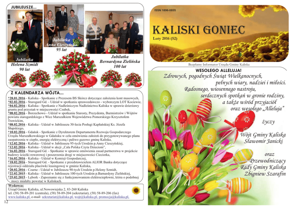 JUBILEUSZE... ISSN 1896-0855 KALISKI GONIEC Luty 2016 (52) Jubilatka Anna Cieszyńska 95 lat Jubilatka Helena Szmidt 90 lat Jubilatka Bernardyna Zielińska 100 lat Z KALENDARZA WÓJTA... *28.01.2016 - Kaliska - Spotkanie z Prezesem BS Skórcz dotyczące założenia kont masowych, *02.02.2016 - Starogard Gd. - Udział w spotkaniu sprawozdawczo - wyborczym LOT Kociewie, *04.02.2016 - Kaliska - Spotkanie z Nadleśniczym Nadleśnictwa Kaliska w sprawie dzierżawy gruntu pod przystań w miejscowości Czubek, *08.02.2016 - Borzechowo - Udział w spotkaniu Starosty, Prezydenta, Burmistrzów i Wójtów powiatu starogardzkiego z Wice Marszałkiem Województwa Pomorskiego Krzysztofem Trawickim, *08.02.2016 - Kaliska - Udział w Jubileuszu 30-lecia Posługi Kapłańskiej Ks. Józefa Słupskiego, *10.02.2016 - Gdańsk - Spotkanie z Dyrektorem Departamentu Rozwoju Gospodarczego Urzędu Marszałkowskiego w Gdańsku w celu omówienia założeń do przygotowywanego planu zaopatrzenia w ciepło, energię elektryczną i paliwo gazowe gminę Kaliska, *12.02.2016 - Kaliska - Udział w Jubileuszu 95-tych Urodzin p.Anny Cieszyńskiej, *12.02.2016 - Kaliska - Udział w akcji „Cała Polska Czyta Dzieciom”, *16.02.2016 - Starogard Gd. - Spotkanie w sprawie omówienia zasad partnerstwa w projekcie budowy ścieżki rowerowej i poszerzenia drogi w miejscowości Cieciorka, *16.02.2016 - Kaliska - Udział w Komisji Gospodarczej, *18.02.2016 - Starogard Gd. - Spotkanie z przedstawicielem ALIOR Banku dotyczące rejestracji oddziału placówki leasingowej w gminie Kaliska, *20.02.2016 - Czarne - Udział w Jubileuszu 90-tych Urodzin p.Heleny Szmidt, *22.02.2015 - Kaliska - Udział w Jubileuszu 100-tych Urodzin p.Barnardyny Zielińskiej, *25.02.2015 - Lębork - Zapoznanie się z funkcjonowaniem elektrociepłowni, która o podobnej mocy miałaby powstać w Kaliskach. Wydawca: Urząd Gminy Kaliska, ul.Nowowiejska 2, 83-260 Kaliska tel. (58) 58-89-201 (centrala), (58) 58-89-204 (sekretariat), (58) 58-89-206 (fax) www.kaliska.pl, e-mail: [email protected], [email protected], [email protected], 12 Bezpłatny Informator Urzędu Gminy Kaliska WESOŁEGO ALLELUJA! Zdrowych, pogodnych Świąt Wielkanocnych, pełnych wiary, nadziei i miłości. Radosnego, wiosennego nastroju, serdecznych spotkań w gronie rodziny, a także wśród przyjaciół oraz wesołego „Alleluja” życzy Wójt Gminy Kaliska Sławomir Janicki oraz Przewodniczący Rady Gminy Kaliska Zbigniew Szarafin WNIOSKUJEMY O DUŻE PIENIĄDZE... Gmina Kaliska w najbliższym czasie będzie wnioskować o gigantyczne pieniądze w ramach podziału środków unijnych na lata 2014 – 2020. Po pierwsze w ramach operacje „Budowa lub modernizacja dróg lokalnych", poddziałanie 7.2„Wsparcie inwestycji związanych z tworzeniem, ulepszaniem lub rozbudową wszystkich rodzajów małej infrastruktury, w tym inwestycji w energię odnawialną i w oszczędzanie energii" w ramach działania „Podstawowe usługi i odnowa wsi na obszarach wiejskich" objętego Programem Rozwoju Obszarów Wiejskich na lata 2014-2020 będziemy składać dwa wnioski o dofinansowanie dla dwóch projektów pn.:„Budowa ulicy Malinowej w Kaliskach wraz z siecią kanalizacji deszczowej z odprowadzeniem do zbiornika retencyjnego” (wartość kosztorysowa: 2.759.493,33zł brutto) oraz „Budowa ulicy Ogrodowej w Kaliskach wraz siecią kanalizacji deszczowej z odprowadzeniem do zbiornika retencyjnego” (wartość kosztorysowa: 872.044,48zł brutto). Termin składania wniosków: od 1 marca do 15 kwietnia 2016 r. W przypadku otrzymania dofinansowania oba projekty zostaną zakończone do końca 2018r. Planowana wartość otrzymanego dofinansowania to 63% wartości brutto. Po drugie Gmina Kaliska w miesiącu lutym 2016r złożyła wniosek na dofinansowanie budowy dróg dojazdowych do gruntów rolnych ze środków budżetu Województwa Pomorskiego. Zgodnie ze złożonym wnioskiem planuje się ułożenie drogi z płyt Jomb na odcinku 500 mb z Iwiczna w kierunku miejscowości Łążek. Obecnie trwa analiza merytoryczna złożonych wniosków. W przypadku otrzymania dofinansowania planowana data realizacji wniosku przypada do końca września 2016r. Wartość kosztorysowa budowy drogi: 233.136,17zł brutto. Planowana wartość dofinansowania to 50% wartości brutto. Po trzecie Gmina Kaliska jako jedna z 15 gmin województwa Pomorskiego złożyła 2 wniosek do konkursu na poprawę jakości usług administracyjnych w ramach dofinansowania z środków Unii Europejskiej ogłoszonego przez Ministerstwo Administracji i Cyfryzacji. W ramach wniosku planowane jest wdrożenia odrębnej platformy dla naszych mieszkańców, którzy za pośrednictwem internetu będą mogli m.in.: złożyć deklarację podatkowe, sprawdzić aktualne zobowiązania podatkowe oraz dokonać rzeczywistego rozliczenia zużycia wody. Projekt ten nie wymaga od naszej Gminy wkładu finansowego.Obecnie trwa ocena złożonego wniosku. Po czwarte Gmina Kaliska zamierza złożyć wniosek o dofinansowanie inwestycji w ramach Działania 11.3. Gospodarka wodno-ściekowa RPO WP 2014-2020 (konkurs RPPM.11.03.00-IZ.00-22-002/16) na zadanie dotyczące budowy sieci kanalizacji sanitarnej dla wsi Cieciorka, Dąbrowa i Iwiczno wraz rozbudową oczyszczalni ścieków w Kaliskach. Łączny koszt planowanej inwestycji szacuje się na 18.361.584,29zł. Termin składania wniosków - od 18 kwietnia 2016r do 13 maja 2016r. Instytucją Zarządzającą RPO WP 2014-2020 jest Zarząd Województwa Pomorskiego. Termin rozstrzygnięcia konkursu do dnia 30 września 2016 roku. Zakres planowanej inwestycji: a) Budowa sieci kanalizacji sanitarnej dla wsi Cieciorka, Dąbrowa, Iwiczno wraz z przebudową i rozbudową wodociągu. b) Rozbudowa Gminnej Oczyszczalni Ścieków w Kaliskach c) Budowa odcinka sieci kanalizacji tłocznej wraz z odcinkiem sieci kanalizacji sanitarnej grawitacyjnej w celu odprowadzenia oczyszczonych ścieków z oczyszczalni do Kanału Czarnowodzkiego. Łączny kos