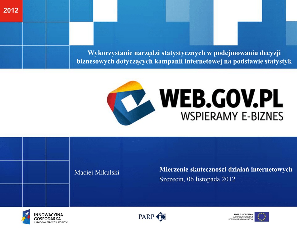 2012 Wykorzystanie narzędzi statystycznych w podejmowaniu decyzji biznesowych dotyczących kampanii internetowej na podstawie statystyk Maciej Mikulski Mierzenie skuteczności działań internetowych Szczecin, 06 listopada 2012 Mierzenie skuteczności działań internetowych, Szczecin. 06.11.2012 Dorfin Sp. z o.o. •dotacje dla przedsiębiorstw •e-biznes •wsparcie dla jednostek samorządu terytorialnego Maciej Mikulski •e-marketing •zarządzanie serwisami internetowymi Mierzenie skuteczności działań internetowych, Szczecin. 06.11.2012 Formy reklamy internetowej Bannery: Baner Billboard skyscraper Video E-mail marketing Social Media Marketing SEM – reklama w wyszukiwarkach SEO - pozycjonowanie Mierzenie skuteczności działań internetowych, Szczecin. 06.11.2012 Modele rozliczeniowe CPM (Cost Per Mille) CPV (Cost Per Visitor) CPC (Cost Per Click) CPA (Cost Per Action) CPV (Cost Per View) CPL (Cost Per Lead) CPL (Cost Per Like) ??? Mierzenie skuteczności działań internetowych, Szczecin. 06.11.2012 Lejek sprzedażowy/marketingowy Mierzenie skuteczności działań internetowych, Szczecin. 06.11.2012 Lejek sprzedażowy/marketingowy??? Mierzenie skuteczności działań internetowych, Szczecin. 06.11.2012 Co możemy zmierzyć? • Poszczególne formy reklamowe • Aktywność użytkowników na naszej stronie, landing page’u • Realizacje celu Mierzenie skuteczności działań internetowych, Szczecin. 06.11.2012 E-mail marketing – przykład analizy Kampania: xbox Odbierz konsolę Xbox 360 Kinect! obrazkowy 352 /lpxbox1 15.06.2011 4946 446 24 23 9 Jak zdobyć Xbox Kinect? tekstowy 354 /lpxbox2 15.06.2011 4993 328 5 7 2 odbieralność: ctr/wysłane ctr odebranych 9.02% 0.49% 5.16% 6.57% 0.10% 2.13% konwersja lp(gA): 39.13% 28.57% Temat: Typ maila: id kampanii: Adres lp: data wysłania: wysłane: odebrane: kliknięcia: odsłony (GA): Akcja na stronie: Mierzenie skuteczności działań internetowych, Szczecin. 06.11.2012 Reklama odsłonowa – przykład analizy Data: 18 czerwca 19 czerwca /lptago1 /lptago2 b1-23.png b1-37.png wyświetlenia 245 000 229 000 koszt 34,50 zł 34,50 zł 4 4 CPC 8,63 zł 8,63 zł CTR 0,002% 0,002% wejścia (gA) 6 5 akcje (gA) 1 0 konwersja 16.67% 0 lp: kreacja kliknięcia Landing page kliknięcia Witryna: xyz 2 2 zyx 1 0 yxz 1 2 Mierzenie skuteczności działań internetowych, Szczecin. 06.11.2012 AdWords – przykład statystyk Stan słowa Słowo kluczowego kluczowe aktywne aktywne aktywne Grupa Maks. Kliknię Wyświe Śr. Kampania reklam CPC cia tlenia CTR Śr. CPC Koszt pozycja slowa_ogol "krzesła" ne Krzesła 0,95 279 5699 4,90% 0,74 207,19 2,51 "różowe slowa_ogol krzesła" ne Krzesła 0,95 1 17 5,88% 0,86 0,86 3,82 "niebieskie slowa_ogol krzesła" ne Krzesła 0,95 3 43 6,98% 0,86 2,59 3,05 Mierzenie skuteczności działań internetowych, Szczecin. 06.11.2012 Śledzenie kampanii w Google Analytics 1. Definiujemy linki w Narzędziu do budowania linków Mierzenie skuteczności działań internetowych, Szczecin. 06.11.2012 Śledzenie różnych typów kampanii w Google Analytics Mierzenie skuteczności działań internetowych, Szczecin. 06.11.2012 Eksport z Google Analytics Mierzenie skuteczności działań internetowych, Szczecin. 06.11.2012 Skuteczność konwersji Landing page Testy A/B i wielowariantowe • Google Website Optimizer/Google Eksperymenty • Visual Website Optimizer Heatmaps • Visual Website Optimizer • Open Source Click Heatmap Tools Mierzenie skuteczności działań internetowych, Szczecin. 06.11.2012 Integracja danych o kampanii w jednym arkuszu Mierzenie skuteczności działań internetowych, Szczecin. 06.11.2012 Analiza i porównanie skuteczności Mierzenie skuteczności działań internetowych, Szczecin. 06.11.2012 Narzędzia Google Analytics Visual Website Optimizer Excel (Google Docs) Mierzenie skuteczności działań internetowych, Szczecin. 06.11.2012 Automatyzacja? Google Analytics API Google Analytics App Gallery Hurtownie danych Mierzenie skuteczności działań internetowych, Szczecin. 06.11.2012 Dziękuję za uwagę Maciej Mikulski [email protected] Dorfin Sp. z o.o. www.dorfin.pl