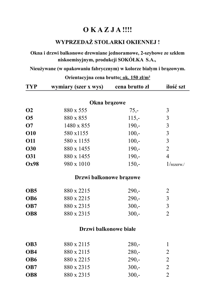 O K A Z J A !!!! WYPRZEDAŻ STOLARKI OKIENNEJ ! Okna i drzwi balkonowe drewniane jednoramowe, 2-szybowe ze szkłem niskoemisyjnym, produkcji SOKÓŁKA S.A., Nieużywane (w opakowaniu fabrycznym) w kolorze białym i brązowym. Orientacyjna cena brutto: ok. 150 zł/m² TYP wymiary (szer x wys) cena brutto zł ilość szt Okna brązowe O2 O5 O7 O10 O11 O30 O31 Ox98 880 x 555 880 x 855 1480 x 855 580 x1155 580 x 1155 880 x 1455 880 x 1455 980 x 1010 75,115,190,100,100,190,190,150,- 3 3 3 3 3 2 4 1/rezerw./ Drzwi balkonowe brązowe OB5 OB6 OB7 OB8 880 x 2215 880 x 2215 880 x 2315 880 x 2315 290,290,300,300,- 2 3 3 2 Drzwi balkonowe białe OB3 OB4 OB6 OB7 OB8 880 x 2115 880 x 2115 880 x 2215 880 x 2315 880 x 2315 280,280,290,300,300,- 1 2 2 2 2 TYP wymiary (szer x wys) cena brutto zł ilość szt Okna białe O2 O4 O5U O5UR O5UR O7 O7 O10 O11 O14 O15 O18 O19 O32 O36 O37 880 x 555 580 x 855 880 x 855 880 x 855 880 x 855 1480 x 855 1480 x 855 580 x 1155 580 x 1155 880 x 1155 880 x 1155 1480 x 1155 1480 x 1155 1180 x 1455 1780 x 1455 1780 x 1455 75,75,115,115,115,190,190,100,100,155,155 255,255,260 390,390,- 1 2 1 4P 3L 4P 4L 4 2 2 2 4 4 1 2 2 O K A Z J A !!!! WYPRZEDAŻ DRZWI WEWNĘTRZNYCH ! W ofercie skrzydła drzwiowe o konstrukcji z drewnianej sosnowej ramy, wypełnionej materiałem stabilizującym („plaster miodu”), oklejone obustronnie płytami prasowanymi, wykończone farbami kryjącymi w różnych kolorach, wyposażone w zawiasy i zamek, w skrzydłach przeszklonych szkło ornamentowe: OPIS CENA BRUTTO zł Skrzydła z płyty gładkiej – białe - 40, Skrzydła z płyty profilowanej, w różnych kolorach (biel, ciemny brąz, niebieski, zielony, żółty), pełne i przeszklone, do pokoju i łazienek - 80, Skrzydła z płyty profilowanej, w różnych kolorach, przeszklone z witrażem - 150,-