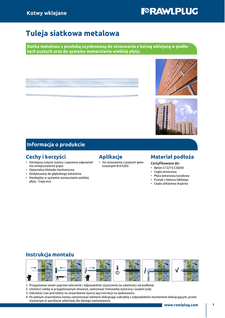 Kotwy wklejane Tuleja siatkowa metalowa Siatka metalowa z powłoką ocynkowaną do stosowania z kotwą wklejaną w podło żach pustych oraz do systemu wzmacniania wielkiej płyty. Informacja o produkcie Cechy i korzyści Aplikacje Materiał podłoża • Zmniejsza zużycie żywicy i zapewnia odpowied nie umiejscowienie pręta • Optymalna blokada mechaniczna • Dedykowany do głębokiego kotwienia • Niezbędny w systemie wzmacniania wielkiej płyty - Copy-eco • Do stosowania z prętami gwin towanymi R-STUDS Certyfikowane do: • • • • • Beton C12/15-C50/60 Cegła otworowa Płyta betonowa kanałowa Pustak z betonu lekkiego Cegła silikatowa drążona Instrukcja montażu 1.Przygotować otwór poprzez wiercenie i odpowiednie czyszczenie (w zależności od podłoża). 2.Umieścić siatkę w przygotowanym otworze, zadozować mieszankę żywiczną i osadzić pręt. 3.Odczekać czas potrzebny na utwardzenie żywicy wg instrukcji na opakowaniu. 4.Po pełnym utwardzeniu kotwy zamontować element dokręcając nakrętkę z odpowiednim momentem dokręcającym, przed stawionym w aprobacie właściwej dla danego zastosowania. www.rawlplug.com 1 Kotwy wklejane Informacja o produkcie Średnica Długość d L [mm] [mm] Średnica pręta Rozmiar Produkt [mm] Ø 12 SP-CE-R08 12 1000 8 Ø 14 SP-CE-R10 14 1000 10 Ø 16 SP-CE-R12 16 1000 12 Ø 20 SP-CE-R16 20 1000 16 Ø 24 SP-CE-R20 24 1000 20 Dane logistyczne Ilość [szt] Roz miar Produkt Ø 12 Ø 14 Waga [kg] Średnica [mm] Długość [mm] SP-CE-R08 12 1000 10 10 5430 0.64 0.64 375.3 5906675266138 SP-CE-R10 14 1000 10 10 1500 0.56 0.56 113.3 5906675610122 Ø 16 SP-CE-R12 16 1000 10 10 1110 0.66 0.66 103.3 5906675610320 Ø 20 SP-CE-R16 20 1000 10 10 384 1.29 1.29 79.5 5906675610528 Ø 24 SP-CE-R20 24 1000 5 5 280 0.57 0.57 61.6 5906675610726 Opakowa Opakowa nie jednost nie zbiorcze kowe Paleta Opakowa Opakowa nie jednost nie zbiorcze kowe Kody ean Paleta www.rawlplug.com 2