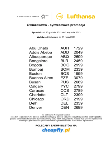 Gwiazdkowo - sylwestrowa promocja Sprzedaż: od 20 grudnia 2012 do 2 stycznia 2013 Wyloty: od 5 stycznia do 31 maja 2013 Abu Dhabi Addis Abeba Albuquerque Bangalore Bogota Bombaj Boston Buenos Aires Busan Calgary Caracas Charlotte Chicago Delhi Denver AUH ADD ABQ BLR BOG BOM BOS EZE PUS YYC CCS CLT ORD DEL DEN 1729 2049 2699 2459 2999 2339 1999 3079 2669 2799 2789 2399 2199 2339 2699 nie później niż 7 dni przed wylotem cena tam i z powrotem; nie zawiera opłaty transakcyjnej; zawiera wszystkie wszystkie pozostałe opłaty i podatki; podana cena może ulec zmianie z powodu zmiany kursu walut, trasy przelotu, miejsca i/lub sposobu wystawienia biletu i jest gwarantowana tylko w momencie wystawienia biletu; liczba miejsc ograniczona POLECAMY ZAKUP BILETÓW NA Gwiazdkowo - sylwestrowa promocja Sprzedaż: od 20 grudnia 2012 do 2 stycznia 2013 Wyloty: od 5 stycznia do 31 maja 2013 Dubaj Hongkong Honolulu Houston Johannesburg Lagos Las Vegas Los Angeles Maskat Mexico City Montreal Nagoja Nanjing Nowy Jork Osaka DXB HKG HNL IAH JNB LOS LAS LAX MCT MEX YUL NGO NKG NYC KIX 1729 2419 3599 2499 2459 2549 2499 2699 2179 2899 2199 2869 2259 2099 2869 nie później niż 7 dni przed wylotem cena tam i z powrotem; nie zawiera opłaty transakcyjnej; zawiera wszystkie wszystkie pozostałe opłaty i podatki; podana cena może ulec zmianie z powodu zmiany kursu walut, trasy przelotu, miejsca i/lub sposobu wystawienia biletu i jest gwarantowana tylko w momencie wystawienia biletu; liczba miejsc ograniczona POLECAMY ZAKUP BILETÓW NA Gwiazdkowo - sylwestrowa promocja Sprzedaż: od 20 grudnia 2012 do 2 stycznia 2013 Wyloty: od 5 stycznia do 31 maja 2013 Pekin Qingdao Rio de Janeiro Sao Paulo Seattle Seul Shenyang Singapur Szanghaj Tampa Tokio Toronto Vancouver Waszyngton PEK TAO GIG GRU SEA ICN SHE SIN PVG TPA NRT YYZ YVR IAD 2259 2259 2669 2999 2599 2589 2259 2459 2459 2599 2959 2299 2699 2399 nie później niż 7 dni przed wylotem cena tam i z powrotem; nie zawiera opłaty transakcyjnej; zawiera wszystkie wszystkie pozostałe opłaty i podatki; podana cena może ulec zmianie z powodu zmiany kursu walut, trasy przelotu, miejsca i/lub sposobu wystawienia biletu i jest gwarantowana tylko w momencie wystawienia biletu; liczba miejsc ograniczona POLECAMY ZAKUP BILETÓW NA