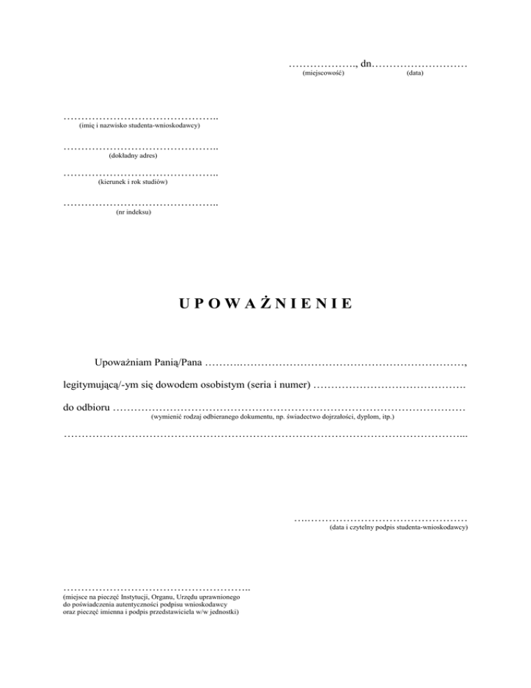 ………………., dn……………………… (miejscowość) (data) …………………………………….. (imię i nazwisko studenta-wnioskodawcy) …………………………………….. (dokładny adres) …………………………………….. (kierunek i rok studiów) …………………………………….. (nr indeksu) UPOWAŻNIENIE Upoważniam Panią/Pana ……….………………………………………………………, legitymującą/-ym się dowodem osobistym (seria i numer) ……………………………………. do odbioru ……………………………………………………………………………………… (wymienić rodzaj odbieranego dokumentu, np. świadectwo dojrzałości, dyplom, itp.) …………………………………………………………………………………………………... ….……………………………………… (data i czytelny podpis studenta-wnioskodawcy) …………………………………………….. (miejsce na pieczęć Instytucji, Organu, Urzędu uprawnionego do poświadczenia autentyczności podpisu wnioskodawcy oraz pieczęć imienna i podpis przedstawiciela w/w jednostki)