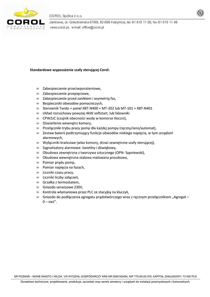 Standardowe wyposażenie szafy sterującej Corol: • • • • • • • • • • • • • • • • • • • • • • Zabezpieczenie przeciwporażeniowe, Zabezpieczenie przepięciowe, Zabezpieczenie przed zanikiem i asymetrią faz, Bezpieczniki obwodów pomocniczych, Sterownik Twido + panel XBT-N400 + MT-202 lub MT-101 + XBT-N401 Układ rozruchowy powyżej 4kW softstart, lub falowniki CPW2zC (czujnik obecności wody w komorze tłoczni), Oświetlenie wewnątrz komory, Przełączniki trybu pracy pomp dla każdej pompy (ręczny/zero/automat), Zestaw baterii podtrzymujący funkcje obwodów niskiego napięcia, w tym urządzeń alarmowych, Wyłączniki krańcowe (właz komory, drzwi zewnętrzne szafy sterującej), Sygnalizatory alarmowe: świetlny i dźwiękowy, Obudowa zewnętrzna z tworzywa sztucznego (OPN- Sypniewski), Obudowa wewnętrzna stalowa malowana proszkowo, Pomiar prądu pomp, Pomiar napięcia na fazach, Liczniki czasu pracy, Liczniki liczby załączeń, Grzałka z termostatem, Gniazdo serwisowe 230V, Kontrola włamaniowa przez PLC ze stacyjką na kluczyk, Gniazdo do podłączenia agregatu prądotwórczego wraz z ręcznym przełącznikiem „Agregat – 0 – sieć”. SR POZNAŃ – NOWE MIASTO I WILDA, VIII WYDZIAŁ GOSPODARCZY KRS NR 0000183494, NIP 779-00-20-376, KAPITAŁ ZAKŁADOWY: 73 500 PLN Doradztwo techniczne, projektowanie, produkcja, sprzedaż oraz serwis armatury i urządzeń do instalacji przemysłowych i komunalnych.