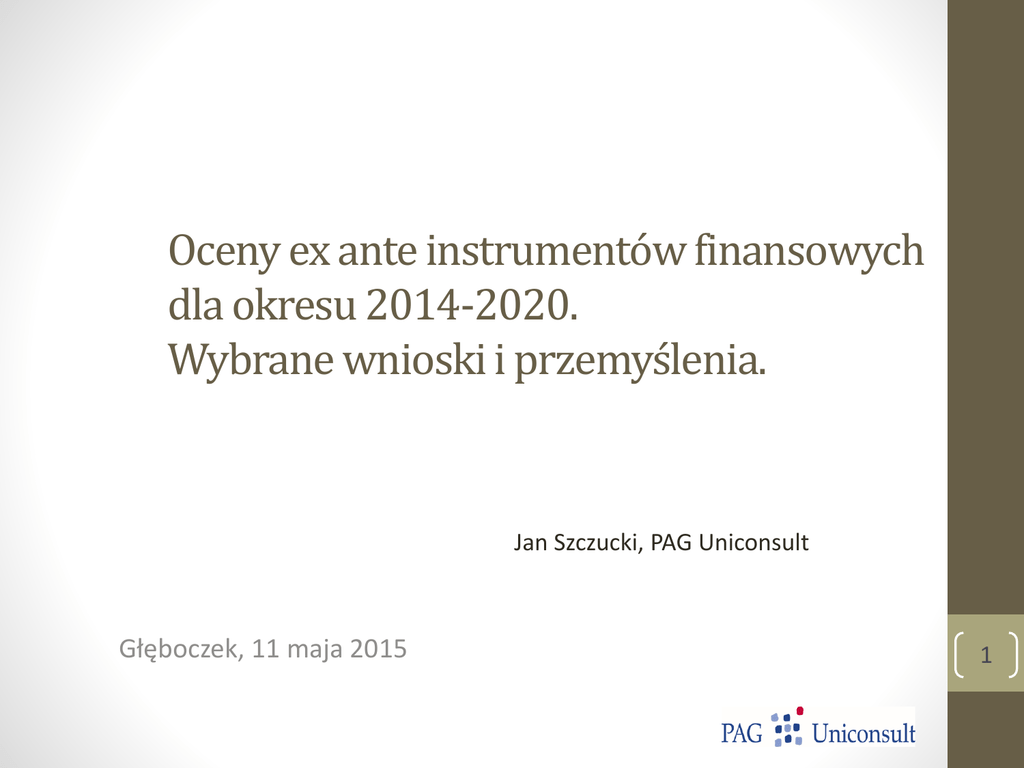 Oceny ex ante instrumentów finansowych dla okresu 2014-2020. Wybrane wnioski i przemyślenia. Jan Szczucki, PAG Uniconsult Głęboczek, 11 maja 2015 1 Wymóg przygotowania analiz ex ante instrumentów finansowych • Jest to nowy wymóg, wprowadzony na mocy art. 37 ust. 2 nowego Rozporządzenia Ogólnego (rozp. 1303/2013). • Zgodnie z nim ocena obejmuje: • analizę zawodności mechanizmów rynkowych, nieoptymalnego poziomu inwestycji oraz potrzeb inwestycyjnych w obszarach polityki i celów tematycznych lub priorytetów inwestycyjnych. • ocenę wartości dodanej instrumentów finansowych, które mają być wspierane z EFSI, spójności z innymi formami interwencji publicznej na tym samym rynku, ewentualnych konsekwencji w zakresie pomocy państwa, proporcjonalności planowanej interwencji i środków minimalizowania zakłóceń rynku; • szacunki dotyczące dodatkowych zasobów publicznych i prywatnych, które mogą zostać potencjalnie zgromadzone w ramach instrumentu finansowego aż do poziomu ostatecznego odbiorcy (oczekiwany efekt dźwigni); • ocenę doświadczeń zdobytych podczas stosowania podobnych instrumentów i ocen ex ante przeprowadzonych w przeszłości przez państwo członkowskie, a także w jaki sposób te doświadczenia zostaną zastosowane w przyszłości; • proponowaną strategię inwestycyjną, w tym analizę opcji wdrożeniowych w znaczeniu wynikającym z art. 38, produkty finansowe, które mają zostać zaoferowane, docelowych ostatecznych odbiorców, i – w stosownych przypadkach – zakładane łączenie ze wsparciem dotacyjnym; • wyszczególnienie spodziewanych rezultatów i jak dany instrument finansowy ma przyczyniać się do wniesienia wkładu w osiąganie konkretnych celów ustanowionych w ramach właściwego priorytetu, w tym wskaźniki dla takiego wkładu; • przepisy pozwalające na przegląd i uaktualnienie, w miarę potrzeb, oceny ex ante podczas wdrażania. • 2 Dotychczas zrealizowane oceny ex anteinstrumentów finansowych Program Status Wykonawca PO IR Ukończona WYG PSDB PO IR (opcjonalnie RPO) ryzyko gwarancji Ukończona PAG Uniconsult PO WER - młodzi Ukończona IBS, Coffey PO IiŚ Ukończona Bank Światowy PO WER – ekonomia społeczna ryzyko gwarancji W trakcie PAG Uniconsult RPO dolnośląskie W trakcie PAG Uniconsult, IMAPP RPO kujawsko-pomorskie Ukończona PAG Uniconsult, IMAPP RPO lubuskie Ukończona? Agrotec RPO lubelskie Ukończona, powtarzana Ecorys/Agrotec ???? RPO łódzkie Ukończona IBS, Coffey, PAG Uniconsult 3 Dotychczas zrealizowane oceny ex anteinstrumentów finansowych Program Status Wykonawca RPO małopolskie Ukończona W trakcie Ecorys, Taylor Economics PAG Uniconsult, IMAPP RPO mazowieckie Ukończona WYG PSDB RPO opolskie Ukończona Agrotec RPO podkarpackie Ukończona WYG PSDB RPO podlaskie Brak ---- RPO pomorskie Ukończony I etap, II etap w trakcie IMAPP, PAG Uniconsult RPO śląskie Ukończona ASM RPO świętokrzyskie Ukończona WYG PSDB RPO warmińsko-mazurskie Ukończona W trakcie WYG PSDB Agrotec RPO wielkopolskie W trakcie IMAPP, PAG Uniconsult RPO zachodniopomorskie Ukończona IMAPP, PAG Uniconsult 4 Konieczność przygotowywania oceny ryzyka gwarancji • Konieczność przygotowywania oceny ryzyka dla instrumentów poręczeniowych/gwarancyjnych wynika z nowych uregulowań prawnych dla funduszy strukturalnych UE na okres 2014-2020. • Regulacje prawne (Rozporządzenia Ogólne i tzw. Rozporządzenie Delegowane) wymagają przygotowanie oddzielnej oceny ex ante, uzupełniającej ocenę ex ante instrumentów finansowych, spodziewanego i niespodziewanego poziomu ryzyka, czyli wysokości środków finansowych wystarczających do zagwarantowania określonej wartości kredytów/pożyczek i pokrycia związanych z nimi wypłat. • Na podstawie oceny ex ante ryzyka ustanawiany jest odpowiedni współczynnik mnożnikowy, który rozumiany jest jako wielokrotność kwoty wkładu z programu, przeznaczonej na pokrycie spodziewanych i niespodziewanych strat z nowych pożyczek lub innych instrumentów podziału ryzyka, które mają być pokryte z gwarancji w stosunku do wartości odpowiednich wypłaconych nowych pożyczek lub innych instrumentów podziału ryzyka. 5 Nowe podejście do przekazywania środków na działalność poręczeniową Zgodnie z art. 8 Rozporządzenia Delegowanego (480/2014): • a) należy osiągnąć odpowiedni współczynnik mnożnikowy między kwotą wkładu z programu przeznaczoną na pokrycie spodziewanych i niespodziewanych strat z nowych pożyczek lub innych instrumentów podziału ryzyka, które mają być pokryte z gwarancji, a wartością odpowiednich wypłaconych nowych pożyczek lub innych instrumentów podziału ryzyka; • b) współczynnik mnożnikowy ustala się w oparciu o ostrożną ocenę ex ante ryzyka dla konkretnego oferowanego produktu gwarancyjnego, uwzględniając szczególne warunki rynkowe, strategię inwestycyjną instrumentu finansowego oraz zasady oszczędności i efektywności. • c) wkład z programu przeznaczony na dotrzymanie zobowiązań wynikających z gwarancji odzwierciedla taką ocenę ex ante ryzyka; • d)jeśli pośrednik finansowy lub jednostka korzystająca z gwarancji nie przeznaczyli planowanej kwoty nowych pożyczek lub innych instrumentów podziału ryzyka na rzecz odbiorców ostatecznych, kwalifikowalne wydatki powinny zostać proporcjonalnie pomniejszone. 6 Konsekwencje nowego podejścia do przekazywania środków strukturalnych na działalność gwarancyjną/poręczeniową • Ograniczenie wartości środków niezbędnych do udzielenia określonej wartości poręczeń/gwarancji – bardziej efektywne wykorzystanie środków publicznych. • Z drugiej strony podejście wymusza w wielu przypadkach konieczność stosowania limitu wypłat tzw. „cap”, powodującego spadek atrakcyjności poręczeń z punktu widzenia banków. • Wyliczanie limitów kosztów zarządzania od wartości przekazanych środków europejskich – znacznie mniej korzystn