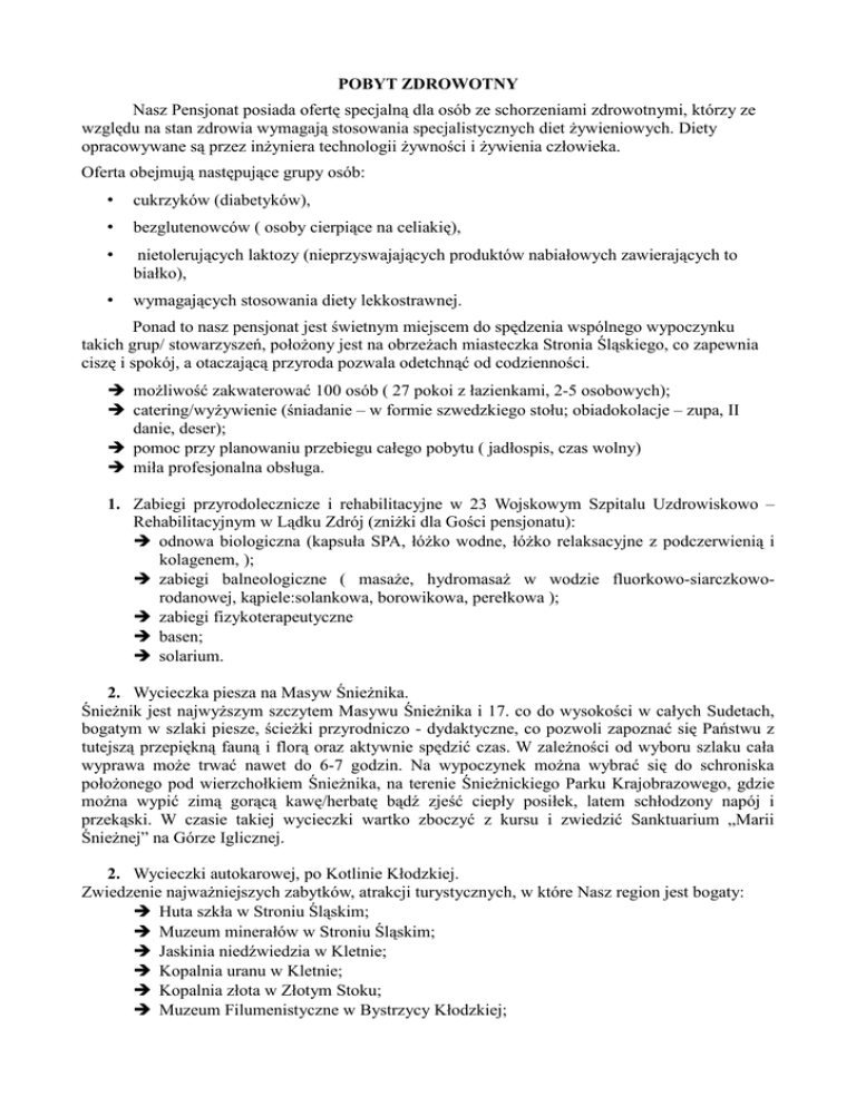 POBYT ZDROWOTNY Nasz Pensjonat posiada ofertę specjalną dla osób ze schorzeniami zdrowotnymi, którzy ze względu na stan zdrowia wymagają stosowania specjalistycznych diet żywieniowych. Diety opracowywane są przez inżyniera technologii żywności i żywienia człowieka. Oferta obejmują następujące grupy osób: • cukrzyków (diabetyków), • bezglutenowców ( osoby cierpiące na celiakię), • nietolerujących laktozy (nieprzyswajających produktów nabiałowych zawierających to białko), • wymagających stosowania diety lekkostrawnej. Ponad to nasz pensjonat jest świetnym miejscem do spędzenia wspólnego wypoczynku takich grup/ stowarzyszeń, położony jest na obrzeżach miasteczka Stronia Śląskiego, co zapewnia ciszę i spokój, a otaczającą przyroda pozwala odetchnąć od codzienności. ➔ możliwość zakwaterować 100 osób ( 27 pokoi z łazienkami, 2-5 osobowych); ➔ catering/wyżywienie (śniadanie – w formie szwedzkiego stołu; obiadokolacje – zupa, II danie, deser); ➔ pomoc przy planowaniu przebiegu całego pobytu ( jadłospis, czas wolny) ➔ miła profesjonalna obsługa. 1. Zabiegi przyrodolecznicze i rehabilitacyjne w 23 Wojskowym Szpitalu Uzdrowiskowo – Rehabilitacyjnym w Lądku Zdrój (zniżki dla Gości pensjonatu): ➔ odnowa biologiczna (kapsuła SPA, łóżko wodne, łóżko relaksacyjne z podczerwienią i kolagenem, ); ➔ zabiegi balneologiczne ( masaże, hydromasaż w wodzie fluorkowo-siarczkoworodanowej, kąpiele:solankowa, borowikowa, perełkowa ); ➔ zabiegi fizykoterapeutyczne ➔ basen; ➔ solarium. 2. Wycieczka piesza na Masyw Śnieżnika. Śnieżnik jest najwyższym szczytem Masywu Śnieżnika i 17. co do wysokości w całych Sudetach, bogatym w szlaki piesze, ścieżki przyrodniczo - dydaktyczne, co pozwoli zapoznać się Państwu z tutejszą przepiękną fauną i florą oraz aktywnie spędzić czas. W zależności od wyboru szlaku cała wyprawa może trwać nawet do 6-7 godzin. Na wypoczynek można wybrać się do schroniska położonego pod wierzchołkiem Śnieżnika, na terenie Śnieżnickiego Parku Krajobrazowego, gdzie można wypić zimą gorącą kawę/herbatę bądź zjeść ciepły posiłek, latem schłodzony napój i przekąski. W czasie takiej wycieczki wartko zboczyć z kursu i zwiedzić Sanktuarium „Marii Śnieżnej” na Górze Iglicznej. 2. Wycieczki autokarowej, po Kotlinie Kłodzkiej. Zwiedzenie najważniejszych zabytków, atrakcji turystycznych, w które Nasz region jest bogaty: ➔ Huta szkła w Stroniu Śląskim; ➔ Muzeum minerałów w Stroniu Śląskim; ➔ Jaskinia niedźwiedzia w Kletnie; ➔ Kopalnia uranu w Kletnie; ➔ Kopalnia złota w Złotym Stoku; ➔ Muzeum Filumenistyczne w Bystrzycy Kłodzkiej; ➔ Pozostałości murów obronnych w Bystrzycy Kłodzkiej ( Baszta Kłodzka, Brama Wodna, Wieża Rycerska); ➔ Twierdza Kłodzka w Kłodzku; ➔ Ogród bajek w Międzygórzu; ➔ Pijalnia wód, kolorowa fontanna w Polanicy Zdrój; 3. Dla aktywnych: ➔ spływy pontonowe w Bardzie na 15 kilometrowym odcinku Ławica - Bardo po Nysie Kłodzkiej (zniżki dla Gości pensjonatu); ➔ wypad do Parku Linowego w Kletnie. W Parku tym znajdują się trasy rozwieszone na rożnych poziomach o zróżnicowanym stopniu trudności ( od najłatwiejszej dla dzieci do trudnych dla osób lubiących ryzyko i chcących się sprawdzić); ➔ wypad do Złotego Stoku, gdzie organizowane są gry w paintball (zniżki dla Gości pensjonatu); ➔ wycieczki rowerowe po okolicznych górach. 4. Urządzenie grilla (grillowanie rozmaitości kulinarnych na ruszcie - karczek, schab, kiełbasa, kaszanka, warzywa, pieczywo) oraz ogniska (smażenie kiełbasek na ognisku, a jeśli ktoś lubi pieczenie ziemniaków w popiele ogniskowym) połączone z wieczornym/nocnym biesiadowaniem na świeżym powietrzu w hotelowym ogrodzie. 5. Urządzenie wieczorku zapoznawczo/tanecznego z muzyką (możliwość udostępnienia sprzętu do odtwarzania muzyki) i przekąskami ( na zimno i ciepło, stolik kawowy- kawa, herbata, ciasto); W programie można uwzględnić również wszelkie sugestie Państwa odnośnie wyglądu pobytu w Naszym pensjonacie. W samym pensjonacie do dyspozycji gości pozostaje: • sala rekreacyjna (pokój dzienny) z tarasem z widokiem na Czarną Górę ( dostęp do czajnika bezprzewodowego); • stół bilardowy ( w cenie pobytu); • 2 stoły tenisowe ( w cenie pobytu); • 2 stoły do gry w piłkarzyki ( w cenie pobytu); • dostęp do bezprzewodowego internetu wi fi na terenie hotelu; • bufet; • ogród z miejscem na ognisko i grillem; • wypożyczalnia kijków trekingowych. • monitorowany parking (w cenie pobytu); Cennik uzależniony jest od liczy osób, długości pobytu oraz zadeklarowanych atrakcji przez organizatora, które będą miały się odbyć. STANDARDOWY CENNIK: • nocleg 45 zł/osobę/dobę bez wyżywienia • jednorazowy koszt wyżywienia: śniadanie (stół szwedzki) - 15-25 zł/osobę; obiadokolacja (zupa, II danie, deser) 25-35 zł/osobę; • + atrakcje organizowane w pensjonacie i poza nim. SERDECZNIE ZAPRASZAMY DO NA WYPOCZYNEK W GÓRSKIEJ DOLINIE!!!