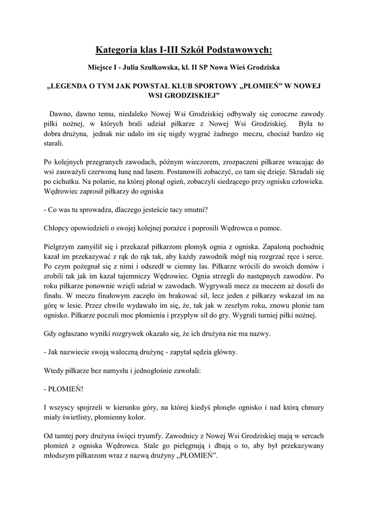 Kategoria klas I-III Szkół Podstawowych: Miejsce I - Julia Szułkowska, kl. II SP Nowa Wieś Grodziska „LEGENDA O TYM JAK POWSTAŁ KLUB SPORTOWY „PŁOMIEŃ” W NOWEJ WSI GRODZISKIEJ” Dawno, dawno temu, niedaleko Nowej Wsi Grodziskiej odbywały się coroczne zawody piłki nożnej, w których brali udział piłkarze z Nowej Wsi Grodziskiej. Była to dobra drużyna, jednak nie udało im się nigdy wygrać żadnego meczu, chociaż bardzo się starali. Po kolejnych przegranych zawodach, późnym wieczorem, zrozpaczeni piłkarze wracając do wsi zauważyli czerwoną łunę nad lasem. Postanowili zobaczyć, co tam się dzieje. Skradali się po cichutku. Na polanie, na której płonął ogień, zobaczyli siedzącego przy ognisku człowieka. Wędrowiec zaprosił piłkarzy do ogniska - Co was tu sprowadza, dlaczego jesteście tacy smutni? Chłopcy opowiedzieli o swojej kolejnej porażce i poprosili Wędrowca o pomoc. Pielgrzym zamyślił się i przekazał piłkarzom płomyk ognia z ogniska. Zapaloną pochodnię kazał im przekazywać z rąk do rąk tak, aby każdy zawodnik mógł nią rozgrzać ręce i serce. Po czym pożegnał się z nimi i odszedł w ciemny las. Piłkarze wrócili do swoich domów i zrobili tak jak im kazał tajemniczy Wędrowiec. Ognia strzegli do następnych zawodów. Po roku piłkarze ponownie wzięli udział w zawodach. Wygrywali mecz za meczem aż doszli do finału. W meczu finałowym zaczęło im brakować sił, lecz jeden z piłkarzy wskazał im na górę w lesie. Przez chwile wydawało im się, że, tak jak w zeszłym roku, znowu płonie tam ognisko. Piłkarze poczuli moc płomienia i przypływ sił do gry. Wygrali turniej piłki nożnej. Gdy ogłaszano wyniki rozgrywek okazało się, że ich drużyna nie ma nazwy. - Jak nazwiecie swoją waleczną drużynę - zapytał sędzia główny. Wtedy piłkarze bez namysłu i jednogłośnie zawołali: - PŁOMIEŃ! I wszyscy spojrzeli w kierunku góry, na której kiedyś płonęło ognisko i nad którą chmury miały świetlisty, płomienny kolor. Od tamtej pory drużyna święci tryumfy. Zawodnicy z Nowej Wsi Grodziskiej mają w sercach płomień z ogniska Wędrowca. Stale go pielęgnują i dbają o to, aby był przekazywany młodszym piłkarzom wraz z nazwą drużyny „PŁOMIEŃ”. Miejsce II - Julia Szczawińska, kl. II SP Sędzimirów „LEGENDA O DZWONIE Z KOŚCIOŁA W SĘDZIMIROWIE” Sędzimirów to mała wieś położona na Przedgórzu Sudeckim. Mieszkańcy tej wsi to ludzie dobrzy i pracowici. W środku wsi stoi kościół. W Sędzimirowie był kościół zabytkowy, który dawno temu się spalił. Na wieży był piękny, duży dzwon, którego głos zwoływał mieszkańców wsi na mszę. W czasie pożaru się stopił i nic z niego nie zostało. Mieszkańcy postanowili odbudować na nowo nasz kościół. Był to dla nich wielki wysiłek, ale się udało. Jednak w kościele długo nie było dzwonu. Pewnej nocy jednej pani, pobożnej mieszkance Sędzimirowa, śnił się dzwon. Widziała i słyszała jak pięknie dzwonił na całą okolicę. Zaraz rano opowiedziała o tym wszystkim ludziom. Ludzie zastanawiali się, co mógł oznaczać ten sen. Kobieta cały czas myślała o swoim śnie, lecz nikt nie umiał jej wytłumaczyć, co on oznacza. Pewnego wieczoru wybrała się sama do kościoła, aby się pomodlić. W pewnym momencie usłyszała bicie dzwonu, którego przecież nie było i wtedy pomyślała, że to musi być jakiś znak. Na drugi dzień postanowiła, że sama kupi dzwon. Zaczęła oszczędzać pieniądze. Po wielu latach miała już tyle, że wystarczyło na kupno dzwonu. Kiedy uroczyście zawieszono nowy dzwon na wieży, wszyscy się cieszyli. Dziś w Sędzimirowie można zobaczyć nie tylko nowy, odbudowany po pożarze kościół, ale jest w nim też nowy dzwon, którego głos niesie się srebrzyście po okolicy. Miejsce III - Milenia Zakaszewska, kl. II SP Nowa Wieś Grodziska „LEGENDA O KRZYŻU POKUTNYM” Nowa Wieś Grodziska leży w dolinie na Pogórzu Kaczawskim. Otoczona jest polami i lasami. W środku wsi, przy drodze stoi kamienny krzyż pokutny. Historia mówi, że takie krzyże zrobił własnoręcznie ktoś, kto zabił drugiego człowieka, aby odkupić swoją winę. A było to dawno temu, kiedy na świecie żyli królowie, rycerze i biedni chłopi. Niedaleko w drewnianej chatce mieszkał biedny chłop z rodziną i małą krówką. Chłop bardzo kochał swoje zwierzę, żywiła przecież całą jego dużą rodzinę. Pewnego letniego dnia rycerz jechał na koniu do swojej ukochanej, gdy nagle chłop ze swoją krową przeszedł mu drogę. Koń nastraszył się i tak skoczył, że rycerz upadł na ziemię. Rycerz wstał strasznie zły i wściekły. Krzyczał! - Za tę zniewagę poniesiesz karę, zabieram ci tę krowę! Chłop przepraszał: - Przebacz mi, zrobię dla ciebie wszystko, ale nie zabieraj mi Mućki. Zły rycerz zaśmiał się szyderczo: - Milcz chłopie, pewnie, że Ci jej nie zabiorę, po co mi taka stara krowa, co ledwo chodzi i tak machnął mieczem, jakby chciał ją zabić. Biedny chłop, aby uchronić Mućkę, zasłonił ją własną piersią. Zginął na miejscu. Rycerz był w szoku, bo nie chciał go pozbawić życia, a tak się stało. Zrozpaczony modlił się długo i wykuł z kamienia krzyż, który postawił na tym miejscu. Zaopiekował się też rodziną biednego chłopa, a także jego Mućką, która pasła się spokojnie na pięknej łące i pewnie wiedziała, co się stało. Od tego czasu w tym gospodarstwie zawsze dobre życie miały krowy, a ludzie stojąc pod krzyżem wspominają i tworzą legendy. Miejsce IV - Nadia Orłowska, kl. II SP Nowa Wieś Grodziska „LEGENDA O MŁODYM DĘBIE W NOWEJ WSI GRODZISKIEJ” Nowa Wieś Grodziska leży na Przedgórzu Sudeckim. Otoczona jest wzgórzami porośniętymi lasem. W środku wsi rośnie stare drzewo. Jest to duży, rozłożysty dąb. Dawno temu mieszkał w Nowej Wsi Grodziskiej biedny chłopiec. Nie miał niczego, ale by