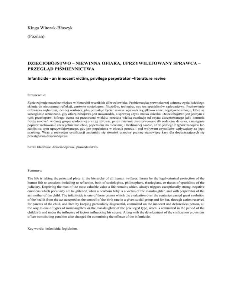 Kinga Witczak-Błoszyk (Poznań) DZIECIOBÓJSTWO – NIEWINNA OFIARA, UPRZYWILEJOWANY SPRAWCA – PRZEGLĄD PIŚMIENNICTWA Infanticide - an innocent victim, privilege perpetrator –literature revive Streszczenie: Życie zajmuje naczelne miejsce w hierarchii wszelkich dóbr człowieka. Problematyka prawnokarnej ochrony życia ludzkiego skłania do nieustannej refleksji, zarówno socjologów, filozofów, teologów, czy tez specjalistów sądownictwa. Pozbawienie człowieka najbardziej cennej wartości, jaką pozostaje życie, zawsze wyzwala wyjątkowo silne, negatywne emocje, które są szczególnie wzmożone, gdy ofiarą zabójstwa jest noworodek, a sprawcą czynu matka dziecka. Dzieciobójstwo jest jednym z tych przestępstw, którego ocena na przestrzeni wieków przeszła wielką ewolucję od czynu akceptowanego jako kontrola liczby urodzeń w danej grupie społecznej oraz jej zdrowia, przez działanie zarezerwowane dla rodziców dziecka, a następnie poprzez zachowanie szczególnie haniebne, popełnione na niewinnej i bezbronnej osobie, aż do jednego z typów zabójstw lub zabójstwa typu uprzywilejowanego, gdy jest popełnione w okresie porodu i pod wpływem czynników wpływający na jego przebieg. Wraz z rozwojem cywilizacji zmieniały się również przepisy prawne stanowiące kary dla dopuszczających się przestępstwa dzieciobójstwa. Słowa kluczowe: dzieciobójstwo, prawodawstwo. Summary: The life is taking the principal place in the hierarchy of all human welfares. Issues he the legal-criminal protection of the human life to ceaseless including to reflection, both of sociologists, philosophers, theologians, or theses of specialists of the judiciary. Depriving the man of the most valuable value a life remains which, always triggers exceptionally strong, negative emotions which peculiarly are heightened, when a newborn baby is a victim of the manslaughter, and with perpetrator of the act mother of the child. The infanticide is one of these crimes which the evaluation over the centuries passed great evolution of the health from the act accepted as the control of the birth rate in a given social group and for her, through action reserved for parents of the child, and then by keeping particularly disgraceful, committed on the innocent and defenceless person, all the way to one of types of manslaughters or the manslaughter of the privileged type, when is committed in the period of the childbirth and under the influence of factors influencing his course. Along with the development of the civilization provisions of law constituting penalties also changed for committing the offence of the infanticide. Key words: infanticide, legislation. Wstęp: Życie uważane jest współcześnie za najcenniejszą wartość i fundamentalne prawo człowieka, będące podstawą kultury chrześcijańskiej i główną zasadą funkcjonowania społeczeństw. Dlatego każde zabójstwo traktowane jest jako złamanie pierwszorzędnej normy współżycia społecznego, jest czynem powszechnie uważanym za naganny, nieakceptowalny i piętnowany. W ten sposób targnięcie się na życie bliźniego pojmowane jest w przez prawo we wszystkich cywilizowanych państwach, które przewidują w swym Wymiarze Sprawiedliwości najcięższe kary dla sprawców tych działań.1 Dla socjologów i kryminologów zabójstwo stanowi przedmiot wielu badań , będąc jednym z najbardziej interesujących zjawisk społeczno-kryminologicznych. Choć zjawisko to było znane od początków ludzkości i stanowiło przedmiot refleksji myślicieli już w czasach biblijnych, to współczesna kryminologia nadal nie potrafi jednoznacznie odpowiedzieć na pytanie jakie są wykładniki prowadzące do dokonania zbrodni zabójstwa drugiego człowieka.2 Szczególnie postrzegane jest ponad to zabójstwo osoby bezbronnej, niemającej szans na jakikolwiek sprzeciw, której odbiera się prawo do życia już na jego początku, wkrótce po narodzeniu. Przez wielu uważane nie tylko za okrutne przestępstwo, ale wręcz za barbarzyństwo. Zbrodnia dzieciobójstwa, z jednej strony zasługująca na największe potępienie, wzbudzająca ogólne oburzenie i gniew. Z drugiej strony jest szczególnie traktowana w prawie karnym, przewidując dla sprawcy zdecydowanie niższą karę niż dla winnego zwykłej zbrodni zabójstwa.3 Wyróżnia się dwa rodzaje dzieciobójstwa: czynne oznaczające wszystkie czynności dokonane przez matkę, mające na celu zabicie noworodka; bierne, kiedy świadomie matka nie udzieli dziecku niezbędnej pomocy dla utrzymania go przy życiu w następstwie czego dziecko umiera.4 Celem niniejszej pracy jest przedstawienie ewolucji zjawiska dzieciobójstwa na przestrzeni historii rozwoju społeczeństw oraz prawodawstwo polskie dotyczące przestępstwa dzieciobójstwa. Dzieciobójstwo na przestrzeni dziejów. Dzieciobójstwo jest jednym z tych przestępstw, którego ocena na przestrzeni wieków przeszła wielką ewolucję od czynu akceptowanego jako kontrola liczby urodzeń w danej grupie społecznej 1 F. Bolechała, M. Strona, T. Konopka, Modus operandi niepoczytalnych sprawców w zabójstwach Wielokrotnych, ARCH. MED. SĄD. KRYMINOL., 2010, LX, str. 207-215. 2 E. Gałka, Typologia sprawców zabójstw, Wrocławskie Studia Erazmiańskie, Zeszyty Studenckie, 2011, str.63-74 3 B. Świątek, Prawo Medyczne. Dzieciobójstwo, Katedra medycyny Sądowej A.M. we Wrocławiu, Zakład Prawa Medycznego, str. 2-4. 4 Ibidem, str. 21-23. oraz jej zdrowia, przez działanie zarezerwowane dla rodziców dziecka, a następnie poprzez zachowanie szczególnie haniebne, popełnione na niewinnej i bezbronnej osobie, aż do jednego z typów zabójstw lub zabójstwa typu uprzywilejowanego, gdy jest popełnione w okresie porodu i pod wpływem czynników wpływający na jego przebieg.5 Wśród ludzi prowadzących koczowniczy tryb życia, ściśle związanych z naturą, uzależniających wszelkie działania od jej kaprysów, tak jak np. u Eskimosów. Kobiety stosowa