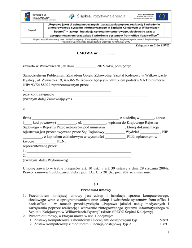 Projekt: „Poprawa jakości usług medycznych i zarządzania poprzez realizację i wdroŜenie zintegrowanego systemu informatycznego w Szpitalu Kolejowym w WilkowicachBystrej” - zakup i instalacja sprzętu komputerowego, sieciowego wraz z oprogramowaniem oraz zakup i wdroŜenie systemów front-office i back-office” Projekt współfinansowany przez Unię Europejską z Europejskiego Funduszu Rozwoju Regionalnego w ramach Regionalnego Programu Operacyjnego Województwa Śląskiego na lata 2007-2013 Załącznik nr 2 do SIWZ UMOWA nr ................. zawarta w Wilkowicach , w dniu ___________ 2015 roku, pomiędzy: Samodzielnym Publicznym Zakładem Opieki Zdrowotnej Szpital Kolejowy w WilkowicachBystrej , ul. śywiecka 19, 43-365 Wilkowice będącym płatnikiem podatku VAT o numerze NIP: 9372188022 reprezentowanym przez :_____________________________________________ przy kontrasygnacie ________________________________________________ (zwanym dalej Zamawiającym) a firmą _____________________________________________ z siedzibą w _______, adres: (____ kod pocztowy) __________, ul. ____________, wpisaną do Krajowego Rejestru Sądowego – Rejestru Przedsiębiorców pod numerem __________, której dokumentacja rejestrowa jest przechowywana przez Sąd Rejonowy __________ Wydział __________ , NIP __________, z kapitałem zakładowym w wysokości ___________ PLN, opłaconym w kwocie ___________ PLN, reprezentowaną przez 1. ______________________________________________________ 2. ______________________________________________________ (zwanym dalej Wykonawcą) Umowę zawarto w trybie przepisów art. 10 ust.1 i art. 39 ustawy z dnia 29 stycznia 2004r. Prawo zamówień publicznych /tekst jedn. Dz. U. z 2013r., poz. 907 ze zmianami/. §1 Przedmiot umowy 1. Przedmiotem niniejszej umowy jest zakup i instalacja sprzętu komputerowego, sieciowego wraz z oprogramowaniem oraz zakup i wdroŜenie systemów front-office i back-office – w ramach przedsięwzięcia „Poprawa jakości usług medycznych i zarządzania poprzez realizację i wdroŜenie zintegrowanego systemu informatycznego w Szpitalu Kolejowym w Wilkowicach-Bystrej” (skrót: SPZOZ Szpital Kolejowy). 2. Przedmiot umowy, o którym mowa w ust. 1 obejmuje: 1. Zestawy komputerowe z monitorem i licencjami dostępowymi typ 1 59szt 2. Zestaw komputerowy z monitorem i licencją dostępową typ 2 1 szt 1 Projekt: „Poprawa jakości usług medycznych i zarządzania poprzez realizację i wdroŜenie zintegrowanego systemu informatycznego w Szpitalu Kolejowym w WilkowicachBystrej” - zakup i instalacja sprzętu komputerowego, sieciowego wraz z oprogramowaniem oraz zakup i wdroŜenie systemów front-office i back-office” Projekt współfinansowany przez Unię Europejską z Europejskiego Funduszu Rozwoju Regionalnego w ramach Regionalnego Programu Operacyjnego Województwa Śląskiego na lata 2007-2013 Załącznik nr 2 do SIWZ 3. Monitor typ 2 ( koszt niekwalifikowany) 1 szt 4. Serwer bazodanowy z systemem operacyjnym 1 szt 5. Serwer usługowy aplikacji z systemem operacyjnym 1 szt 6. Oprogramowanie antywirusowe 60 szt 7. System archiwizacji danych z systemem operacyjnym i macierzą dyskową 1 kpl 8. Przełącznik sieciowy typ 1 6 szt 9. Przełącznik sieciowy typ 2 2 szt 10. Zasilacz UPS do serwerów 2 szt 11. Zasilacz UPS punktu dystrybucyjnego 1 szt 12. Firewall z polityką bezpieczeństwa i systemem monitoringu 1 szt 13. Kontroler sieci bezprzewodowej 1 szt 14. Punkt dostępowy 25 szt 15. zakup i wdroŜenie systemów front-office i back-office jako: a) Moduł Izba przyjęć b) Moduł Zlecenia c) Moduł Apteka i Apteczka Oddziałowa d) Moduł Rozliczenia z NFZ i statystyki e) Moduł Recepcja f) Moduł Laboratorium g) Moduł Rehabilitacja h) Moduł Pracownie diagnostyczne i) Moduł Punkt pobrań j) Moduł Administracja k) Moduł Dokumentacja medyczna l) Moduł Elektroniczna dokumentacja medyczna z funkcją e-pacjenta i e-kontrahenta m) System finansowo-księgowy w składzie • Rejestr sprzedaŜy • Kasa • Kalkulacja kosztów leczenia • Środki trwałe • WyposaŜenie 3. Szczegółowy opis przedmiotu umowy, o którym mowa w ust. 1 i 2 zawiera załącznik nr 1 do SIWZ. 4. Przedmiot zamówienia jest współfinansowany ze środków Europejskiego Funduszu Rozwoju Regionalnego w ramach Działania 2.2 Rozwój elektronicznych usług publicznych Priorytet II. Społeczeństwo informacyjne Regionalnego Programu Operacyjnego Województwa Śląskiego na lata 2007 - 2013 w ramach projektu pn. „Poprawa jakości usług medycznych i zarządzania poprzez realizację i wdroŜenie zintegrowanego systemu informatycznego w Szpitalu Kolejowym w Wilkowicach-Bystrej”. 5. Integralną część umowy stanowią załączniki: a) Oferta Wykonawcy – załącznik nr 1, b) SIWZ z załącznikami – załącznik nr 2, c) Harmonogram rzeczowo – terminowo – finansowy – załącznik nr 3. 2 Projekt: „Poprawa jakości usług medycznych i zarządzania poprzez realizację i wdroŜenie zintegrowanego systemu informatycznego w Szpitalu Kolejowym w WilkowicachBystrej” - zakup i instalacja sprzętu komputerowego, sieciowego wraz z oprogramowaniem oraz zakup i wdroŜenie systemów front-office i back-office” Projekt współfinansowany przez Unię Europejską z Europejskiego Funduszu Rozwoju Regionalnego w ramach Regionalnego Programu Operacyjnego Województwa Śląskiego na lata 2007-2013 Załącznik nr 2 do SIWZ d) Projekt umowy przetwarzania danych osobowych – załącznik nr 4 §2 Termin realizacji przedmiotu umowy 1. Wykonawca zobowiązuje się do wykonania przedmiotu umowy w terminie do 30.09.2015r. 2. Harmonogram rzeczowo-terminowo –finansowy określa terminy realizacji poszczególnych elementów/etapów zadania , o którym mowa w § 1 ust. 1 . 3. Termin, o którym mowa w ust. 1 moŜe ulec zmianie za zgodą Zamawiającego w sytuacji wystąpienia okoliczności, których strony umowy nie były w stanie przewidzieć pomimo zachowania naleŜytej staranności. §3 O