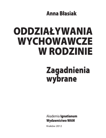 © Akademia Ignatianum, 2012 ul. Kopernika 26 • 31-501 Kraków • tel. 12 39 99 620 • faks 12 39 99 501 [email protected], http://www.ignatianum.edu.pl Publikacja dofinansowana ze środków przeznaczonych na działalność statutową Wydziału Pedagogicznego Akademii Ignatianum Recenzent prof. dr hab. Maria Braun-Gałkowska Redakcja Magdalena Jankosz Projekt okładki i stron tytułowych Andrzej Sochacki ISBN 978-83-7614-039-1 (Ignatianum) ISBN 978-83-7505-905-2 (WAM) WYDAWNICTWO WAM ul. Kopernika 26 • 31-501 Kraków tel. 12 62 93 200 • faks 12 42 95 003 e-mail: [email protected] www.wydawnictwowam.pl DZIAŁ HANDLOWY tel. 12 62 93 254-256 • faks 12 43 03 210 e-mail: [email protected] KSIĘGARNIA INTERNETOWA tel. 12 62 93 260, 12 62 93 446-447 faks 12 62 93 261 e.wydawnictwowam.pl Spis treści Od autorki 9 I. Rodzice i dzieci 1.1. Małżeństwo istotnym fundamentem życia rodzinnego 1.2. Wystarczająco dobry rodzic 1.3. Autorytet rodzicielski 1.4. Być ojcem 1.5. Być mamą 1.6. Dziecko w rodzinie 1.7. Wychowanie zgodne z potrzebami płci 11 12 20 24 28 32 38 43 II. Życie rodzinne 2.1. Fazy życia środowiska rodzinnego 2.2. Siła więzi rodzinnej 2.3. Porozumiewanie się w rodzinie 2.4. Konflikty w rodzinie – szansa czy zagrożenie? 49 49 53 57 61 III. Wychowanie w rodzinie 3.1. Specyfika oddziaływań wychowawczych w rodzinie 3.2. Mądra miłość rodzicielska 3.3. Postawy wychowawcze rodziców 3.4. Style wychowania w rodzinie 3.5. Metody i środki wychowawcze w rodzinie 3.6. Wychowanie do wartości w rodzinie 3.7. Kształtowanie emocji dziecka w rodzinie 3.8. Wychowanie ekonomiczne w rodzinie – kieszonkowe dla dziecka 65 65 71 73 81 85 95 101 IV. Dzieciństwo a powinności rodziców 4.1. Współczesne dzieciństwo i jego zagrożenia w rodzinie 4.2. Wartość dziecięcej zabawy 4.3. Znaczenie czytania w rozwoju i wychowaniu dziecka 4.4. Kształtowanie zainteresowań dziecka w rodzinie 4.5. Dziecko na pograniczu świata rzeczywistego i wirtualnego 4.6. Telewizja i jej wpływ na rozwój dziecka 113 115 119 122 126 129 132 109 8 Spis treści 4.7. Dziecięca agresja a dom rodzinny 4.8. „Bądź, grzeczny!” 4.9. Dziecięcy lęk i jego źródła 135 139 142 V. Sytuacje trudne w życiu rodzinnym 5.1. Życie rodzinne na odległość 5.2. Mamo, nie pij! 5.3. Cierpienie w zaciszu czterech ścian – przemoc domowa 5.4. Wychowanie dziecka w rodzinie niepełnej 5.5. W obliczu choroby – rodzina z dzieckiem chorym przewlekle 147 147 151 155 158 163 Zakończenie 167 Bibliografia 169 Od autorki Rodzina jest podstawowym środowiskiem życia człowieka. Większość ludzi wita ten świat w rodzinie i w niej spędza najważniejszy okres swojej egzystencji, a rodzice są dla dzieci ważnymi i znaczącymi osobami, z którymi szczególnie silnie się identyfikują. Każdemu rodzicowi zależy, by wychować swoje dziecko na szczęśliwego i mądrego człowieka, by je lepiej rozumieć. Moim zamysłem było opracowanie publikacji popularyzującej wiedzę z zakresu pedagogiki rodziny dotyczącej kształtowania kompetencji wychowawczych rodziców, podnoszenia ich kultury pedagogicznej. Wiek XXI stawia przed mamą i tatą zadania i wyzwania, które były obce poprzednim pokoleniom. W związku z tym współcześni małżonkowie i rodzice nie mają aktualnych wzorów postępowania i funkcjonowania w swoich rolach. Poniższy tekst jest zbiorem pewnej wiedzy o wychowaniu dziecka w rodzinie. Nie ma uniwersalnego przepisu na szczęśliwe życie, ale nawet najtrudniejszą rzeczywistość życia rodzinnego, przy odpowiednim nastawieniu i chęci, z wykorzystaniem odrobiny wiedzy można zmienić i udoskonalić. Książka kierowana jest do rodziców, by pomóc im odnaleźć się w sytuacjach, w których często mogą czuć się bezradni, oraz do pedagogów, nauczycieli i wychowawców, pracowników socjalnych, studentów pedagogiki, by umieli wesprzeć rodziców w ich roli i misji wychowania młodego pokolenia. Często w życiu rodzinnym pojawiają się trudne sytuacje, które wymagają nowego rodzaju wiedzy i umiejętności, by nie skrzywdzić dziecka, a dać mu odpowiednie bodźce do rozwoju, być dla niego dobrym wzorem. Nie ma tutaj podanego remedium na wszystkie rodzinne problemy wychowawcze, ale pewne sugestie czy wskazania, jak być dobrym rodzicem i w jaki sposób kształtować odpowiednie warunki dla życia i rozwoju najmłodszego pokolenia. 10 Od autorki Inspiracją do napisania tej książki był cykl artykułów dotyczących życia rodzinnego, które ukazały się w latach 2008–2010 na łamach „Posłańca” z inicjatywy ks. Leszka Gęsiaka SJ, ówczesnego redaktora naczelnego. W tej publikacji zostały one odpowiednio uporządkowane w określone grupy tematyczne i rozszerzone, by postawiony cel został zrealizowany. I. Rodzice i dzieci Dzisiaj z licznych źródeł można dowiedzieć się o kryzysie rodziny, gdyż wzrasta liczba rozwodów, wiele osób decyduje się na samotne życie z lęku przed nieznanym i odpowiedzialnością lub z powodu zniechęcenia negatywnym przykładem rodziców. A jednak w deklaracjach młodych ludzi ciągle rodzina jest istotną wartością, gdyż największym pragnieniem człowieka jest po prostu być kochanym i kochać. Każdy człowiek uczestniczy w życiu określonego środowiska społecznego, od którego jest zależny i równocześnie sam je kształtuje1. Pierwotnym miejscem takiego uczestnictwa jest rodzina. W rodzinie przeżywa człowiek najważniejszy okres życia – okres kształtowania osobowości, systemu wartości i światopoglądu. Doświadczenia dziecka nabyte w środowisku rodzinnym wywierają istotny wpływ na jego zachowanie, gdyż jako doświadczenia najwcześniejsze pozostawiają one najgłębsze i najbardziej rozległe ślady w osobowości, kształtując jej podstawową strukturę. Inne środowiska (jak przedszkole, szkoła czy grupa rówieśnicza) są wtórne i albo umacniają wpływ rodziny, albo modyfikują go i uzupełniają. Doświadczeni