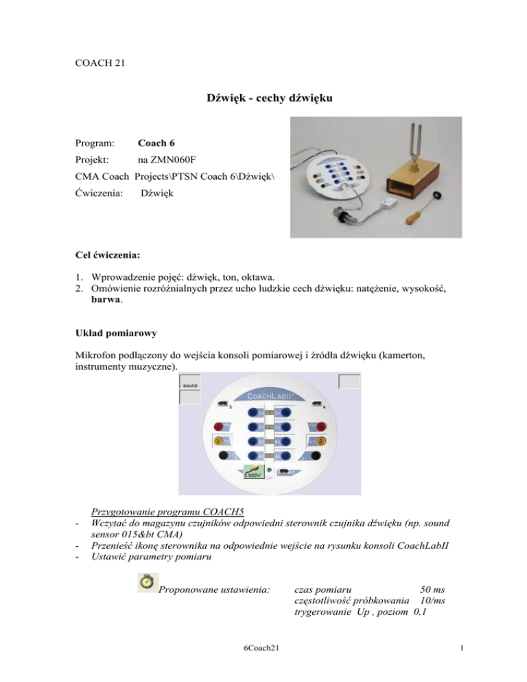 COACH 21 Dźwięk - cechy dźwięku Program: Coach 6 Projekt: na ZMN060F CMA Coach Projects\PTSN Coach 6\Dźwięk\ Ćwiczenia: Dźwięk Cel ćwiczenia: 1. Wprowadzenie pojęć: dźwięk, ton, oktawa. 2. Omówienie rozróŜnialnych przez ucho ludzkie cech dźwięku: natęŜenie, wysokość, barwa. Układ pomiarowy Mikrofon podłączony do wejścia konsoli pomiarowej i źródła dźwięku (kamerton, instrumenty muzyczne). - Przygotowanie programu COACH5 Wczytać do magazynu czujników odpowiedni sterownik czujnika dźwięku (np. sound sensor 015&bt CMA) Przenieść ikonę sterownika na odpowiednie wejście na rysunku konsoli CoachLabII Ustawić parametry pomiaru Proponowane ustawienia: 6Coach21 czas pomiaru 50 ms częstotliwość próbkowania 10/ms trygerowanie Up , poziom 0.1 1 Pomiar Nacisnąć zielony przycisk "start". Dźwięk zostanie zarejestrowany automatycznie rejestracja rozpoczyna się po przekroczeniu przez sygnał ustalonej wartości. C1 – 00 piano Opracowanie Dokonanie analizy fourierowskiej zarejestrowanego dźwięku pozwala określić częstotliwości i udziały tworzących go drgań harmonicznych. MoŜna tego dokonać korzystając z narzędzi programu Coach6: narzędzia /Process Analyze/Signal Snalysis/Function type/ Fourier transform. Zaakceptowane wyniki analizy (OK) mogą być przeniesione do wybranego okna. 6Coach21 2 Przykładowe wyniki i komentarze Wszelkie drgania mechaniczne zachodzące w powietrzu wywołują powstanie fali mechanicznej podłuŜnej. Jest to fala ciśnieniowa – zmianom ulega ciśnienie powietrza. Fala dźwiękowa (akustyczna) w skrócie dźwięk to fala mechaniczna o częstotliwościach 16 Hz ÷ 20 kHz, czyli taka, która dochodząc do ucha człowieka wywołuje wraŜenie dźwięku (jest słyszalna). Fale o wyŜszej częstotliwości (f > 20 kHz) nazywamy ultradźwiękami, a o niŜszej (f < 16 Hz) infradźwiękami). Ton to dźwięk o ściśle określonej częstotliwości (zaleŜność sinusoidalna zmian ciśnienia). Przykładem moŜe być fala dźwiękowa wytwarzana przez kamerton. Wynikiem analizy fourierowskiej takiego przebiegu jest jedna linia. Ton A1 - fala dźwiękowa o częstotliwości 440 Hz Oktawa to zakres, w którym stosunek najwyŜszej do najniŜszej częstotliwości jest równy 2. A więc zmiana tonu o oktawę odpowiada zmianie częstotliwości o czynnik 2, np. A1 fA1 = 440Hz, A2 - fA2 = 880 Hz, A3 - fA3 = 1760 Hz. Fala dźwiękowa o częstotliwości 440 Hz i o oktawę wyŜsza (częstotliwości dwa razy większej) 880 Hz. 6Coach21 3 Oktawę dzieli się na 12 półtonów. Zmiana wysokości o 1 półton odpowiada zmianie 12 częstotliwości o czynnik . 2 = 1.0595 Na rysunku zaznaczony został co drugi półton pomiędzy dźwiękiem C1 - 261 Hz, a dźwiękiem C2 - 522 Hz. Ucho ludzkie rozróŜnia następujące cechy dźwięku: natęŜenie, wysokość i barwa. 1. NatęŜenie dźwięku I moc fali dźwiękowej przypadająca na jednostkę powierzchni prostopadłej do kierunku rozchodzenia się fali (próg słyszalności I0 = 10-12 W/m2, próg bólu 1 W/m2). Fale dźwiękowe róŜniące się natęŜeniem. PoniewaŜ wraŜenie jest proporcjonalne do logarytmu podniety wprowadzono pojęcie poziom natęŜenia dźwięku L L = lg I I0 Jednostką jest bel [B] ale najczęściej uŜywa się jednostek 10 razy mniejszych decybeli [dB] (rozmowa L = 40 dB). 6Coach21 4 2. Wysokość dźwięku Fizyczną miarą wysokości dźwięku jest częstotliwość fali dźwiękowej. Im większa częstotliwość tym wyŜszy dźwięk. Fale dźwiękowe róŜniące się częstotliwością.. 3. Barwa dźwięku O barwie dźwięku decyduje udział w widmie wyŜszych harmonicznych tworzących falę dźwiękową czyli przyczynków o częstotliwości będącej całkowitą wielokrotnością częstotliwości podstawowej. A1 – Casio 00 piano A1 – Casio 27 harmonica A1 – Casio 45 Sitar Fale dźwiękowe (dźwięk A1 - 440 Hz) róŜniące się barwą dźwięku, czyli udziałem wyŜszych harmonicznych. 6Coach21 5