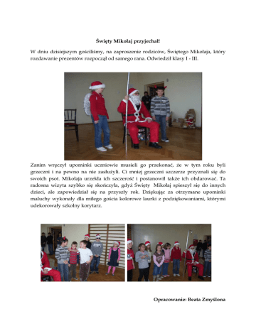 Święty Mikołaj przyjechał! W dniu dzisiejszym gościliśmy, na zaproszenie rodziców, Świętego Mikołaja, który rozdawanie prezentów rozpoczął od samego rana. Odwiedził klasy I - III. Zanim wręczył upominki uczniowie musieli go przekonać, że w tym roku byli grzeczni i na pewno na nie zasłużyli. Ci mniej grzeczni szczerze przyznali się do swoich psot. Mikołaja urzekła ich szczerość i postanowił także ich obdarować. Ta radosna wizyta szybko się skończyła, gdyż Święty Mikołaj spieszył się do innych dzieci, ale zapowiedział się na przyszły rok. Dziękując za otrzymane upominki maluchy wykonały dla miłego gościa kolorowe laurki z podziękowaniami, którymi udekorowały szkolny korytarz. Opracowanie: Beata Zmyślona