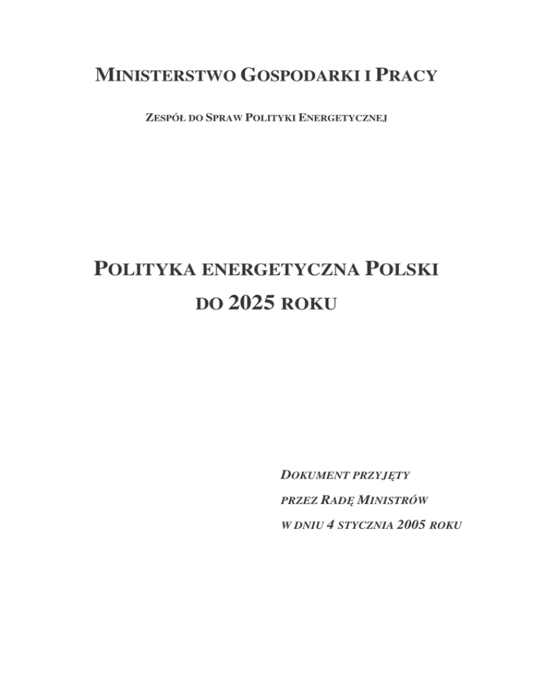 MINISTERSTWO GOSPODARKI I PRACY ZESPÓŁ DO SPRAW POLITYKI ENERGETYCZNEJ POLITYKA ENERGETYCZNA POLSKI DO 2025 ROKU DOKUMENT PRZYJ TY PRZEZ RAD MINISTRÓW W DNIU 4 STYCZNIA 2005 ROKU SPIS TRE CI I. DOKTRYNA POLITYKI ENERGETYCZNEJ POLSKI DO 2025 R.: ...................3 1. CELE, ZASADY, PRIORYTETY.............................................................................3 2. ZARZ DZANIE BEZPIECZE STWEM ENERGETYCZNYM..........................10 II. DŁUGOTERMINOWE KIERUNKI DZIAŁA DO 2025 ROKU ORAZ ZADANIA WYKONAWCZE DO 2008 ROKU .........................................................16 1. 2. 3. 4. 5. 6. 7. 8. 9. ZDOLNO CI WYTWÓRCZE KRAJOWYCH RÓDEŁ PALIW I ENERGII .17 WIELKO CI I RODZAJE ZAPASÓW PALIW..................................................19 ZDOLNO CI TRANSPORTOWE I POŁ CZENIA TRANSGRANICZNE .....21 EFEKTYWNO ENERGETYCZNA GOSPODARKI .....................................23 OCHRONA RODOWISKA ...............................................................................24 WZROST WYKORZYSTANIA ODNAWIALNYCH RÓDEŁ ENERGII ......27 RESTRUKTURYZACJA I PRZEKSZTAŁCENIA WŁASNO CIOWE ...........29 KIERUNKI BADA NAUKOWYCH I PRAC ROZWOJOWYCH...................31 WSPÓŁPRACA MI DZYNARODOWA............................................................33 ZAŁ CZNIK 1. OCENA REALIZACJI DOTYCHCZASOWEJ POLITYKI ENERGETYCZNEJ .....................................................................................................35 ZAŁ CZNIK 2. WNIOSKI Z PRAC PROGNOSTYCZNO - ANALITYCZNYCH..50 ZAŁ CZNIK 3. PRZELICZNIKI JEDNOSTEK ENERGETYCZNYCH.................57 ZAŁ CZNIK 4. MATERIAŁY RÓDŁOWE I POMOCNICZE..............................58 I. DOKTRYNA POLITYKI ENERGETYCZNEJ POLSKI DO 2025 R.: 1. CELE, ZASADY, PRIORYTETY Polski konsument i przedsi biorca potrzebuj taniej energii, o wysokiej jako ci, a polska energetyka wymaga w dalszym ci gu skutecznej restrukturyzacji i prorynkowej orientacji, ze szczególnym dostosowaniem si do warunków funkcjonowania w Unii Europejskiej. To wyzwanie, zasługuj ce na miano wr cz cywilizacyjnego, musi zosta zrealizowane w mo liwie krótkim czasie, by w horyzoncie do 2025 roku, zapewni Polsce i Polakom mo liwo pełnego korzystania z dobrodziejstw wspólnego, unijnego dorobku, mi dzy innymi w zakresie jednolitego rynku energii. Realizacji tego rodzaju zamierze , przes dzaj cych o przyszło ci mo e wył cznie podj si pa stwo i jego organy. Potrzebne jest zatem mo liwie szerokie i wszechstronne opracowanie kompleksowego programu gospodarczego, adresowanego do administracji publicznej, z definicji zobowi zanej do działania w imi interesu publicznego. Konieczno posiadania takiego programu działa w odniesieniu do energetyki znajduje tak e swoje potwierdzenie w zapisach ustawy – Prawo energetyczne, zobowi zuj cej przede wszystkim ministra wła ciwego do spraw gospodarki do przygotowania polityki w tym zakresie. W okresie transformacji polskiej gospodarki po 1989 roku, polityka energetyczna pa stwa była realizowana na podstawie czterech rz dowych dokumentów programowych. Były to: 1. „Zało enia polityki energetycznej Rzeczypospolitej Polskiej na lata 1990 – 2010” z sierpnia 1990 r. 2. „Zało enia polityki energetycznej Polski do 2010 roku”, przyj te przez Rad Ministrów w dniu 17 pa dziernika 1995 r. 3. „Zało enia polityki energetycznej Polski do 2020 roku”, przyj te przez Rad Ministrów w dniu 22 lutego 2000 r. 4. „Ocena realizacji i korekta Zało e polityki energetycznej Polski do 2020 roku” wraz z zał cznikami, przyj ta przez Rad Ministrów w dniu 2 kwietnia 2002 r. Programy te, oparte o ró ne do wiadczenia wynikaj ce tak z zakresu, jak i z tempa zaawansowania restrukturyzacji polskiej energetyki, ró niły si w podej ciu do wielu kluczowych spraw. Jednak w zakresie ich filozofii i zwłaszcza podstawowych celów polityki energetycznej charakteryzowały si znacznym podobie stwem. Co wi cej, w odniesieniu do przyjmowanych głównych celów programy te były i s zbie ne z zało eniami i kierunkami polityki energetycznej Unii Europejskiej. Tego rodzaju zbie no , po dana na etapie akcesji, okazuje si by niewystarczaj c po uzyskaniu pełnego członkostwa w unijnej wspólnocie. Jest to z pewno ci pierwszy wa ny powód dla nowelizacji całego spektrum działa w zakresie polityki energetycznej. Drugi powód, niemniej wa ny, to zespół uwarunkowa zwi zanych z przewidywanym tempem zako czenia transformacji rynkowej polskiej gospodarki, głównie za spraw unijnego otoczenia rynkowego. Po raz pierwszy restrukturyzacja istotnego dla 3 całej gospodarki i społecze stwa sektora odbywa si b dzie w nowych warunkach: powstaj cego jednolitego rynku energii elektrycznej i gazu, b d cego jednym ze strategicznych celów Unii Europejskiej. Te dwa zasadnicze uwarunkowania, nie maj ce dot d znaczenia rozstrzygaj cego a jedynie mobilizuj ce, powoduj obecnie konieczno znacznie skuteczniejszej realizacji dotychczasowego paradygmatu polskiej polityki energetycznej, polegaj cego na wprowadzeniu stosunków rynkowych do energetyki. Dlatego te , dla wyeksponowania sprawczego wpływu powy szych okoliczno ci i w celu wyró nienia aktualnie przygotowanego programu działa , został on okre lony mianem doktryny polityki energetycznej. Powy sz konieczno dodatkowo wzmacnia ustawowe zobowi zanie do cyklicznego uaktualniania polityki energetycznej, co powoduje z kolei, zreszt nie po raz pierwszy, konieczno dokonania rzetelnej analizy jej celów, przebiegu i skutków, a przede wszystkim – zmieniaj cych si pozostałych uwarunkowa i ich wpływu na wybór korzystnej strategii jej realizacji. W szczególno ci polityka energetyczna nie mo e nie bra pod uwag faktu, e sektor energetyczny nale y do najistotniejszych ródeł oddziaływania na rodowisko naturalne (przyrodnicze) w kraju, jak te do pewnego stopnia w skali globalnej. Wi e si to z wykorzystywaniem znacz cych ilo ci paliw w glowych i wynikaj cymi st d emisjami do rodowiska, powoduj cymi jego przekształcanie (odpady), j