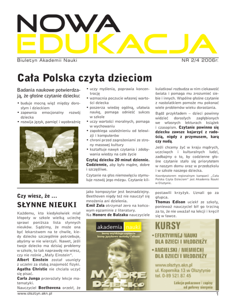 Nowa edukacja Biuletyn Akademii Nauki NR 2/4 2006r. Cała Polska czyta dzieciom Badania naukowe potwierdzają, że głośne czytanie dziecku: • buduje mocną więź między dorosłym i dzieckiem • zapewnia emocjonalny rozwój dziecka • rozwija język, pamięć i wyobraźnię • uczy myślenia, poprawia koncentrację • wzmacnia poczucie własnej wartości dziecka • poszerza wiedzę ogólną, ułatwia naukę, pomaga odnieść sukces w szkole • uczy wartości moralnych, pomaga w wychowaniu • zapobiega uzależnieniu od telewizji i komputerów • chroni przed zagrożeniami ze strony masowej kultury • kształtuje nawyk czytania i zdobywania wiedzy na całe życie Czytaj dziecku 20 minut dziennie. Codziennie, aby było mądre, dobre i szczęśliwe. Czy wiesz, że ... SŁYNNE NIEUKI Każdemu, kto kiedykolwiek miał kłopoty w szkole wielką uciechę sprawi poniższa lista słynnych nieuków. Sądzimy, że może ona być lekarstwem na te chwile, kiedy dziecko szczególnie potrzebuje, abyśmy w nie wierzyli. Nawet, jeśli twoje dziecko ma dzisiaj problemy w szkole, to tak naprawdę nie wiesz, czy nie rośnie „Mały Einstein”. Albert Einstein został usunięty z uczelni za słabą znajomość fizyki. Agatha Christie nie chciała uczyć się pisać. Carla Junga przerażały lekcje matematyki. Nauczyciel Beethovena orzekł, że www.olsztyn.akn.pl kulatkowi rozbudza w nim ciekawość świata i pomaga mu zrozumieć siebie i innych. Wspólne głośne czytanie z nastolatkiem pomoże mu pokonać wiele problemów wieku dorastania. Bądź przykładem – dzieci powinny widzieć dorosłych zagłębionych we własnych lekturach książek i czasopism. Czytanie powinno się dziecku zawsze kojarzyć z radością, nigdy z przymusem, karą czy nudą. Jeśli chcemy żyć w kraju mądrych, uczciwych i kulturalnych ludzi, zadbajmy o to, by codzienne głośne czytanie stało się priorytetem w naszym domu oraz w przedszkolu i w szkole naszego dziecka. Czytanie na głos niemowlęciu stymuluje rozwój jego mózgu. Czytanie kil- Koordynatorem regionalnym kampanii „Cała Polska Czyta Dzieciom” jest Akademia Nauki w Olsztynie. jako kompozytor jest beznadziejny. Beethoven nigdy też nie nauczył się mnożenia ani dzielenia. Emil Zola otrzymał zero na końcowym egzaminie z literatury. Na Honore de Balzaku nauczyciele postawili krzyżyk. Uznali go za głupca. Thomas Edison uciekł ze szkoły, ponieważ nauczyciel bił go trzciną za to, że nie uważał na lekcji i kręcił się w ławce. 1 Biuletyn Akademii Nauki Każde dziecko jest inteligentne Każde dziecko dysponuje pięknym i inteligentnym mózgiem. Mózg dziecka jest jak super komputer najnowszej generacji. Gdyby nasze dzieci urodziły się w kraju trójjęzycznym, bez najmniejszego wysiłku znałyby trzy języki. Potencjał intelektualny dzieci zdaje się być nieograniczony. Każde dziecko może odnosić sukcesy w szkole. Do nas należy nauczyć się właściwie traktować możliwości i talenty dziecka. Kiedy zaczniemy umiejętnie wzmacniać zdrową postawę pewności siebie u dziecka, oraz pełniej wykorzystamy jego potencjał intelektualny, dziecko będzie mogło stopniowo rozwijać Erik Erikson, twórca psychospołecznej teorii rozwoju, tak mówił o fazach rozwoju dziecka i pojawiających się między nimi kryzysach: 0-2 rok życia Ufność – nieufność Konsekwencja, stałość doświadczenia, autentyczna troska rodziców prowadzi do przekonania, że świat jest bezpieczny i godny zaufania. skrzydła swoich możliwości. Będąc rodzicami musimy pamiętać, że bez korzeni nie ma skrzydeł. Patrz „Słynni Nieucy” na str.1 Pewność siebie Bardzo duży wpływ na wyniki osiągane przez dziecko w szkole ma obraz siebie, czyli zbiór przekonań, które dziecko ma na własny temat. Jest to swoiste oprogramowanie, które determinuje osiągnięcia dziecka. Pewien uczeń miał na początku szkolnej kariery problemy z arytmetyką. Jego nauczycielka i rodzice doszli do przekonania, że jest „słaby z matematyki”. Uczeń ten nie protestował przeciw tej ocenie, gdyż jego stopnie z arytmetyki całkowicie ją potwierdzały. Pewnego dnia doznał nagłego olśnienia: znalazł rozwiązanie problemu matematycznego, którego nikt w klasie nie potrafił rozgryźć. Gdy powiedział to głośno, klasa wybuchła śmiechem. Ale on niezrażony podszedł do tablicy i rozwiązał zadanie. Wtedy zrozumiał, że potrafi pojąć arytmetykę. Uwierzył we własne siły i nie miał odtąd problemów z tym przedmiotem. Badania dowodzą, że dotyczy to większości www.olsztyn.akn.pl Fazy rozwoju dziecka dzieci z problemami w szkole. Uprzedzenia i poczucie niskiej wartości mogły mieć bardzo szkodliwy wpływ, gdyż sięgają one w dziedzinę rzeczywistego działania. Z badań wynika, że wpływ uprzedzenia może być tak silny, że dzieci, którym jedynie chwilowo przydzielono niską pozycję czy status mniejszości, mogą osiągać gorsze rezultaty w zadaniach wymagających umiejętności i koncentracji. Każde dziecko, jeżeli dostanie umiejętne wsparcie od rodziców, będzie miało poczucie własnej wartości oraz świadomość swoich talentów, może osiągać sukcesy w szkole i każdej dziedzinie, która będzie dla niego interesująca. Dlatego warto o dziecku wiedzieć więcej... Niespójne traktowanie, niewłaściwa opieka prowadzi do lęku i podejrzliwości. 2-3 rok życia Autonomia – zwątpienie Dziecko będzie samodzielne, jeśli zachęca się je by robiło coś same, pozwala mu się na robienie we własnym tempie. Dziecko wyręczone, krytykowane, któremu okazuje się zniecierpliwienie, kiedy coś robi, bedzie wątpić w swoje możliwości. 4-5 rok życia Inicjatywa – poczucie winy Dając dziecku dużą swobodę, interesując się jego pytaniami dajemy mu przestrzeń do podejmowania działań. Sztywne, bezsensowne zakazy, postępowanie rodziców, powodują u dziecka poczucie naprzykrzania się, (odganiania, nieudzielania odpowiedzi itp.)