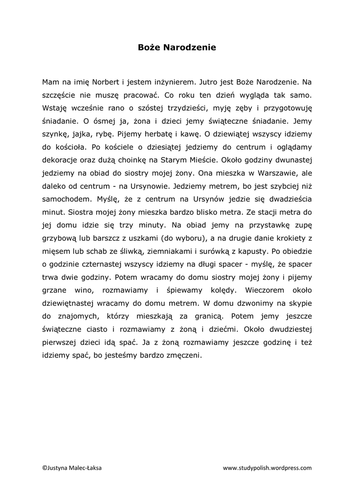 Boże Narodzenie Mam na imię Norbert i jestem inżynierem. Jutro jest Boże Narodzenie. Na szczęście nie muszę pracować. Co roku ten dzień wygląda tak samo. Wstaję wcześnie rano o szóstej trzydzieści, myję zęby i przygotowuję śniadanie. O ósmej ja, żona i dzieci jemy świąteczne śniadanie. Jemy szynkę, jajka, rybę. Pijemy herbatę i kawę. O dziewiątej wszyscy idziemy do kościoła. Po kościele o dziesiątej jedziemy do centrum i oglądamy dekoracje oraz dużą choinkę na Starym Mieście. Około godziny dwunastej jedziemy na obiad do siostry mojej żony. Ona mieszka w Warszawie, ale daleko od centrum - na Ursynowie. Jedziemy metrem, bo jest szybciej niż samochodem. Myślę, że z centrum na Ursynów jedzie się dwadzieścia minut. Siostra mojej żony mieszka bardzo blisko metra. Ze stacji metra do jej domu idzie się trzy minuty. Na obiad jemy na przystawkę zupę grzybową lub barszcz z uszkami (do wyboru), a na drugie danie krokiety z mięsem lub schab ze śliwką, ziemniakami i surówką z kapusty. Po obiedzie o godzinie czternastej wszyscy idziemy na długi spacer - myślę, że spacer trwa dwie godziny. Potem wracamy do domu siostry mojej żony i pijemy grzane wino, rozmawiamy i śpiewamy kolędy. Wieczorem około dziewiętnastej wracamy do domu metrem. W domu dzwonimy na skypie do znajomych, którzy mieszkają za granicą. Potem jemy jeszcze świąteczne ciasto i rozmawiamy z żoną i dziećmi. Około dwudziestej pierwszej dzieci idą spać. Ja z żoną rozmawiamy jeszcze godzinę i też idziemy spać, bo jesteśmy bardzo zmęczeni. ©Justyna Malec-Łaksa www.studypolish.wordpress.com 1. Proszę odpowiedzieć na pytania. a) Co oni jedzą na śniadanie w Boże Narodzenie? b) Gdzie oni spędzają Boże Narodzenie? c) Dlaczego oni jadą do domu siostry metrem? d) Jak długo spacerują po obiedzie? e) Co oni jedzą na obiad w Boże Narodzenie? f) Gdzie mieszka siostra żony? g) Do kogo i kiedy oni dzwonią w Boże Narodzenie? h) O której godzinie oni idą spać? i) Czy Norbert jest artystą? 2. Proszę wypisać cyframi wszystkie godziny, które pojawiły się w tekście. ....................................................................................................... ....................................................................................................... ....................................................................................................... ....................................................................................................... ....................................................................................................... 3. Proszę napisać pytania do podanych odpowiedzi. a)...................................................................................................? ODP: Idziemy spać, bo jesteśmy bardzo zmęczeni. b)...................................................................................................? ODP: Około godziny dwunastej jedziemy na obiad do siostry mojej żony. c)...................................................................................................? ODP: Ze stacji metra do domu siostry mojej żony idzie się trzy minuty. d)...................................................................................................? ODP: Na przystawkę jemy zupę grzybową lub barszcz z uszkami. ©Justyna Malec-Łaksa www.studypolish.wordpress.com 4. Proszę opowiedzieć tę historię w 3 osobie. On ma na imię Norbert i jest inżynierem. Jutro jest ....... 5. Proszę połączyć zdania z kolumny lewej i prawej tak aby tworzyły spójną całość. a) Siostra mojej żony mieszka 1. na obiad do siostry mojej żony. b) Pijemy 2. i rozmawiamy z żoną i dziećmi. c) Około godziny dwunastej 3. którzy mieszkają za granicą. jedziemy d) Jedziemy metrem, bo 4. kościoła. e) Myślę, że z centrum na Ursynów 5. bardzo blisko metra. jedzie się f) O dziewiątej wszyscy idziemy do 6. jest szybciej niż samochodem. g) W domu dzwonimy na skypie do 7. wygląda tak samo. znajomych, h) Co roku ten dzień 8. herbatę i kawę. i) Potem jemy jeszcze świąteczne 9. dwadzieścia minut. ciasto a 5, b...., c....., d....., e....., f...., g....., h....., i..... ©Justyna Malec-Łaksa www.studypolish.wordpress.com
