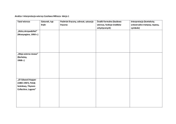 Analiza i interpretacja wierszy Czesława Miłosza- lekcja 1 Tytuł wiersza „Który skrzywdziłeś” (Waszyngton, 1950 r.) „Moja wierna mowo” (Berkeley, 1968 r.) „O! Edward Hopper (1882-1967), Pokój hotelowy, Thyssen Collection, Lugano” Gatunek, typ liryki Podmiot liryczny, adresat, sytuacja liryczna Środki formalne (budowa wiersza, funkcje środków artystycznych) Interpretacja (konteksty; uniwersalne motywy, toposy, symbole) Analiza i interpretacja wierszy Czesława Miłosza- lekcja 2 Tytuł wiersza „Dar” (Berkeley , 1971 r.) „Oeconomia divina” (Berkeley, 1973 r.) „Wyznanie” (1986 r.) Gatunek, typ liryki Podmiot liryczny, adresat, sytuacja liryczna Środki formalne (budowa wiersza, funkcje środków artystycznych) Interpretacja (konteksty; uniwersalne motywy, toposy, symbole) Analiza i interpretacja wierszy Czesława Miłosza- lekcja 1 Tytuł wiersza Gatunek, typ liryki Podmiot liryczny, adresat, sytuacja liryczna „Który skrzywdziłeś” (Waszyngton, 1950 r. ) Liryka zwrotu do adresata (analogie – pieśni Jana Kochanowskiego „Wy , którzy Pospolitą Rzeczą” P.L. nie ujawnia się, osądza, upomina się o prawa słabszych – poeta- moralista; Adresat- (totalitarny mocarz – Stalin) osoba krzywdząca moralnie człowieka prostego, cynicznym śmiechem, upokorzeniem w czasach stalinowskich; Siła krzywdziciela z poklasku otoczenia, zastraszenia dworu (gromada błaznów), perfidii propagandy (pomieszanie dobrego i złego) „Moja wierna mowo” (Berkeley, 1968 r.) Persyflażnaśladowanie stylu dworskiego w celu deprecjacji moralnej dworu (szyderstwo pod maską uprzejmości) Liryka bezpośrednia, „ja” autorskie wskazuje na fakty biograficzne Miłosz zwraca się do personifikowanej mowy, którą utożsamia z Ojczyzną (słowa KLUCZE), domem, schronieniem, korzeniami, sacrum- czas przeszły. Teraz – 1968 – pejoratywne określenia użytkowników j. polskiego (upodleni, konfidenci , nienawidzący…) wielki dramat poety, myśliciela, człowieka- nie chce się Środki formalne (budowa wiersza, funkcje środków artystycznych) 4 zwrotki - 13 wersów; język oszczędny, prosty, jasny; Metafory – gromada błaznów, narodziny nowego poety; epitety- złote, zimowy, nowy… Inwersja składniowa- w celu naśladowania stylu dworskiego i pointy; Pointa- ostatnia zwrotka – sugestia, że tylko samobójstwo uchroni tyrana przed hańbą u potomnych (aluzja do śmierci Zygfryda de Love w „Krzyżakach”) 3 części wiersza – 3 czasy Język prosty, jasny, emocjonalny; epitety (jasne, czyste…), metafory (miseczki z kolorami, mowa chorych na własną niewinność…); pejoratywne, emocjonalne określenia użytkowników Interpretacja (konteksty; uniwersalne motywy, toposy, symbole) Kontekst historyczny, kulturowy; POETA – MORALISTA to zagrożenie dla tyrana, bo ocenia, daje świadectwo prawdzie, przestrzega, karze = hańbi, piętnuje krzywdziciela ROLA POETY – Horacy (exegi monumentum, non omnis moriar), Tyrtajos, Kochanowski, Mickiewicz, Tuwim itd. Ponadczasowe – władca i jego dwór, ochrona prostego człowieka przed złem i absurdem historii Konteksty: filozoficzny, kulturowy, historyczny – 1968 Rola poety- emigranta, wzajemne uzależnienie poety i jego mowy – sacrum- Ojczyzny- narzędzia, którym się posługuje, tragedia poety emigranta – aluzje np. Mickiewicz „O! Edward Hopper (1882-1967), Pokój hotelowy, Thyssen Collection, Lugano” Liryka pośrednia Ekfraza – wiersz będący opisem dzieła malarskiego Tytuł wiersza jest oryginalny, brzmi jak podpis pod obrazem identyfikować z nimi przez mowę zbeszczeszczoną (historia). Czas przyszły- mowa to tworzywo poetysacrum, musi ocalić mowę polską nieskażoną komunizmem, będzie to ocalenie moralne poety Opis i interpretacja obrazu E. Hoppera „Pokój hotelowy”; P.L. – artysta, filozof interpretuje obraz: emocje kobiety określa jako smutek i rozpacz, opisuje obraz nazywając bohaterkę : KOBIETA KARIERY – i podkreślając jej stan : lęki, frustracje, wątpliwości, refleksje, chwile zadumy nad własnym losem i jestestwem, przed podjęciem ważkich decyzji. Samotność wśród tłumów, ubóstwo w bogactwie. języka polskiego w 1968 r. – zaangażowanie polityczne Miłosza – potwierdził to w 1995 r.) 3 zwrotki – 6 wersów; 1/Wykrzyknienia i metaforypersonifikacja smutku i rozpaczy; 2/opis prozatorskiwyliczenia, przerzutnie, epitety; 3/pytanie retoryczne, pointa – zmuszają czytelnika do reakcji Kontekst kulturowy – malarstwo E. Hoppera- smutek wielkich miast i obskurnych pokoi hotelowych; filozoficzny, egzystencjalny; Modelka – żona artysty, modelka i ofiara - Josephine – z jej pamiętników można dowiedzieć się o torturach psychicznych, jakim była poddawana przez męża – związek sadomasochistyczny. Analiza i interpretacja wierszy Czesława Miłosza – lekcja 2 Tytuł wiersza Gatunek, typ liryki Podmiot liryczny, adresat, sytuacja liryczna „Dar” (Berkeley , 1971 r.) Liryka bezpośrednia, refleksyjna; impresja o raju darowanym na chwilę P.L. – osoba dojrzała, która zaakceptowała siebie i umie się cieszyć; darem jest szczęśliwy, słoneczny od rana dzień; estetyka wpływa na etykę - piękno dnia łagodzi: chęć posiadania rzeczy materialnych, zazdrość, zawistną pamięć, zbytnie wymagania, ból fizyczny. Chęć utrwalenia w poezji szczęśliwej chwili, afirmacja życia i świata pod wpływem słonecznego poranka „Oeconomia divina” (Berkeley, 1973 r.) Liryka bezpośrednia, refleksyjna P.L. –obserwator chwili osobliwej („Wesele”- Wernyhora i Gospodarz), uczestnik dziejącej się rzeczywistości – Bóg upokarza = opuszcza ludzi ;daje im całkowitą wolność; świat zostaje pozbawiony sacrum – rozsypuje się- CHAOS; znaki cywilizacji XX w. (drogi, lotniska, miasta) świadczą o pysze Środki formalne (budowa wiersza, funkcje środków artystycznych) Wiersz stychiczny, wiersz wolny, 9 wersów. Epitety-szczęśliwy, niebieskie, it
