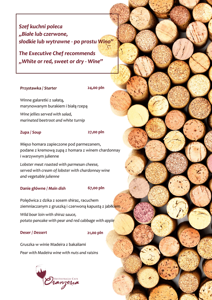 Szef kuchni poleca „Białe lub czerwone, słodkie lub wytrawne - po prostu Wino” The Executive Chef recommends „White or red, sweet or dry - Wine” 24,00 pln Przystawka / Starter Winne galaretki z sałatą, marynowanym burakiem i białą rzepą Wine jellies served with salad, marinated beetroot and white turnip Zupa / Soup 27,00 pln Mięso homara zapieczone pod parmezanem, podane z kremową zupą z homara z winem chardonnay i warzywnym julienne Lobster meat roasted with parmesan cheese, served with cream of lobster with chardonnay wine and vegetable julienne Danie główne / Main dish 67,00 pln Polędwica z dzika z sosem shiraz, racuchem ziemniaczanym z gruszką i czerwoną kapustą z jabłkiem Wild boar loin with shiraz sauce, potato pancake with pear and red cabbage with apple Deser / Dessert 21,00 pln Gruszka w winie Madeira z bakaliami Pear with Madeira wine with nuts and raisins