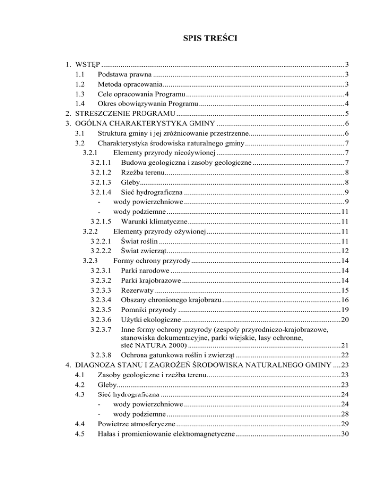 SPIS TREŚCI 1. WSTĘP ...............................................................................................................................3 1.1 Podstawa prawna ....................................................................................................3 1.2 Metoda opracowania...............................................................................................3 1.3 Cele opracowania Programu...................................................................................4 1.4 Okres obowiązywania Programu............................................................................4 2. STRESZCZENIE PROGRAMU ........................................................................................5 3. OGÓLNA CHARAKTERYSTYKA GMINY ...................................................................6 3.1 Struktura gminy i jej zróżnicowanie przestrzenne..................................................6 3.2 Charakterystyka środowiska naturalnego gminy....................................................7 3.2.1 Elementy przyrody nieożywionej ...................................................................7 3.2.1.1 Budowa geologiczna i zasoby geologiczne ................................................7 3.2.1.2 Rzeźba terenu..............................................................................................8 3.2.1.3 Gleby...........................................................................................................8 3.2.1.4 Sieć hydrograficzna ....................................................................................9 wody powierzchniowe ....................................................................................9 wody podziemne ...........................................................................................11 3.2.1.5 Warunki klimatyczne................................................................................11 3.2.2 Elementy przyrody ożywionej......................................................................11 3.2.2.1 Świat roślin ...............................................................................................11 3.2.2.2 Świat zwierząt...........................................................................................12 3.2.3 Formy ochrony przyrody ..............................................................................14 3.2.3.1 Parki narodowe .........................................................................................14 3.2.3.2 Parki krajobrazowe ...................................................................................14 3.2.3.3 Rezerwaty .................................................................................................15 3.2.3.4 Obszary chronionego krajobrazu..............................................................16 3.2.3.5 Pomniki przyrody .....................................................................................19 3.2.3.6 Użytki ekologiczne ...................................................................................20 3.2.3.7 Inne formy ochrony przyrody (zespoły przyrodniczo-krajobrazowe, stanowiska dokumentacyjne, parki wiejskie, lasy ochronne, sieć NATURA 2000) ................................................................................21 3.2.3.8 Ochrona gatunkowa roślin i zwierząt .......................................................22 4. DIAGNOZA STANU I ZAGROŻEŃ ŚRODOWISKA NATURALNEGO GMINY ....23 4.1 Zasoby geologiczne i rzeźba terenu......................................................................23 4.2 Gleby.....................................................................................................................23 4.3 Sieć hydrograficzna ..............................................................................................24 wody powierzchniowe ..................................................................................24 wody podziemne ...........................................................................................28 4.4 Powietrze atmosferyczne ......................................................................................29 4.5 Hałas i promieniowanie elektromagnetyczne.......................................................30 4.6 Przyroda................................................................................................................31 4.6.1 Świat roślinny ...............................................................................................31 4.6.2 Świat zwierzęcy ............................................................................................33 4.7 Krajobraz ..............................................................................................................33 4.8 Obszary oddziaływania na środowisko ................................................................33 4.8.1 Działalność gospodarcza ..............................................................................33 4.8.2 Społeczeństwo ..............................................................................................35 4.8.3 Turystyka i rekreacja ....................................................................................37 4.8.4 Transport i infrastruktura..............................................................................39 4.8.4.1 Transport...................................................................................................39 4.8.4.2 Gospodarka wodno-ściekowa ...................................................................40 4.8.4.3 Gospodarka odpadowa..............................................................................44 4.8.4.4 Zaopatrzenie gminy w ciepło, energię elektryczną i paliwa gazowe .......47 4.8.5 Rolnictwo......................................................................................................49 4.9 Ograniczenia i szanse rozwoju gminy, wynikające ze stanu środowiska.............50 5. CELE I ZADANIA PROGRAMU ..................