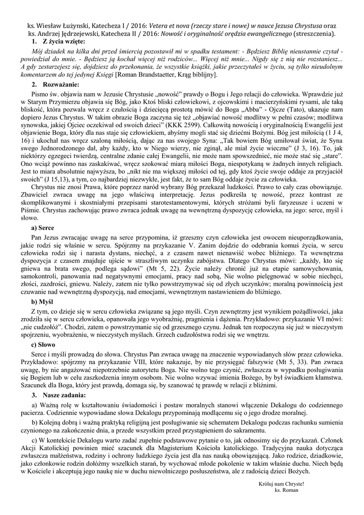 ks. Wiesław Łużynski, Katecheza I / 2016: Vetera et nova (rzeczy stare i nowe) w nauce Jezusa Chrystusa oraz ks. Andrzej Jędrzejewski, Katecheza II / 2016: Nowość i oryginalność orędzia ewangelicznego (streszczenia). 1. Z życia wzięte: Mój dziadek na kilka dni przed śmiercią pozostawił mi w spadku testament: - Będziesz Biblię nieustannie czytał powiedział do mnie. - Będziesz ją kochał więcej niż rodziców... Więcej niż mnie... Nigdy się z nią nie rozstaniesz... A gdy zestarzejesz się, dojdziesz do przekonania, że wszystkie książki, jakie przeczytałeś w życiu, są tylko nieudolnym komentarzem do tej jedynej Księgi [Roman Brandstaetter, Krąg biblijny]. 2. Rozważanie: Pismo św. objawia nam w Jezusie Chrystusie „nowość” prawdy o Bogu i Jego relacji do człowieka. Wprawdzie już w Starym Przymierzu objawia się Bóg, jako Ktoś bliski człowiekowi, z ojcowskimi i macierzyńskimi rysami, ale taką bliskość, która pozwala wręcz z czułością i dziecięcą prostotą mówić do Boga „Abba” - Ojcze (Tato), ukazuje nam dopiero Jezus Chrystus. W takim obrazie Boga zaczyna się też „objawiać nowość modlitwy w pełni czasów; modlitwa synowska, jakiej Ojciec oczekiwał od swoich dzieci” (KKK 2599). Całkowitą nowością i oryginalnością Ewangelii jest objawienie Boga, który dla nas staje się człowiekiem, abyśmy mogli stać się dziećmi Bożymi. Bóg jest miłością (1 J 4, 16) i ukochał nas wręcz szaloną miłością, dając za nas swojego Syna: „Tak bowiem Bóg umiłował świat, że Syna swego Jednorodzonego dał, aby każdy, kto w Niego wierzy, nie zginął, ale miał życie wieczne” (J 3, 16). To, jak niektórzy egzegeci twierdzą, centralne zdanie całej Ewangelii, nie może nam spowszednieć, nie może stać się „stare”. Ono wciąż powinno nas zaskakiwać, wręcz szokować miarą miłości Boga, niespotykaną w żadnych innych religiach. Jest to miara absolutnie najwyższa, bo „nikt nie ma większej miłości od tej, gdy ktoś życie swoje oddaje za przyjaciół swoich” (J 15,13), a tym, co najbardziej niezwykłe, jest fakt, że to sam Bóg oddaje życie za człowieka. Chrystus nie znosi Prawa, które poprzez naród wybrany Bóg przekazał ludzkości. Prawo to cały czas obowiązuje. Zbawiciel zwraca uwagę na jego właściwą interpretację. Jezus podkreśla tę nowość, przez kontrast ze skomplikowanymi i skostniałymi przepisami starotestamentowymi, których stróżami byli faryzeusze i uczeni w Piśmie. Chrystus zachowując prawo zwraca jednak uwagę na wewnętrzną dyspozycję człowieka, na jego: serce, myśl i słowo. a) Serce Pan Jezus zwracając uwagę na serce przypomina, iż grzeszny czyn człowieka jest owocem nieuporządkowania, jakie rodzi się właśnie w sercu. Spójrzmy na przykazanie V. Zanim dojdzie do odebrania komuś życia, w sercu człowieka rodzi się i narasta dystans, niechęć, a z czasem nawet nienawiść wobec bliźniego. Ta wewnętrzna dyspozycja z czasem znajduje ujście w straszliwym uczynku zabójstwa. Dlatego Chrystus mówi: „każdy, kto się gniewa na brata swego, podlega sądowi” (Mt 5, 22). Życie należy chronić już na etapie samowychowania, samokontroli, panowania nad negatywnymi emocjami, pracy nad sobą, Nie wolno pielęgnować w sobie niechęci, złości, zazdrości, gniewu. Należy, zatem nie tylko powstrzymywać się od złych uczynków; moralną powinnością jest czuwanie nad wewnętrzną dyspozycją, nad emocjami, wewnętrznym nastawieniem do bliźniego. b) Myśl Z tym, co dzieje się w sercu człowieka związane są jego myśli. Czyn zewnętrzny jest wynikiem pożądliwości, jaka zrodziła się w sercu człowieka, opanowała jego wyobraźnię, pragnienia i dążenia. Przykładowo: przykazanie VI mówi: „nie cudzołóż”. Chodzi, zatem o powstrzymanie się od grzesznego czynu. Jednak ten rozpoczyna się już w nieczystym spojrzeniu, wyobrażeniu, w nieczystych myślach. Grzech cudzołóstwa rodzi się we wnętrzu. c) Słowo Serce i myśli prowadzą do słowa. Chrystus Pan zwraca uwagę na znaczenie wypowiadanych słów przez człowieka. Przykładowo: spójrzmy na przykazanie VIII, które nakazuje, by nie przysięgać fałszywie (Mt 5, 33). Pan zwraca uwagę, by nie angażować niepotrzebnie autorytetu Boga. Nie wolno tego czynić, zwłaszcza w wypadku posługiwania się Bogiem lub w celu zaszkodzenia innym osobom. Nie wolno wzywać imienia Bożego, by był świadkiem kłamstwa. Szacunek dla Boga, który jest prawdą, domaga się, by szanować tę prawdę w relacji z bliźnimi. 3. Nasze zadania: a) Ważną rolę w kształtowaniu świadomości i postaw moralnych stanowi włączenie Dekalogu do codziennego pacierza. Codziennie wypowiadane słowa Dekalogu przypominają modlącemu się o jego drodze moralnej. b) Kolejną dobrą i ważną praktyką religijną jest posługiwanie się schematem Dekalogu podczas rachunku sumienia czynionego na zakończenie dnia, a przede wszystkim przed przystąpieniem do sakramentu. c) W kontekście Dekalogu warto zadać zupełnie podstawowe pytanie o to, jak odnosimy się do przykazań. Członek Akcji Katolickiej powinien mieć szacunek dla Magisterium Kościoła katolickiego. Tradycyjna nauka dotycząca zwłaszcza małżeństwa, rodziny i ochrony ludzkiego życia jest dla nas nauką obowiązującą. Jako rodzice, dziadkowie, jako członkowie rodzin dołóżmy wszelkich starań, by wychować młode pokolenie w takim właśnie duchu. Niech będą w Kościele i akceptują jego naukę nie w duchu niewolniczego posłuszeństwa, ale z radością dzieci Bożych. Króluj nam Chryste! ks. Roman