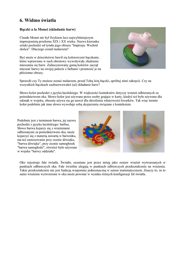 6. Widmo światła Bączki a la Monet (składanie barw) Claude Monet nie był fizykiem lecz najwybitniejszym impresjonistą przełomu XIX i XX wieku. Nazwa kierunku sztuki pochodzi od tytułu jego obrazu "Impresja. Wschód słońca". Dlaczego został malarzem? Być może w dzieciństwie bawił się kolorowymi bączkami, które wprawione w ruch obrotowy wywoływały złudzenie mieszania się barw. Zafascynowany gamą kolorów zaczął mieszać barwy na swojej palecie z farbami i przenosić je na płócienne obrazy. Sprawdź czy Ty możesz zostać malarzem, przed Tobą leżą bączki, spróbuj nimi zakręcić. Czy na wszystkich bączkach zaobserwowałeś (aś) składanie barw? Słowo kolor pochodzi z języka łacińskiego. W większości kontekstów dotyczy wrażeń odbieranych za pośrednictwem oka. Słowo kolor jest używane przez osoby grające w karty, kiedyś też było używane dla odznak w wojsku, obecnie używa się go nawet dla określenia właściwości kwarków. Tak więc termin kolor podobnie jak inne słowa wywołuje sobą skojarzenia związane z kontekstem. Podobnie jest z terminem barwa, jej nazwa pochodzi z języka łacińskiego: barbus. Słowo barwa kojarzy się z wrażeniami odbieranymi za pośrednictwem oka, może kojarzyć się z materią zawartą w barwniku, ma też zastosowanie przy ocenie dźwięku, "barwa dźwięku", przy ocenie samogłosek "barwa samogłoski", również było używane w wojsku "barwy oddziału". Oko rejestruje fale światła. Światło, oceniane jest przez mózg jako zestaw wrażeń wytwarzanych w punktach odbiorczych oka. Fale świetlne ulegają w punktach odbiorczych przekształceniu na wrażenia. Takie przekształcenie nie jest funkcją wzajemnie jednoznaczną w sensie matematycznym. Znaczy to, że to samo wrażenie wytworzone w oku może powstać w wyniku różnych konfiguracji fal światła. Składanie kolorów (składanie barw) Eksperyment służy do wyjaśnienia pojęcia składania addytywnego. Jest to realizowane przez użycie płaskiego źródła światła, arkusza cienkiego kartonu z trzema otworami, z filtrem w każdym otworze (czerwony, zielony i niebieski) oraz trzech luster. Doświadczenie pokazuje w jaki sposób można otrzymać każdy kolor używając tylko trzech kolorów o właściwym natężeniu. Jeśli ustawi się karton w płaszczyźnie źródła światła otrzyma się trzy barwne promienie. Za pomocą trzech luster można rzucać je na biały ekran. Teraz można na różne sposoby nakładać trzy kolory (zobacz ilustracje); w szczególności należy odnotować, że jeśli nałoży się na siebie wszystkie trzy kolory podstawowe otrzyma się światło "białe". CZERWONY + ZIELONY + NIEBIESKI = BIAŁY CZERWONY + ZIELONY = ŻÓŁTY ZIELONY + NIEBIESKI = JASNO NIEBIESKI NIEBIESKI + CZERWONY = KARMAZYNOWY Model RGB to jeden z pierwszych praktycznych modeli przestrzeni kolorów zawierający receptę dla tworzenia barw. Ten model w sposób jawny wyłonił się w czasach narodzin telewizji (lata 1908 i następne). Jest to model wynikający z właściwości odbiorczych oka i opiera się na fakcie, że wrażenia prawie wszystkich barw w oku można wywołać przez zmieszanie w ustalonych proporcjach tylko trzech wybranych wiązek światła o odpowiednio dobranej szerokości widma. Do dziś w oparciu o ten model pracują lampy obrazowe - kineskopy. Pomimo tego, że sam sygnał telewizji kolorowej jest oparty o zupełnie inny sposób kodowania kolorów (dla telewizji jest kilka takich sposobów). W modelu RGB identyfikacją barwy jest trójka składowych (r, g, b), (Red - czerwony, Green - zielony, Blue - niebieski). Pojedyncza składowa to liczba proporcjonalna do intensywności wiązki fal odpowiadającej danej składowej. Równoczesne wyemitowanie trzech wiązek reprezentujących składowe w odpowiednich proporcjach energii, może spowodować wrażenie odpowiadające prawie światłu białemu - wrażeniu odbioru emisji przybliżonej do pełnego widma z odcinka fal od 400 nm do 700 nm. Natomiast wyemitowanie równoczesne takich trzech wiązek w inaczej dobranych proporcjach może wywołać w oku powstanie wrażeń innych barw. Światło białe złożone jest z nieskończonej ilości fal różniących się częstotliwością (długością fali), i aby wytworzyć w oku wrażenie światła białego wiązki nie mogą być pojedynczymi falami monochromatycznymi lub wiązkami takich fal (na przykład światło lasera). Muszą to być wiązki światła o dobranej szerokości widma. Filtrowanie światła (składanie barw) Zapewne widziałeś (aś) w jaki sposób otrzymuje się barwne światło w teatrze przy pomocy filtrów barwnych. Filtr przepuszcza światło o określonym kolorze. A co się stanie, jeżeli puścimy przefiltrowane światło przez filtr o innej barwie? Sprawdź jakiego koloru światło przepuści układ dwóch filtrów, a co się stanie jeżeli na drodze światła białego umieścimy trzy filtry? Do dyspozycji masz trzy filtry o różnych kolorach: C - cyjan (ang. Cyan) M - madżenta (ang. Magenta) Y - żółty (ang. Yellow). Od pierwszych liter użytych barw powstała nazwa zestawu podstawowych kolorów (CMY) farb drukarskich stosowanych powszechnie w druku kolorowym, w poligrafii i metodach pokrewnych (materiały barwiące w drukarkach komputerowych, urządzeniach xero itp.). Na zestaw tych kolorów mówi się również barwy procesowe (kolor i barwa w jęz. polskim to synonimy). CMY jest jednym z trybów koloru w pracy z grafiką komputerową. Człowiek używa nazwy dla barwy farby tak jak ją widzi. Powierzchnia farby odbija światło z otoczenia i to odbite światło daje wrażenie nazywane barwą farby. Różnica pomiędzy światłem białym a światłem NIE odbitym: Składowe koloru powstałe z takiej różnicy nazwano literami: CMY, ponieważ z analizy tego modelu w naturalny sposób wynikają przyjęte barwy podstawowe i są one lokalizowane na osi długości fal mniej więcej pomiędzy barwami podstawowymi z modelu RG