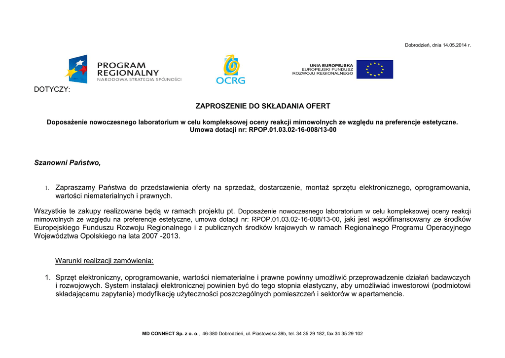 Dobrodzień, dnia 14.05.2014 r. DOTYCZY: ZAPROSZENIE DO SKŁADANIA OFERT Doposażenie nowoczesnego laboratorium w celu kompleksowej oceny reakcji mimowolnych ze względu na preferencje estetyczne. Umowa dotacji nr: RPOP.01.03.02-16-008/13-00 Szanowni Państwo, 1. Zapraszamy Państwa do przedstawienia oferty na sprzedaż, dostarczenie, montaż sprzętu elektronicznego, oprogramowania, wartości niematerialnych i prawnych. Wszystkie te zakupy realizowane będą w ramach projektu pt. Doposażenie nowoczesnego laboratorium w celu kompleksowej oceny reakcji mimowolnych ze względu na preferencje estetyczne, umowa dotacji nr: RPOP.01.03.02-16-008/13-00, jaki jest współfinansowany ze środków Europejskiego Funduszu Rozwoju Regionalnego i z publicznych środków krajowych w ramach Regionalnego Programu Operacyjnego Województwa Opolskiego na lata 2007 -2013. Warunki realizacji zamówienia: 1. Sprzęt elektroniczny, oprogramowanie, wartości niematerialne i prawne powinny umożliwić przeprowadzenie działań badawczych i rozwojowych. System instalacji elektronicznej powinien być do tego stopnia elastyczny, aby umożliwiać inwestorowi (podmiotowi składającemu zapytanie) modyfikację użyteczności poszczególnych pomieszczeń i sektorów w apartamencie. MD CONNECT Sp. z o. o., 46-380 Dobrodzień, ul. Piastowska 39b, tel. 34 35 29 182, fax 34 35 29 102 2. Podstawowe wymagania dotyczące poszczególnych elementów całego systemu przedstawia poniższa specyfikacja: Lp. 1 Rodzaj Model społecznostatystyczny preferencji estetycznych Typ Opracowanie wartości niematerialnych i prawnych - Główne parametry Narzędzie niezbędne do prowadzenia reprezentatywnych badań populacji klientów wg grup wieku, rodzajów mebli, województw, zamożności klientów, wielkością gospodarstw domowych Ilość 1 Szczegółowy opis przedmiotu zamówienia: Opracowany model powinien odnosić się do trendów dla następujących grup mebli takich jak: meble tapicerowane wypoczynkowe, meble do salonu i jadalni, meble do sypialni, meble kuchenne, zabudowy, meble młodzieżowe, inne . Model ma wskazać trendy rynkowych w odniesieniu do Potencjału zakupowego rynku polskiego oraz jego dynamiki według województw. Potencjał typu miejsca dokonywania zakupów, Potencjału zakupowego według grup wiekowych respondentów, Potencjału zakupowego według grup zamożności respondentów, Potencjału zakupowego według wielkości gospodarstw domowych Wszystkie wskazane zagadnienia mają być rozpatrywane względem 7 wskazanych wyżej grup mebli. Okres analiz powinien obejmować lata 2012-2014, dane do opracowania modelu powinny być zbierane metodą CATI, face-to-face, w domach respondentów, realizowane na grupach reprezentatywnych. Model ma uwzględniać zaproponowanie i określenie stopnia przydatności narzędzi do segmentacji grup klientów względem preferencji estetycznych. W zakresie zamówienia jest opracowanie narzędzi umożliwiających identyfikację preferencji estetycznych klienta w badaniach marketingowych. Określenie stopnia korelacji pomiędzy przewidywanymi preferencjami a wyborem dokonywanym na podstawie zdjęć. Oszacowanie ilościowe i potencjału gospodarstw domowych w poszczególnych grupach preferencji estetycznych. Dane zbierane metodą CATI, Face to-face, w domach respondentów. Forma i termin wykonania Realizacja powinna nastąpić w podziale na dwa etapy. I ETAP Opracowanie narzędzi do wykonania społeczno-statystycznego modelu preferencji estetycznych, w tym wykonanie: analizy społecznych podstaw dokonywania wyboru mebli i urządzania mieszkania, scenariusz wywiadu pogłębionego, autorskie narzędzie MD CONNECT Sp. z o. o., 46-380 Dobrodzień, ul. Piastowska 39b, tel. 34 35 29 182, fax 34 35 29 102 badań preferencji na podstawie wyboru zdjęć, dobór materiału zdjęciowego do analiz, ankieta badania ogólnopolskiego . II Etap Zbieranie danych i opracowanie wyników. Realizacja wywiadów na próbach celowych i fokusowych, realizacja ankiet na próbach reprezentatywnych ogólnopolskich, analiza wyników podejmowanych decyzji na podstawie materiału zdjęciowego. Zestawianie tabel, testowanie zależności, obliczenie korelacji. Zaproponowanie narzędzi i określenie stopnia przydatności do segmentacji grup klientów względem preferencji estetycznych. Przygotowanie przekazanie raportu końcowego. Przekazanie wyników opracowania powinno nastąpić w formie raportu zawierającego tabele i wykresy wraz z komentarzem, przekazanie danych źródłowych z badań, udzielenie licencji na dalszą dystrybucję na rzecz podmiotów trzecich. Oferty można składać osobiście w siedzibie firmy MD CONNECT Spółka z o. o. (pod adresem: ul. Piastowska 39B; 46-380 Dobrodzień) lub przesyłać pocztą do dnia 28 maja 2014 r. do godz. 15.00 (o ważności oferty decyduje data wpływu oferty do firmy MD CONNECT Spółka z o. o.). Oferty, jakie wpłyną po tej dacie, uznaje się za nieważne. Informujemy, że przegląd ofert i wybór wykonawcy odbędzie się w siedzibie firmy MD CONNECT Spółka z o. o., pod adresem: ul. Piastowska 39B; 46-380 Dobrodzień, w dniu 29 maja 2014 r. o godz. 9.00. Rozstrzygnięcie porównania ofert ma charakter ostateczny, zaś od wyników przeprowadzonego przez MD CONNECT Sp. z o. o. postępowania ofertowego nie przysługuje droga odwoławcza. 1. 2. 3. 4. Oferta powinna zawierać: Cenę opracowania modelu Okres ważności oferty (nie krótszą niż 90 dni) Terminy realizacji zadania Warunki płatności. Za ważne uznaje się wyłącznie oferty kompletne, zawierające pełen zakres niniejszego zapytania ofertowego. Nie dopuszcza się niniejszym możliwości składania ofert cząstkowych. Kryteria oceny złożonych ofert będą następujące: MD CONNECT Sp. z o. o., 46-380 Dobrodzień, ul. Piastowska 39b, tel. 34 35 29 182, fax 34 35 29 102 1. Cena 2. Termin realizacji 3. Warunki płatności 70% 20% 10% Osobą upoważnioną do udzielania informacji w zakresie prowadzonego postępowa