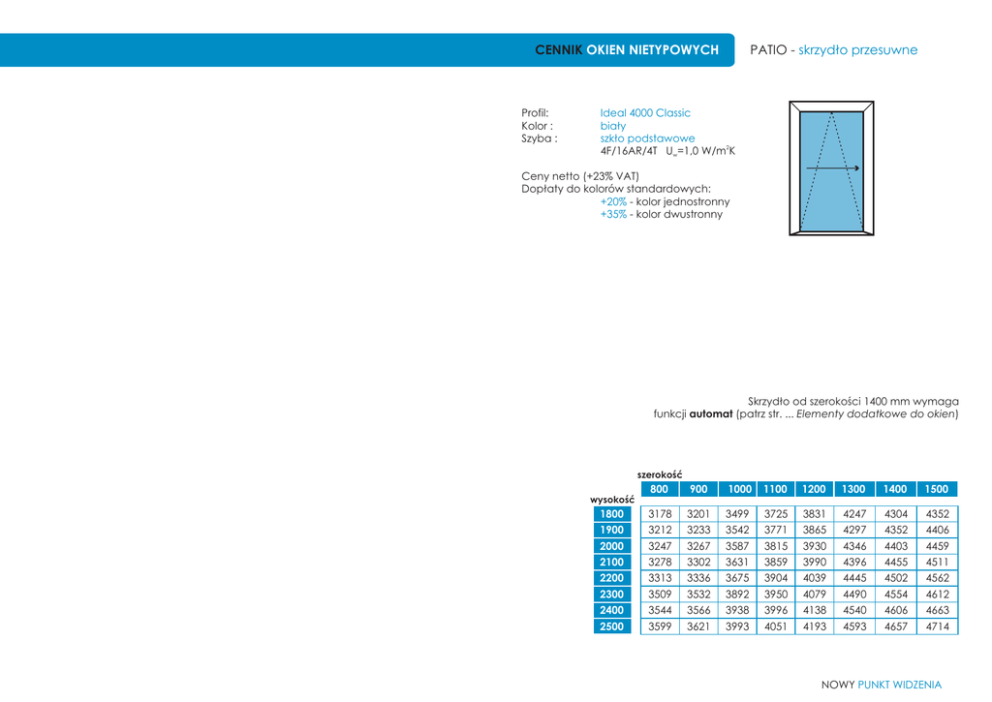 CENNIK OKIEN NIETYPOWYCH Profil: Kolor : Szyba : PATIO - skrzydło przesuwne Ideal 4000 Classic biały szkło podstawowe 4F/16AR/4T Uw=1,0 W/m2K Ceny netto (+23% VAT) Dopłaty do kolorów standardowych: +20% - kolor jednostronny +35% - kolor dwustronny Skrzydło od szerokości 1400 mm wymaga funkcji automat (patrz str. ... Elementy dodatkowe do okien) szerokość 800 900 1000 1100 1200 1300 1400 1500 1800 3178 3201 3499 3725 3831 4247 4304 4352 1900 3212 3233 3542 3771 3865 4297 4352 4406 2000 3247 3267 3587 3815 3930 4346 4403 4459 2100 3278 3302 3631 3859 3990 4396 4455 4511 2200 3313 3336 3675 3904 4039 4445 4502 4562 2300 3509 3532 3892 3950 4079 4490 4554 4612 2400 3544 3566 3938 3996 4138 4540 4606 4663 2500 3599 3621 3993 4051 4193 4593 4657 4714 wysokość NOWY PUNKT WIDZENIA
