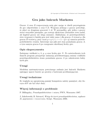 r Copyright by P.Kościelniak, J.Ombach and J.Szczepański Gra jako łańcuch Markowa Gracze A oraz B rozpoczynają serię gier mając w chwili przystąpienia do gry odpowiednio a oraz b zł. Wygrana jednego z graczy powoduje, że płaci on drugiemu graczowi 1 zł. W przypadku, gdy jeden z graczy straci wszystkie pieniądze, gra zostaje skończona (formalnie trwa nadal, ale kapitał graczy nie ulega zmianie). Zakładamy, że prawdopodobieństwo wygranej w każdej grze jest takie samo i dla gracza A wynosi p, dla gracza B wynosi q, przy czym p + q ¬ 1. r = 1 − (p + q) oznacza prawdopodobieństwo remisu. Interesuje nas jaki jest stan posiadania gracza A, a tym samym gracza b po rozegraniu określonej liczby gier. Opis eksperymentu Zadajemy wielkości a, b, p, q oraz liczbę gier N . Po zatwierdzeniu tych danych program przygotuje animację przedstawiającą zmiany rozkładu prawdopodobieństwa stanu posiadania gracza A po zakończeniu kolejnych gier. Uwagi Modelem matematycznym powyższego zadania jest łańcuch Markowa opisujący spacer losowy po prostej z barierami pochłaniającymi. Uwagi techniczne Ze względu na ograniczoną pamięć komputera należy pamiętać, aby iloczyn abN nie był zbyt duży. Więcej informacji o problemie P. Billingsley, Prawdopodobieństwo i miara, PWN, Warszawa 1987. J. Jakubowski, R. Sztencel, Wstęp do teorii prawdopodobieństwa, wydanie II, poprawione i rozszerzone, Script, Warszawa 2006. 1 J. Ombach, Rachunek prawdopodobieństwa wspomagany komputerowo Maple, UJ, Kraków 2000. Jerzy Ombach, Marcin Mazur,Rachunek Prawdopodobieństwa i statystyka, http://wazniak.mimuw.edu.pl, 2006. 2