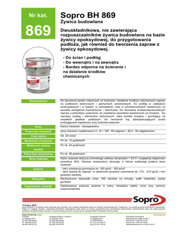 Sopro BH 869 Nr kat. 869 Żywica budowlana Dwuskładnikowa, nie zawierająca rozpuszczalników żywica budowlana na bazie żywicy epoksydowej, do przygotowania podłoża, jak również do tworzenia zapraw z żywicy epkosydowej. - Do ścian i podłóg - Do wewnątrz i na zewnątrz - Bardzo odporna na ścieranie i na działanie środków chemicznych Do tworzenia bardzo odpornych na ścieranie i działanie środków chemicznych zapraw na podłożach betonowych i jastrychach cementowych. Do podłóg w zakładach przemysłowych i w halach, w warsztatach, oraz w pomieszczeniach narażonych na wysokie obciążenia mechaniczne i chemiczne. Do tworzenia wodoprzepuszczalnych zapraw o jednolitym uziarnieniu do osadzania oporników kamiennych na mostach. Do naprawy podłóg i elementów betonowych. Jako środek sczepny i gruntujący na wszelkich gładkich podłożach. Do tworzenia fug zabezpieczających przed podciąganiem kapilarnym przy budowie basenów. Zastosowania Kolory miodowe - transparentne Kolor Proporcje mieszania (przy ilościach cząstkowych) A : B = 100 : 50 wagowo / 89,3 : 50 objętościowo Ok. 30 minut Czas użycia Możliwość chodzenia Po ok. 12 godzinach Możliwość dalszej Po ok. 24 godzinach obróbki Pełna faza twardnienia Po ok. 48 godzinach Dane czasowe Dane czasowe dotyczą normalnego zakresu temperatur + 23°C i względnej wilgotności powietrza 50%. Wyższe temperatury skracają, a niższe wydłużają podane dane czasowe Zużycie - Jako substancja gruntująca ok. 250 g/m2 - 350 g/m2 - Jako żywica do zapraw, w zależności grubości uziarnienia ok. 170 - 210 g/m2 i mm grubości warstwy. Narzędzia Mechaniczne mieszadło (max. 300 obrotów na minutę), wałki malarskie, packa gumowa Czyszczenie narzędzi Każdorazowo podczas przerwy w pracy narzędzia należy umyć przy pomocy rozpuszczalnika. Sopro 2005 Dane zawarte w niniejszej ulotce stanowią opis produktu. Są to ogólne wskazówki oparte na naszych doświadczeniach i badaniach i nie odnoszą się do konkretnych zastosowań. Dążąc do ciągłego rozwoju i ulepszania produktów zastrzegamy sobie prawo do zmiany parametrów bez uprzedniego informowania. Prezentowane dane nie mogą stanowić podstawy do jakichkolwiek roszczeń. W razie potrzeby prosimy zwrócić się do naszego Działu Doradztwa Technicznego. Sopro Polska Sp. z o.o. Centrala ul. Poleczki 23/F 02-822 Warszawa tel. 022 335 23 00 fax 022 335 23 09 Sprzedaż Północ i Centrum ul. Poleczki 21/E 02-822 Warszawa tel. 022 335 23 22 fax 022 335 23 23 Sprzedaż Południe ul. Mogilska 40 31-546 Kraków tel. 0/12 410 58 50 fax 0/12 411 08 04 www.sopro.pl Doradztwo techniczne Warszawa tel. 0 606 14 58 11 Gliwice tel. 0 602 28 10 40 Poznań tel. 0 604 27 49 60 Sitkówka/Nowiny tel. 0 602 44 44 91 Składowanie W oryginalnym zamkniętym opakowaniu, w suchym miejscu, ok. 1 rok Opakowania Wiaderko 24 kg (16 kg komponent A + 8 kg komponent B); Wiaderko 12 kg (opakowanie kombi); Wiaderko 5kg (opakowanie kombi); puszka 1 kg Właściwości Żywica budowlana Sopro BH służy do tworzenia bardzo odpornych na ścieranie i na działanie środków chemicznych zapraw, do stosowania na podłogi betonowe i jastrychy cementowe, oraz do przygotowania podłoży trudnych. Szczególnie zalecana przy dużych obciążeniach, na przykład w przemyśle chemicznym, w mleczarniach, browarach itp.Odporna na wodę, wietrzenie i mróz, dzięki czemu nadaje się do zastosowania na zewnątrz i wewnątrz. Do tworzenia fug zabezpieczających przed podciąganiem kapilarnym w obiektach basenowych. Wysokie bezpieczeństwo stosowania w pomieszczeniach wilgotnych. Nadaje się do mieszania z dodatkami o różnej grubości uziarnienia, a zatem może być stosowana do zapraw grubo-i cienkowarstwowych. Przygotowanie podłoża Przed zastosowaniem powierzchnia musi być czysta, sucha i nośna. Należy oczyścić ja z oleju, tłuszczu, starych powłok, starych zapraw cementowych i innych zabrudzeń drobinkami i włóknami. Odporność na zrywanie przygotowanego podłoża betonowego musi wynosić przynajmniej 1,0 N/mm3. (ustalić za pomocą odpowiedniego urządzenia do prób rozciągania, prędkość rozciągania 100 N/s) Wilgotność betonu na powierzchni musi wynosić < 4 Cm - %. (Pomiar urządzeniem CM) Sposób użycia Komponent A i komponent B (Utwardzacz) są dostarczane w odpowiednich proporcjach. Komponent B należy w całości przesypać do komponentu A, a następnie dokładnie wymieszać za pomocą odpowiedniego mieszadła mechanicznego (max. 300 obrotów na minutę) aż do uzyskania jednolitej konsystencji, ok. 2 - 3 minuty. Należy dokładnie rozmieszać materiał przy ściankach i na dnie pojemnika tak, aby utwardzacz został równomiernie rozprowadzony we wszystkich kierunkach. Po wymieszaniu przelać do czystego pojemnika i jeszcze raz dokładnie wymieszać. Zasadniczo poleca się wymieszany materiał natychmiast rozłożyć na powierzchni, ponieważ dzięki temu jest on dłużej jest zdatny do użytku. Nanosić poprzez nakładanie pędzlem, wałkiem lub natryskiem. Wskazówki szczególne: Pokrywanie powierzchni w obszarach zewnętrznych poleca się przy opadających temperaturach, aby uniknąć tworzenia się pęcherzyków w podłożu poprzez parowania powietrze. Żywica Sopro BH po związaniu jest bezpieczna fizjologicznie. Wskazówki BHP Znak: F wysoce łatwopalny Składnik A Znak: Xi drażniący Składniki niebezpieczne: - metakrylan metylu 2,2 - dimetakrylan dioksydietylu Zwroty zagrożenia: - R 36/37/38 działa drażniąco na oczy, drogi oddechowe i skórę Sopro 2005 Dane zawarte w niniejszej ulotce stanowią opis produktu. Są to ogólne wskazówki oparte na naszych doświadczeniach i badaniach i nie odnoszą się do konkretnych zastosowań. Dążąc do ciągłego rozwoju i ulepszania produktów zastrzegamy sobie prawo do zmiany parametrów bez uprzedniego informowania. Prezentowane dane nie mogą stanowić podstawy do jakichkolwiek roszczeń. W razie potrzeby prosimy zwrócić się do na