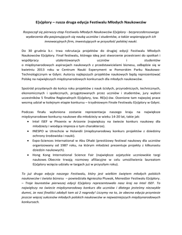 E(x)plory – rusza druga edycja Festiwalu Młodych Naukowców Rozpoczął się pierwszy etap Festiwalu Młodych Naukowców E(x)plory - bezprecedensowego wydarzenia dla pasjonujących się nauką uczniów i studentów, a także wspierających ich innowacyjnych firm, inwestujących w przyszłość polskiej nauki. Do 30 grudnia b.r. trwa rekrutacja projektów do drugiej edycji Festiwalu Młodych Naukowców E(x)plory. Finał festiwalu, którego ideą jest stworzenie przestrzeni do spotkań i współpracy utalentowanych uczniów i studentów o międzynarodowych aspiracjach naukowych z przedstawicielami biznesu, odbędzie się w kwietniu 2013 roku w Centrum Nauki Experyment w Pomorskim Parku NaukowoTechnologicznym w Gdyni. Autorzy najlepszych projektów naukowych będą reprezentować Polskę na największych międzynarodowych konkursach dla młodych naukowców. Spośród przysłanych do końca roku projektów z nauk ścisłych, przyrodniczych, technicznych, ekonomicznych i społecznych, przygotowanych przez uczniów i studentów, jury wyłoni uczestników 5 finałów Regionalnych E(x)plory, tzw. RE(x)-ów. Ocenione tam najwyżej prace wezmą udział w kolejnym etapie konkursu – trzydniowym Finale Festiwalu E(x)plory w Gdyni. Podczas finału wyłoniona zostanie reprezentacja naszego kraju na największe międzynarodowe konkursy naukowe dla młodzieży w wieku 14-20 lat, takie jak: • Intel ISEF w Phoenix w Arizonie (największy na świecie konkurs naukowy dla młodzieży i wiodąca impreza o tym charakterze). • INESPO w Utrechcie w Holandii (międzynarodowy konkurs projektów z dziedziny ochrony środowiska i nauki). • Expo-Sciences International w Abu Dhabi (prestiżowy festiwal naukowy dla uczniów organizowany od 1987 roku, na którym młodzież prezentuje projekty z kilkunastu dziedzin naukowych). • Hong Kong International Science Fair (największe azjatyckie uczniowskie targi naukowe. Obecnie trwają rozmowy afiliacyjne w celu umożliwienia laureatom E(x)plory wzięcia udziału w targach już w przyszłym roku). To już druga edycja naszego Festiwalu, który jest wielkim świętem młodych polskich naukowców i świata biznesu – powiedziała Agnieszka Pluwak, Menedżer Festiwalu E(x)plory. – Troje laureatów pierwszej edycji E(x)plory reprezentowało nasz kraj na Intel ISEF. To największy na świecie międzynarodowy konkurs dla uczniów i dlatego jesteśmy niezwykle dumni, że nasi finaliści zdobyli tam aż 2 nagrody! Liczymy na to, że obecna edycja przyniesie jeszcze więcej sukcesów młodych polskich naukowców w najważniejszych międzynarodowych konkursach. Festiwal E(x)plory to jednak nie tylko konkurs dla młodych naukowców. To także platforma współpracy dla świata nauki i biznesu. Firmy, które włączą się w projekt E(x)plory, będą mogły zaprezentować szerokiej publiczności swoje projekty i innowacyjne rozwiązania podczas Targów naukowo - technologicznych, organizowanych w trakcie finału w Gdyni. Dodatkowo otrzymają możliwość nawiązania współpracy z młodymi naukowcami, oferując najzdolniejszym z nich staże w swoich działach R&D. Chcemy, aby Festiwal E(x)plory był wydarzeniem, które pozwala najbardziej innowacyjnym firmom działającym w Polsce wspierać najbardziej utalentowanych młodych polskich naukowców. To szansa, aby pokazać jak odkrycia naukowe przekładają się na biznes, na konkretne produkty czy rozwiązania. Zarówno uczestnicy konkursu jak i firmy-Partnerzy skorzystają na takim modelu współpracy – powiedziała Alicja Gierat, Koordynator Festiwalu E(x)plory. Projekty do konkursu w ramach festiwalu E(x)plory można zgłaszać poprzez platformę internetową http://www.hitechplant.com. Więcej informacji o festiwalu można znaleźć na stronie www.explory.pl. Festiwal Młodych Naukowców E(x)plory to: • konkurs młodych naukowców; • targi naukowo-technologiczne dla 30 najbardziej innowacyjnych firm, które swój sukces opierają na działach badawczo-rozwojowych; • panele dyskusyjne poświęcone popularyzacji nauki i wykorzystaniu jej osiągnięć z udziałem przedstawicieli biznesu, środowisk naukowych, dziennikarzy i przedstawicieli władz lokalnych; • warsztaty metodologiczne dla uczniów zainteresowanych prowadzeniem własnych badań naukowych; • warsztaty dydaktyczne dla nauczycieli z tworzenia interdyscyplinarnych zajęć za pomocą platformy ITAO (www.itao.edu.pl); • otwarta sesja plakatowa, podczas której projekty uczestników Festiwalu są dostępne dla publiczności; • wydarzenia około festiwalowe – laboratoria, gra kreatywna; Organizator: Fundacja Zaawansowanych Technologii (FZT) Zadaniem Fundacji jest popularyzacja polskiej i europejskiej technologii na świecie. Fundacja osiąga swoje cele poprzez wspieranie rozwoju myśli technicznej, a także transfer technologii i wdrażanie w życie innowacyjnych rozwiązań. Wspieramy kulturę innowacji poprzez szereg działań skierowanych do młodzieży, studentów, naukowców oraz popularyzatorów i pasjonatów nauki, a także poprzez wzmacnianie relacji pomiędzy władzami publicznymi, przedsiębiorstwami i sektorem edukacji. Odpowiadamy na rozwój rynku nowych technologii, jak i na potrzeby społeczno-gospodarcze XXI wieku. Fundacja działa od 2011 roku jako edukacyjne ramię funduszu zaawansowanych technologii INVESTIN, a jej pracami kieruje prezes INVESTIN w latach 2002-2007, Prof. UW Barbara Liberda. www.fzt.org.pl www.explory.pl Kontakt dla mediów: Koordynator Festiwalu E(x)plory Alicja Gierat Tel. +48 660 670 466; e-mail: [email protected]; W: www.fzt.org.pl Monday PR Łukasz Dąbrowski Tel. +48 694 921 188 e-mail: [email protected]