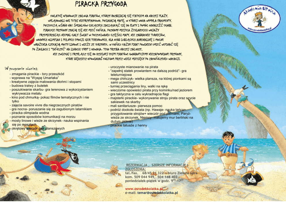 PIRACKA PRZYGODA KOŁATKĘ OPANOWUJE ZAŁOGA PIRATÓW, KTÓRZY ROZBIJAJĄ SIĘ STATKIEM NA NASZEJ PLAŻY. WYLĄDOWALI ONI TUTAJ NIEPRZYPADKOWO. POSIADAJĄ MAPĘ, W KTÓREJ WODA WYMYŁA FRAGMENTY. POSZUKUJĄ WŚRÓD NAS ŚMIAŁKÓW CHCĄCYCH ZACIĄGNĄĆ SIĘ DO FLOTY I POMÓC ODNALEŹĆ SKARB. PIRACKIE PRZYGODY ZDAJĄ SIĘ NIE MIEĆ KOŃCA. POZNAMY MIEJSCA ŻEGLARSKICH WOJAŻY PRZEMIERZAJĄC NIEMAL CAŁY ŚWIAT W POSZUKIWANIU CZĘŚCI MAPY. NIE ZABRAKNIE TURNIEJÓW, WODNYCH OLIMPIAD I PEŁNYCH EMOCJI GIER TERENOWYCH. DLA OSÓB LUBIĄCYCH ADRENALINĘ I MOCNE WRAŻENIA CZEKAJĄ MOSTY LINOWE I WIEŻE ZE SKRZYNEK- W KOŃCU KAŻDY PIRAT POWINIEN UMIEĆ WSPINAĆ SIĘ PO ŻAGLACH I “TAŃCZYĆ” NA LINACH! SPRYT I ODWAGA- TEGO TRZEBA NASZEJ ZAŁODZE. NIE ZWLEKAJ I PRZYŁĄCZ SIĘ DO DZIELNEJ EKIPY PIRATÓW! GWARANTUJEMY NIEZAPOMNIANE PRZYGODY, KTÓRE BĘDZIESZ OPOWIADAĆ KOLEGOM PRZEZ WIELE MIESIĘCY PO ZAKOŃCZENIU WAKACJI. W programie również: - zmagania pirackie - tory przeszkód - wyprawa na “Wyspę Umarlaka” - kreatywne zajęcia malowania dłońmi i stopami - budowa tratwy z butelek - poszukiwanie skarbu- gra terenowa z wykorzystaniem wykrywacza metalu - kino pod chmurką- pokaz filmów tematycznych i nie tylko - zajęcia savoire vivre dla niegrzecznych piratów - gra nocna- poruszanie się za zagubionym latarnikiem - piracka olimpiada wodna - poznanie sposobów komunikacji na morzu - mosty linowe i wieże ze skrzynek- nauka wspinania się po masztach - okrętowy wieczór gier planszowych - uroczyste mianowanie na pirata - “zapełnij statek prowiantem na dalszą podróż”- gra teleturniejowa - mega chińczyk- wielka plansza, na której pionkami są sami uczestnicy - turniej przeciągania liny, walki na rękę - wieczorne opowieści pirata przy kominku/nad jeziorem - gra taktyczna w celu wykradnięcia flagi - majsterki pirackie- wykonywanie stroju pirata oraz szycie sakiewek na skarby - mali sanitariusze- pierwsza pomoc - podróż dookoła świata (np. Hawaje- nauka tańca+ przygotowanie strojów+ wieczór pod palmami, Paryżwieża ze skrzynek, Niemcy- malujemy mur berliński na dużym płótnie) - pirackie tatuaże z henny REZERWACJA , SZERSZE INFORMACJE I ZGŁOSZENIA: tel./fax. 68/45 21 322 - biuro Zielona Góra kom. 509 044 949, 504 148 403 poniedziałek-piątek w godz. 900-1700 www.osrodekkolatka.pl e-mail: [email protected]