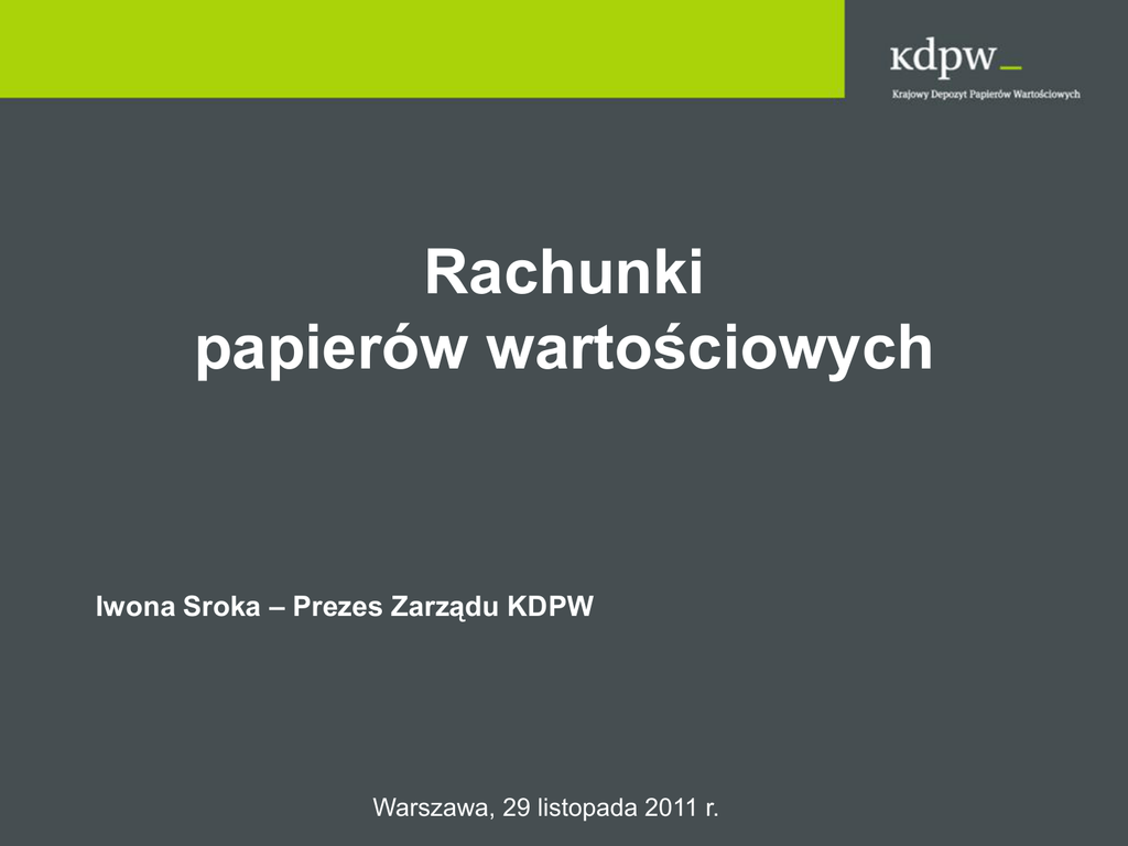 Rachunki papierów wartościowych Iwona Sroka – Prezes Zarządu KDPW Warszawa, 29 listopada 2011 r. Informacje o liczbie rachunków Co miesiąc Uczestnicy KDPW – banki i biura maklerskie – przekazują informację o liczbie prowadzonych rachunków papierów wartościowych. Krajowy Depozyt przygotowuje informację o liczbie rachunków prowadzonych przez swoich Uczestników. Dane zamieszczane są w formie komunikatu oraz szczegółowych statystyk na stronie www.kdpw.pl Liczba rachunków w latach 2004-2011 Liczba rachunków prowadzonych przez Uczestników KDPW 1 525 471 1 600 000 1 477 419 1 132 602 996 565 1 028 962 850 513 853 333 908 926 Na przestrzeni ostatnich 8 lat liczba rachunków papierów wartościowych na polskim rynku zwiększyła się blisko dwukrotnie. Na koniec października br. było ich ponad 1 mln 525 tys. 800 000 W bieżącym roku liczba rachunków zwiększyła się o 48 tys. 0 2004 2005 2006 2007 2008 2009 2010 Źródło: KDPW, na podstawie informacji przekazanych przez Uczestników. Dla lat 2004-2010 na koniec roku; dla roku 2011 – na koniec października. 2011 Największy tegoroczny miesięczny przyrost rachunków – o blisko 27 tys. – nastąpił w czerwcu, w związku z ofertą JSW. Duże prywatyzacje przyciągają nowych inwestorów Wzrost liczby rachunków inwestycyjnych przy dużych ofertach prywatyzacyjnych Wzrost liczby rachunków (tys.) Wartość oferty (mld zł) Zapisy w transzy indywidualnej (tys.) Rok JSW 26,9 5,4 168 2011 PZU 140,0 8,0 250 2010 GPW 98,5 1,2 323 2010 Tauron 82,0 4,2 230 2010 PKO BP 81,0 7,9 206 2004 PGNiG 20,0 2,6 63 2005 Spółka Źródło: KDPW, spółki. Znaczący przyrost liczby rachunków obserwowany jest zwłaszcza przy dużych prywatyzacjach. W 2010 r. – roku wielkich prywatyzacji – przybyło ich prawie 350 tys. W ostatnich latach największy przyrost liczby rachunków papierów wartościowych odnotowano przy prywatyzacji PZU. W ciągu miesiąca ich liczba wzrosła o 140 tys. Liczba rachunków w instytucjach finansowych – październik 2011 L.p. Kod 1 806 2 811 3 812 4 814 5 815 6 817 7 818 8 821 9 822 10 833 11 837 12 840 13 855 14 858 15 901 16 902 17 905 18 906 19 911 20 912 21 914 22 915 23 916 24 920 25 922 26 924 27 928 28 929 29 936 30 942 31 945 32 950 33 954 34 956 35 959 36 965 37 966 38 968 39 974 40 979 41 980 42 986 43 995 44 998 RAZEM: Uczestnik Kredyt Bank S.A. Ipopema Securities S.A. Opera DM Sp. z o.o. X-Trade Brokers DM S.A. DM Pekao Bank BPH S.A. BNP PARIBAS Securities Services S.A. Oddział w Polsce BM Alior Bank S.A. Copernicus Securities S.A. DM Banku BPS S.A. Banco Espirito Santo de Investimento, S.A. Spółka Akcyjna Oddział w Polsce Bank Gospodarstwa Krajowego PKO BP S.A. Bank Gospodarki Żywnościowej S.A. Centralny Dom Maklerski Pekao S.A. ING Securities S.A. w Warszawie Biuro Maklerskie Banku BPH S.A. Bank Millennium S.A. KBC Securities N.V. (S.A.) Oddział w Polsce DM PKO BP Dom Inwestycyjny BRE Banku S.A. Dom Maklerski BZ WBK S.A. NOBLE Securities S.A. Bank Gospodarki Żywnościowej S.A. Biuro Maklerskie Dom Maklerski Banku Handlowego S.A. Bank Handlowy S.A. Nordea Bank Polska S.A.* UniCredit CAIB Poland S.A. Raiffeisen Bank Polska S.A. Dom Maklerski AmerBrokers S.A. ING Bank Śląski S.A. Trigon DM S.A. Dom Maklerski Banku Ochrony Środowiska S.A. Millennium Dom Maklerski S.A. Erste Securities Polska S.A. Dom Maklerski BDM S.A. BM Banku DnB NORD Polska S.A. BNP PARIBAS Bank Polska S.A. Societe Generale S.A. Oddział w Polsce Bank Polska Kasa Opieki S.A. Deutsche Bank Polska S.A. BRE Bank S.A. DB Securities S.A. DM IDM S.A. Liczba rachunków 592 1 24 7 686 190 602 479 379 65 393 189 3 563 1 3 1 749 71 215 604 57 388 30 756 6 729 10 541 139 958 296 084 128 896 24 202 30 837 9 205 14 368 4 306 197 3 685 3 219 106 889 52 934 62 367 229 30 869 7 904 12 225 4 849 301 1 892 5 563 8 726 1 525 471 Liczba rachunków na innych rynkach Centralne depozyty papierów wartościowych przyjęły dwa modele rozwiązań w stosunku do zbierania informacji o liczbie rachunków papierów wartościowych swoich uczestników. Niektóre depozyty, jak KDPW, otrzymują raporty dotyczące liczby rachunków prowadzonych przez swoich uczestników (np. Litwa, Łotwa, Estonia, Finlandia). Inne – nie zbierają takich informacji. Rachunki papierów wartościowych – porównanie międzynarodowe Liczba rachunków w wybranych depozytach (w tys.) 1600 1517 1200 1200 800 468 400 255 127 41 126 66 0 Źródło: ECSDA na podstawie danych depozytów. Dane na koniec 2010 r. Krajowy Depozyt Papierów Wartościowych Dział ds. Korporacyjnych Tel. 22-537-91-29 www.kdpw.pl 8