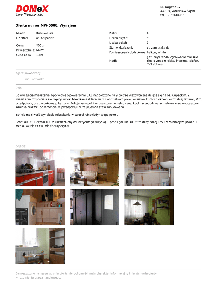 ul. Targowa 12 44-300, Wodzisław Śląski tel. 32 750-84-67 Oferta numer MW-5688, Wynajem Miasto: Bielsko-Biała Piętro: 9 Dzielnica: os. Karpackie Liczba pięter: 9 Cena: 800 zł Liczba pokoi: 3 Stan wykończenia: do zamieszkania Powierzchnia: 64 m2 Cena za m2: 13 zł Pomieszczenia dodatkowe: balkon, winda Media: gaz, prąd, woda, ogrzewanie miejskie, ciepła woda miejska, internet, telefon, TV kablowa Agent prowadzący: Imię i nazwisko: Opis: Do wynajęcia mieszkanie 3-pokojowe o powierzchni 63,8 m2 położone na 9 piętrze wieżowca znajdujące się na os. Karpackim. Z mieszkania rozpościera sie piękny widok. Mieszkanie składa się z 3 oddzielnych pokoi, odzielnej kuchni z oknem, oddzielnej łazienki, WC, przedpokoju, oraz widokowego balkonu. Pokoje sa w pełni wyposażone i umeblowana, kuchnia zabudowana meblami oraz wyposażona, łazienka oraz WC po remoncie, w przedpokoju duża pojemna szafa zabudowana. Istnieje mozliwość wynajęcia mieszkania w całości lub pojedynczego pokoju. Cena: 800 zł + czynsz 600 zł (uzależniony od faktycznego zużycia) + prąd i gaz lub 300 zł za duży pokój i 250 zł za mniejsze pokoje + media, kaucja to dwumiesięczny czynsz. Zdjęcia: Zamieszczone na naszej stronie oferty nieruchomości mają charakter informacyjny i nie stanowią oferty w rozumieniu prawa handlowego.