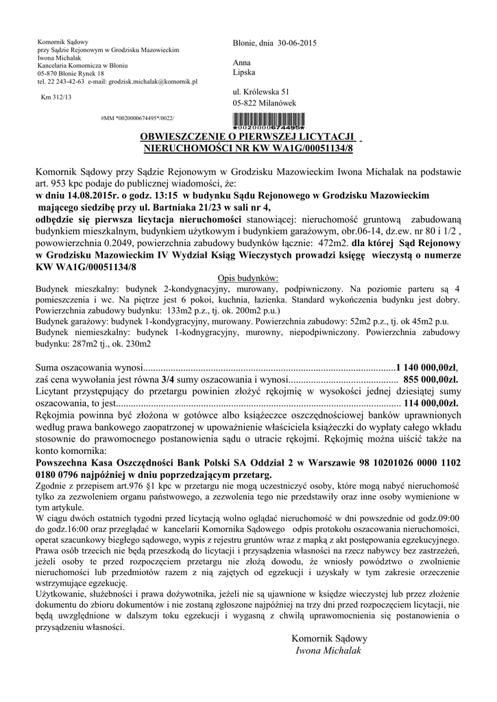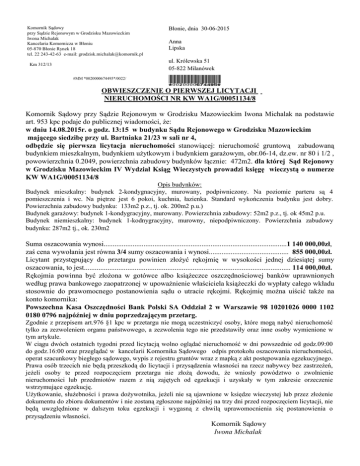 Komornik Sądowy przy Sądzie Rejonowym w Grodzisku Mazowieckim Iwona Michalak Kancelaria Komornicza w Błoniu 05-870 Błonie Rynek 18 tel. 22 243-42-63 e-mail: [email protected] Błonie, dnia 30-06-2015 Anna Lipska ul. Królewska 51 05-822 Milanówek Km 312/13 #MM *0020000674495*/0022/ *0020000674495* OBWIESZCZENIE O PIERWSZEJ LICYTACJI NIERUCHOMOŚCI NR KW WA1G/00051134/8 Komornik Sądowy przy Sądzie Rejonowym w Grodzisku Mazowieckim Iwona Michalak na podstawie art. 953 kpc podaje do publicznej wiadomości, że: w dniu 14.08.2015r. o godz. 13:15 w budynku Sądu Rejonowego w Grodzisku Mazowieckim mającego siedzibę przy ul. Bartniaka 21/23 w sali nr 4, odbędzie się pierwsza licytacja nieruchomości stanowiącej: nieruchomość gruntową zabudowaną budynkiem mieszkalnym, budynkiem użytkowym i budynkiem garażowym, obr.06-14, dz.ew. nr 80 i 1/2 , powowierzchnia 0.2049, powierzchnia zabudowy budynków łącznie: 472m2. dla której Sąd Rejonowy w Grodzisku Mazowieckim IV Wydział Ksiąg Wieczystych prowadzi księgę wieczystą o numerze KW WA1G/00051134/8 Opis budynków: Budynek mieszkalny: budynek 2-kondygnacyjny, murowany, podpiwniczony. Na poziomie parteru są 4 pomieszczenia i wc. Na piętrze jest 6 pokoi, kuchnia, łazienka. Standard wykończenia budynku jest dobry. Powierzchnia zabudowy budynku: 133m2 p.z., tj. ok. 200m2 p.u.) Budynek garażowy: budynek 1-kondygracyjny, murowany. Powierzchnia zabudowy: 52m2 p.z., tj. ok 45m2 p.u. Budynek niemieszkalny: budynek 1-kodnygracyjny, murowny, niepodpiwniczony. Powierzchnia zabudowy budynku: 287m2 tj., ok. 230m2 Suma oszacowania wynosi.....................................................................................................1 140 000,00zł, zaś cena wywołania jest równa 3/4 sumy oszacowania i wynosi............................................ 855 000,00zł. Licytant przystępujący do przetargu powinien złożyć rękojmię w wysokości jednej dziesiątej sumy oszacowania, to jest.................................................................................................................. 114 000,00zł. Rękojmia powinna być złożona w gotówce albo książeczce oszczędnościowej banków uprawnionych według prawa bankowego zaopatrzonej w upoważnienie właściciela książeczki do wypłaty całego wkładu stosownie do prawomocnego postanowienia sądu o utracie rękojmi. Rękojmię można uiścić także na konto komornika: Powszechna Kasa Oszczędności Bank Polski SA Oddział 2 w Warszawie 98 10201026 0000 1102 0180 0796 najpóźniej w dniu poprzedzającym przetarg. Zgodnie z przepisem art.976 §1 kpc w przetargu nie mogą uczestniczyć osoby, które mogą nabyć nieruchomość tylko za zezwoleniem organu państwowego, a zezwolenia tego nie przedstawiły oraz inne osoby wymienione w tym artykule. W ciągu dwóch ostatnich tygodni przed licytacją wolno oglądać nieruchomość w dni powszednie od godz.09:00 do godz.16:00 oraz przeglądać w kancelarii Komornika Sądowego odpis protokołu oszacowania nieruchomości, operat szacunkowy biegłego sądowego, wypis z rejestru gruntów wraz z mapką z akt postępowania egzekucyjnego. Prawa osób trzecich nie będą przeszkodą do licytacji i przysądzenia własności na rzecz nabywcy bez zastrzeżeń, jeżeli osoby te przed rozpoczęciem przetargu nie złożą dowodu, że wniosły powództwo o zwolnienie nieruchomości lub przedmiotów razem z nią zajętych od egzekucji i uzyskały w tym zakresie orzeczenie wstrzymujące egzekucję. Użytkowanie, służebności i prawa dożywotnika, jeżeli nie są ujawnione w księdze wieczystej lub przez złożenie dokumentu do zbioru dokumentów i nie zostaną zgłoszone najpóźniej na trzy dni przed rozpoczęciem licytacji, nie będą uwzględnione w dalszym toku egzekucji i wygasną z chwilą uprawomocnienia się postanowienia o przysądzeniu własności. Komornik Sądowy Iwona Michalak Do wiadomości: 1. Anna Lipska, 05-822 Milanówek 2. Roman Lipski, 05-822 Milanówek 3. Santander Consumer Bank S.A. UP Wrocław, 50-950 Wrocław 4. ZUS III Oddział w Warszawie Inspektorat w Pruszkowie, 05-800 Pruszków 5. Sąd Rejonowy w Grodzisku Mazowieckim I Wydział Cywilny, 05-825 Grodzisk Mazowiecki 6. Sąd Rejonowy w Grodzisku Mazowieckim Wydział Administracyjny, 05-825 Grodzisk Mazowiecki 7. Naczelnik Urzędu Skarbowego w Grodzisku Mazowieckim, 05-825 Grodzisk Mazowiecki 8. Naczelnik Urzędu Skarbowego w Grodzisku Mazowieckim Dział Finansowy, 05-825 Grodzisk Mazowiecki 9. Urząd Miasta Milanówka Dział Finansowy, 05-822 Milanówek 10. Urząd Miasta Milanówka Dział Administracyjny, 05-822 Milanówek 11. Naczelnik Urzędu Skarbowego w Grodzisku Mazowieckim (wierzyciel hipoteczny), 05-825 Grodzisk Mazowiecki 12. Urząd Miasta Milanówka (wierzyciel hipoteczny), 05-822 Milanówek 13. Santander Consumer Bank S. A. (wierzyciel hipoteczny), 50-950 UP Wrocław 68 14. a/a